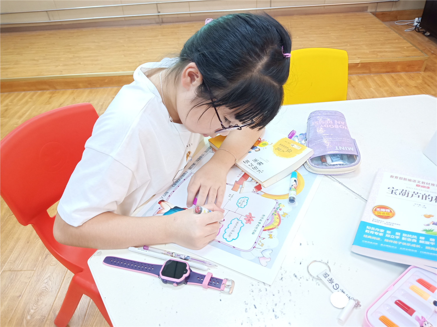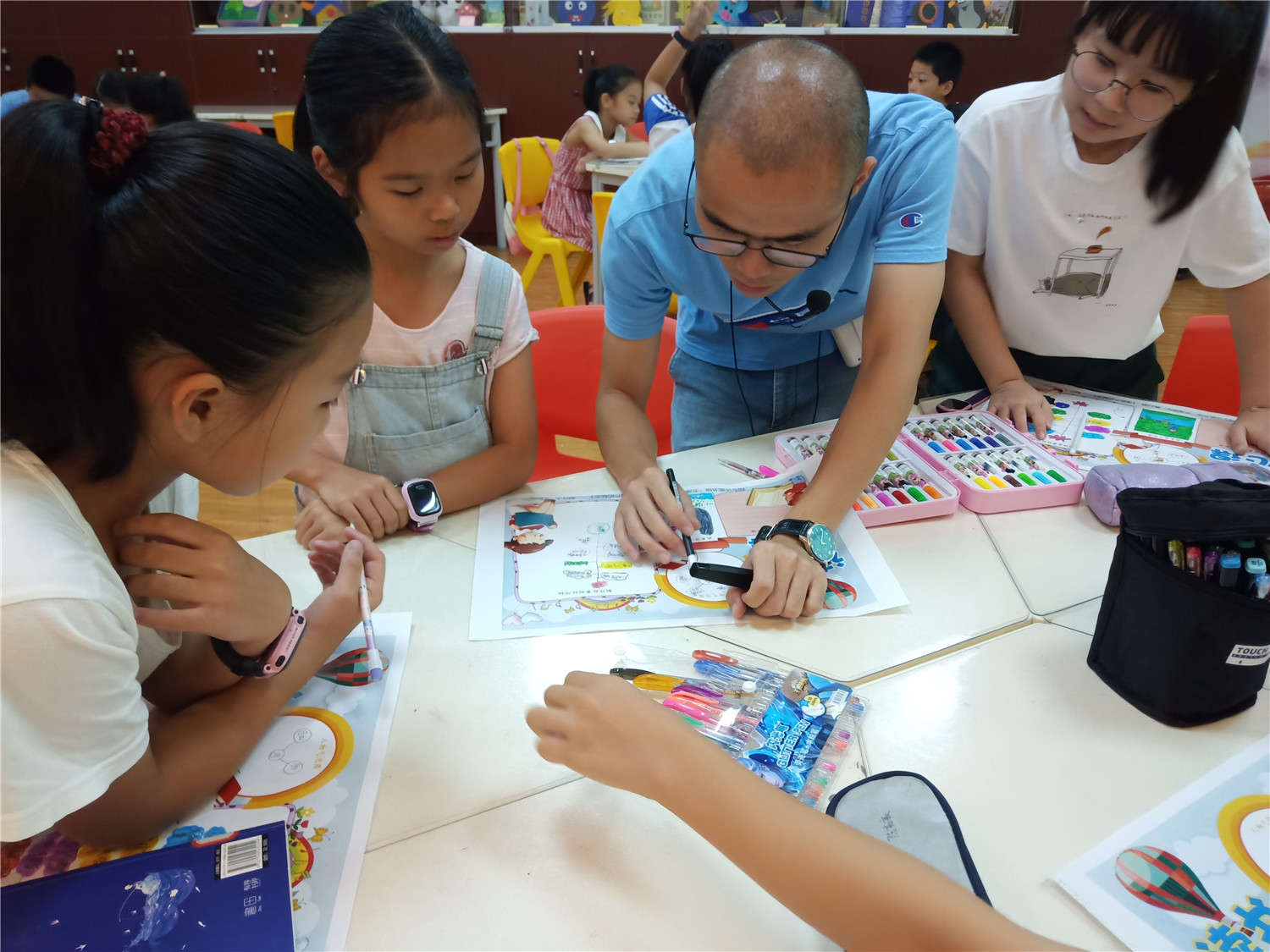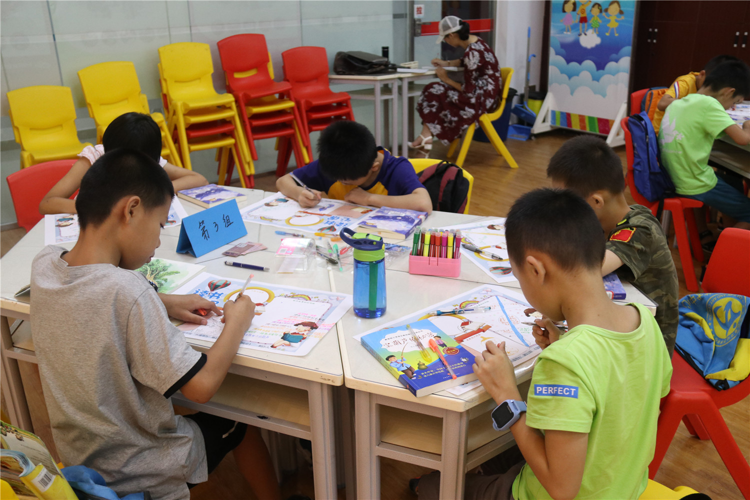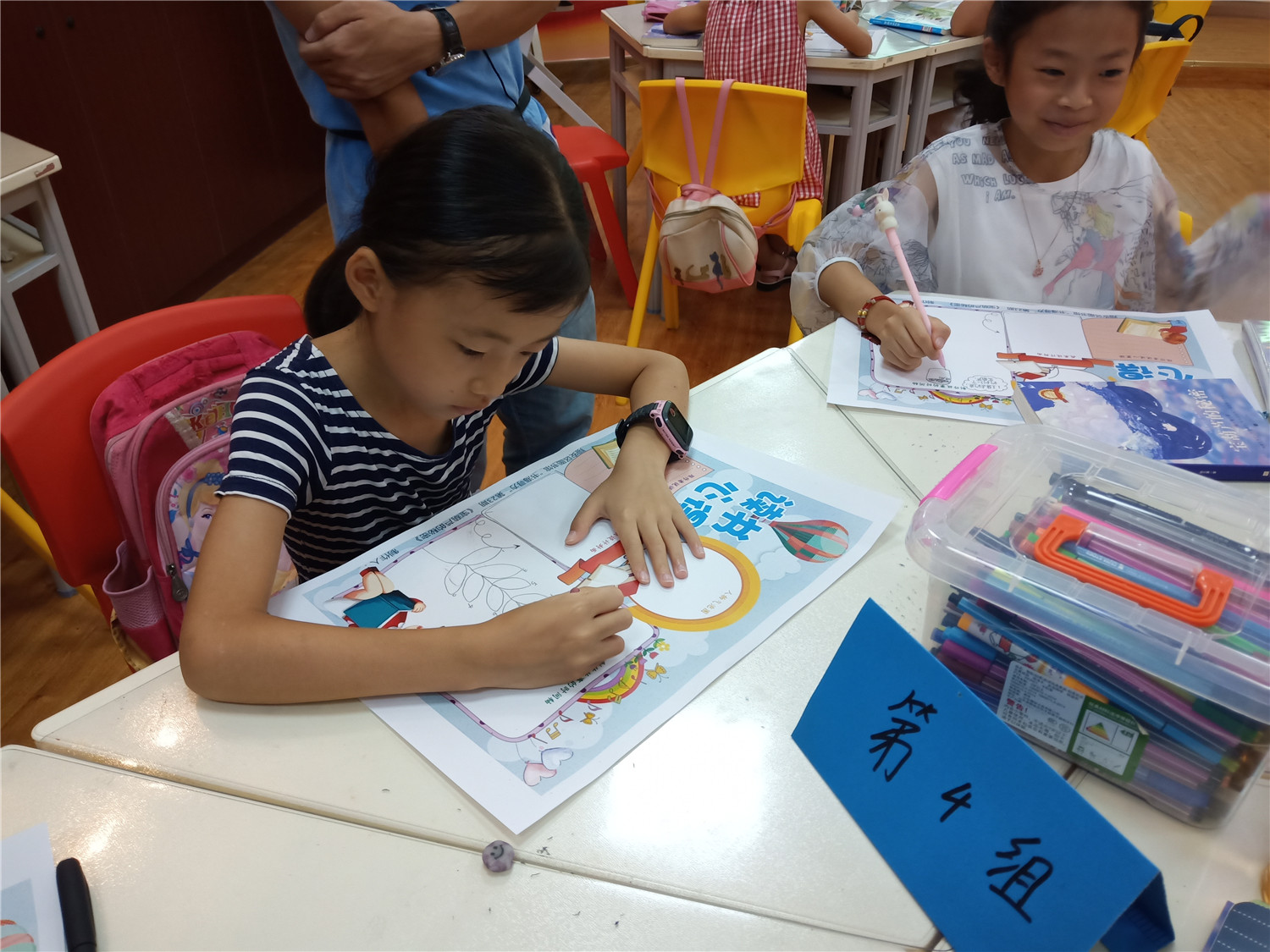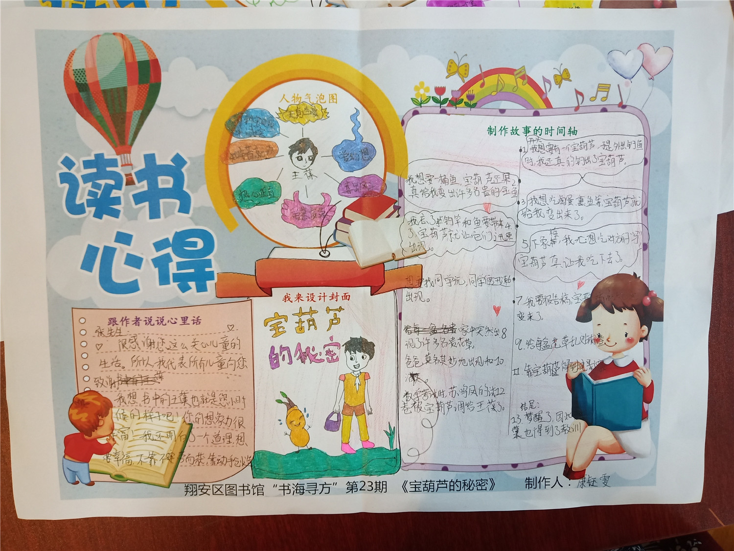 在介绍完本书的封面信息后,我们以手抄报的形式贯穿整个共读过程,完成对本书重要内容的精读。首先,我们进行了分组学习,旨在锻炼小读者的合作能力。然后,领读老师依次引导大家归纳每个章节的内容,梳理出故事情节线;接着,我们让小读者分享印象最深刻的情节,并引向封面的设计。最后,领读老师通过“角色大猜想”的方式,激发小读者对主人公的探讨,从而完成“人物气泡图”,再以提问题的形式,围绕“人物气泡图”,进入本书的主题探讨,让小读者们明白:不劳而获并不会带来快乐!