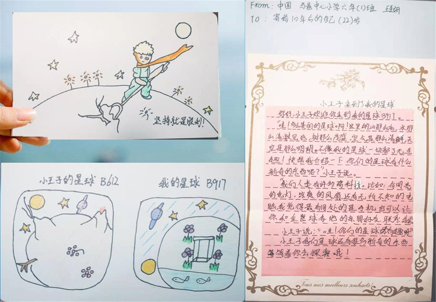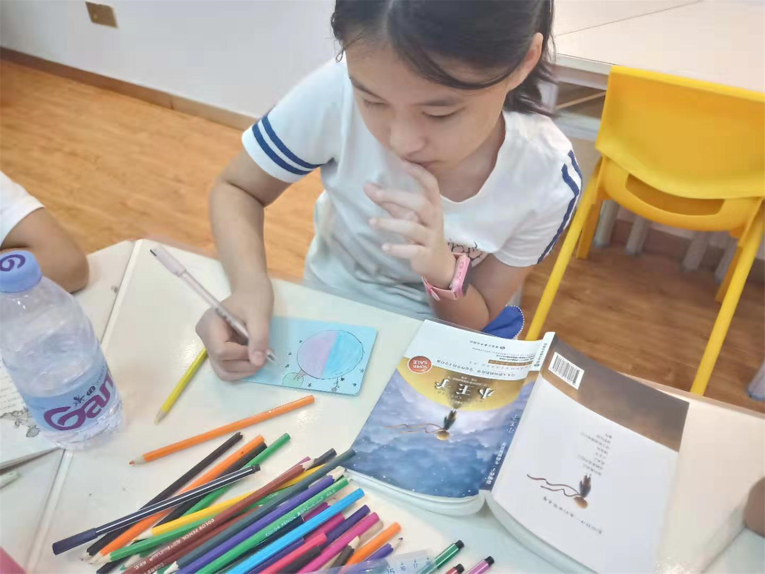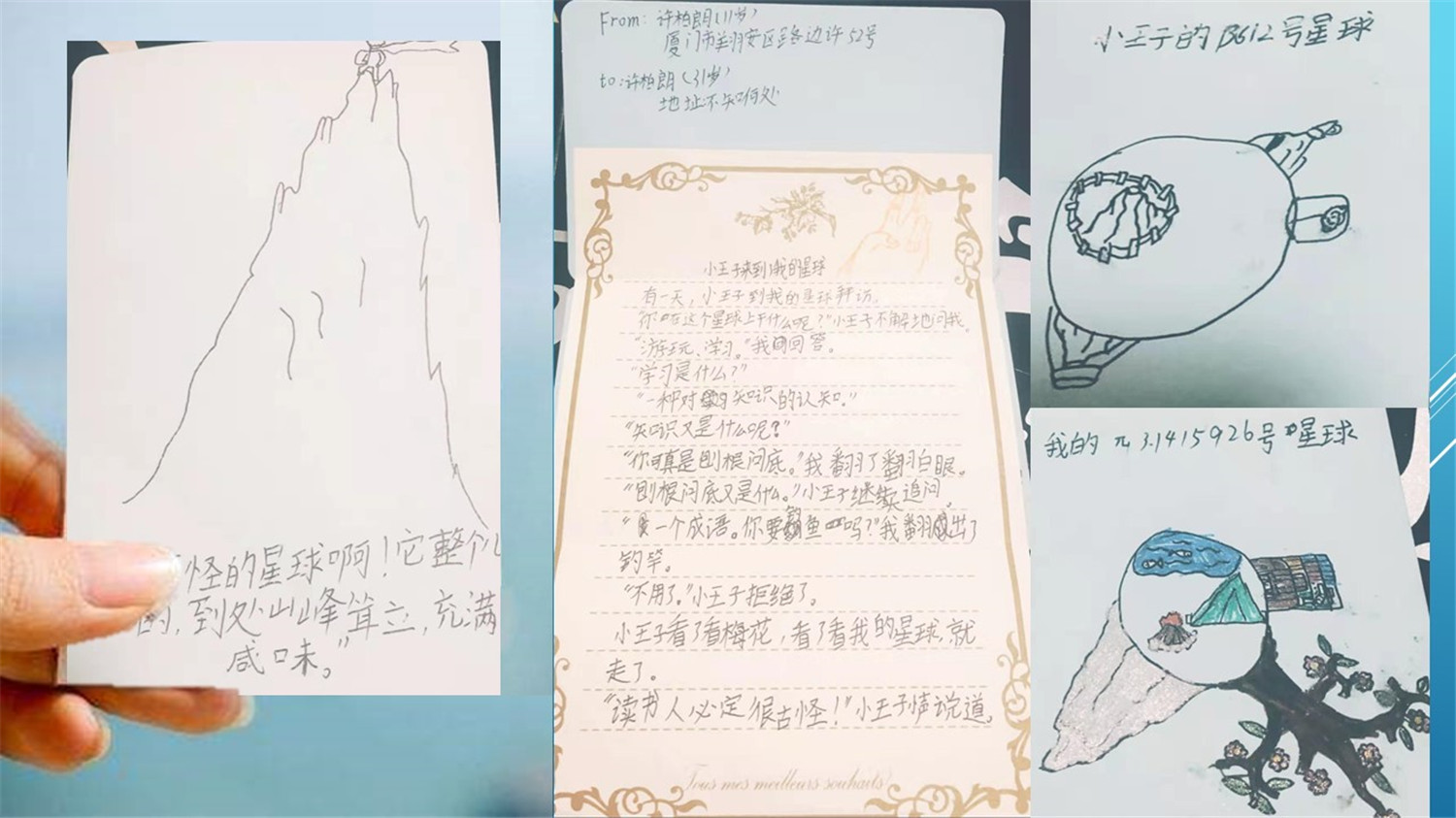 读书会的最后一个小时,领读老师给每人发放了精心准备的空白明信片,让大家DIY:画下书中印象最深的场景,摘录一段最富有哲理的话语,并创编一个“小王子来到了我的星球”的小故事,小读者们都极其用心,无论是图还是文都深深寄托着大家对小王子的喜爱之情。自此,《小王子》这本书终于被我们所驯养。