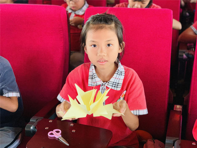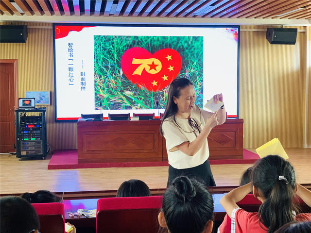 香橼老师首先通过绘本《红孩子》向同学们介绍了峥嵘岁月里的英雄少年,让他们感受烽火硝烟中的智慧和勇气。手工书制作环节,老师指导他们以庆祝中华人民共和国成立70周年的“70”字样为主题制作“一颗红心”手工书。