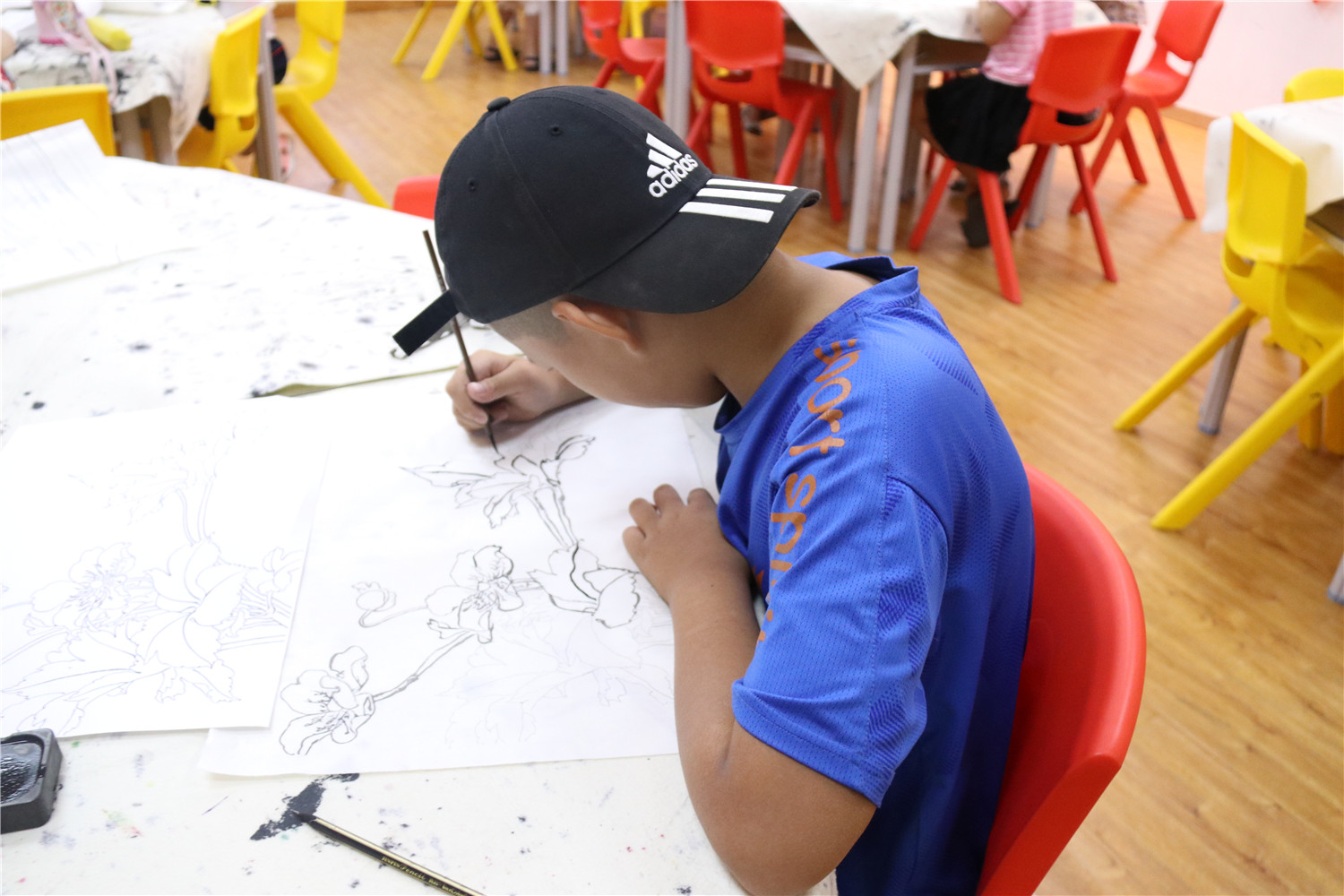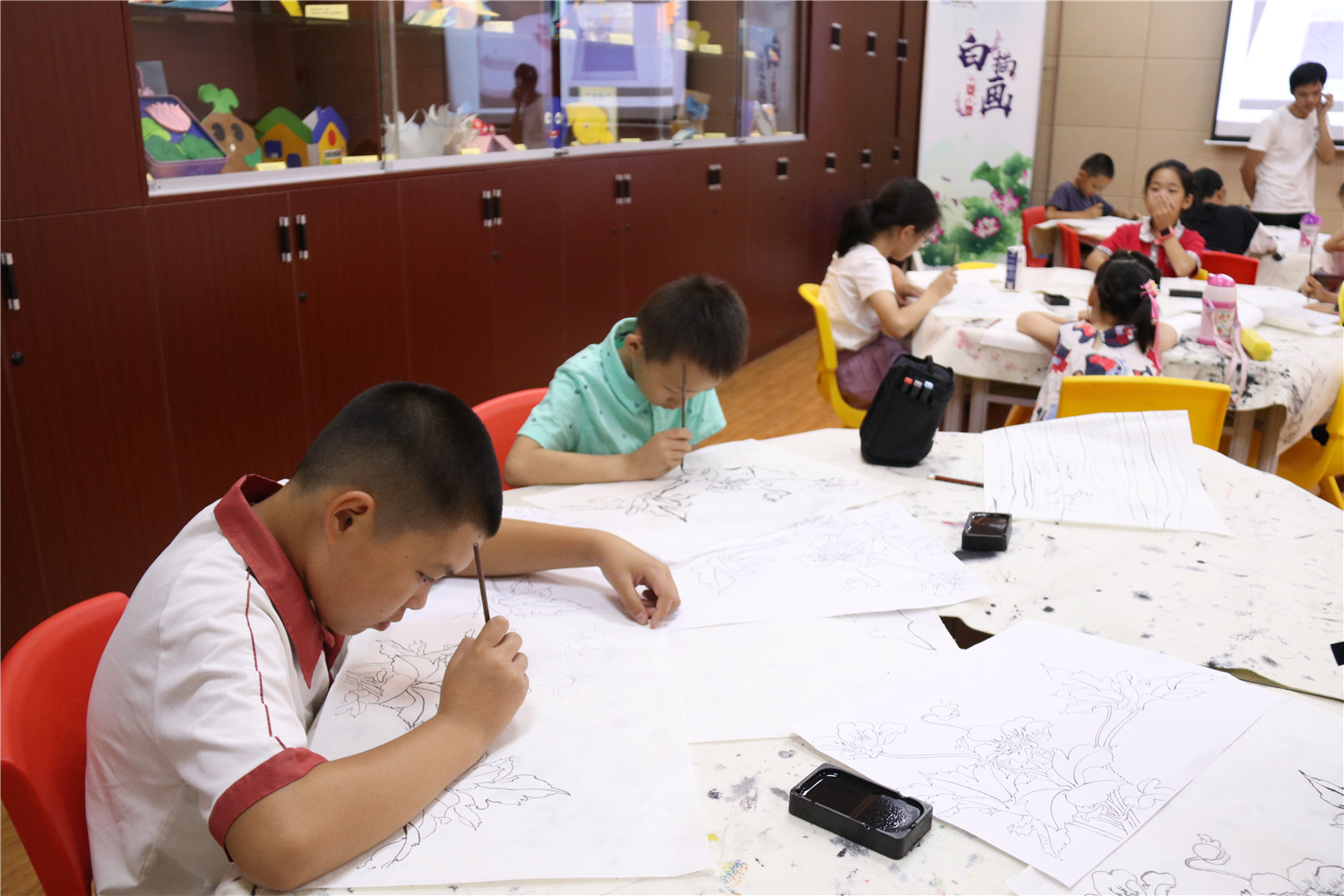 课堂以较为复杂的花卉白描为绘画内容,引导小读者通过描图、勾线的等方式完成各自的白描作品。最后,老师点评了小读者的绘画作品,评选出较为优秀的6幅白描画,为这些小读者赠送“翔安红色记忆”系列连环画作为奖励。