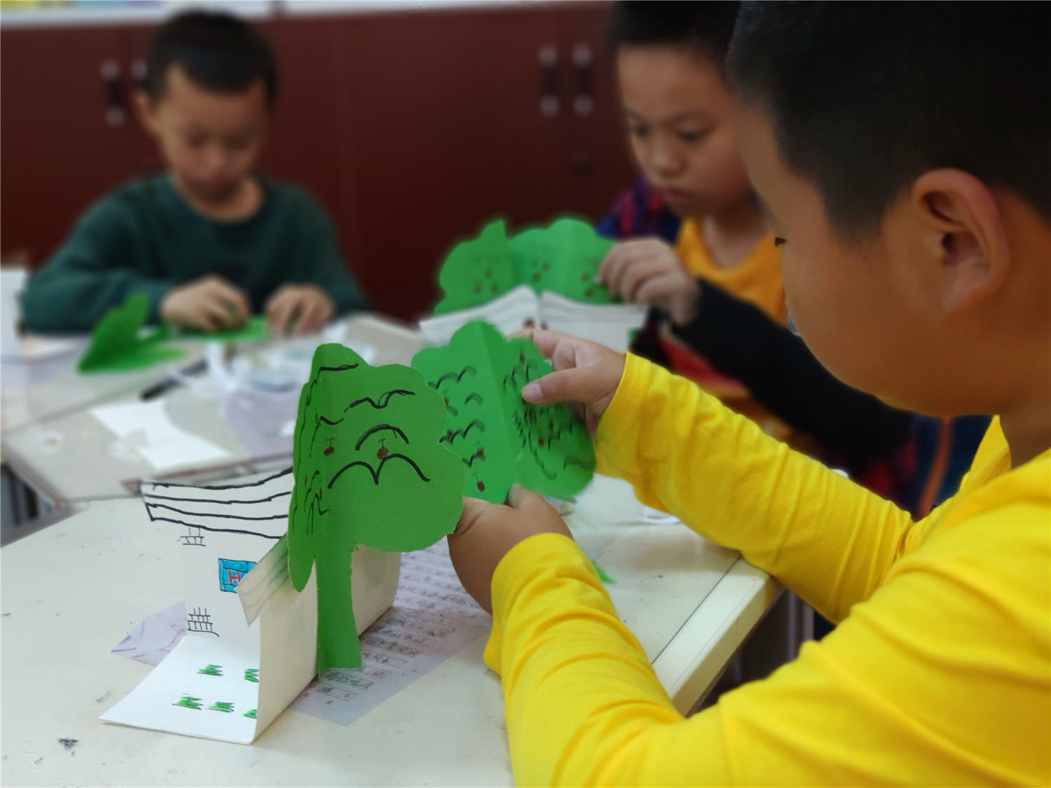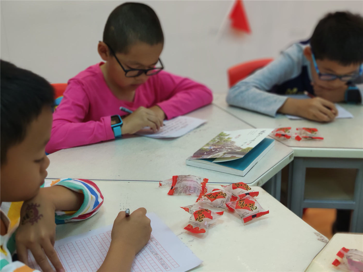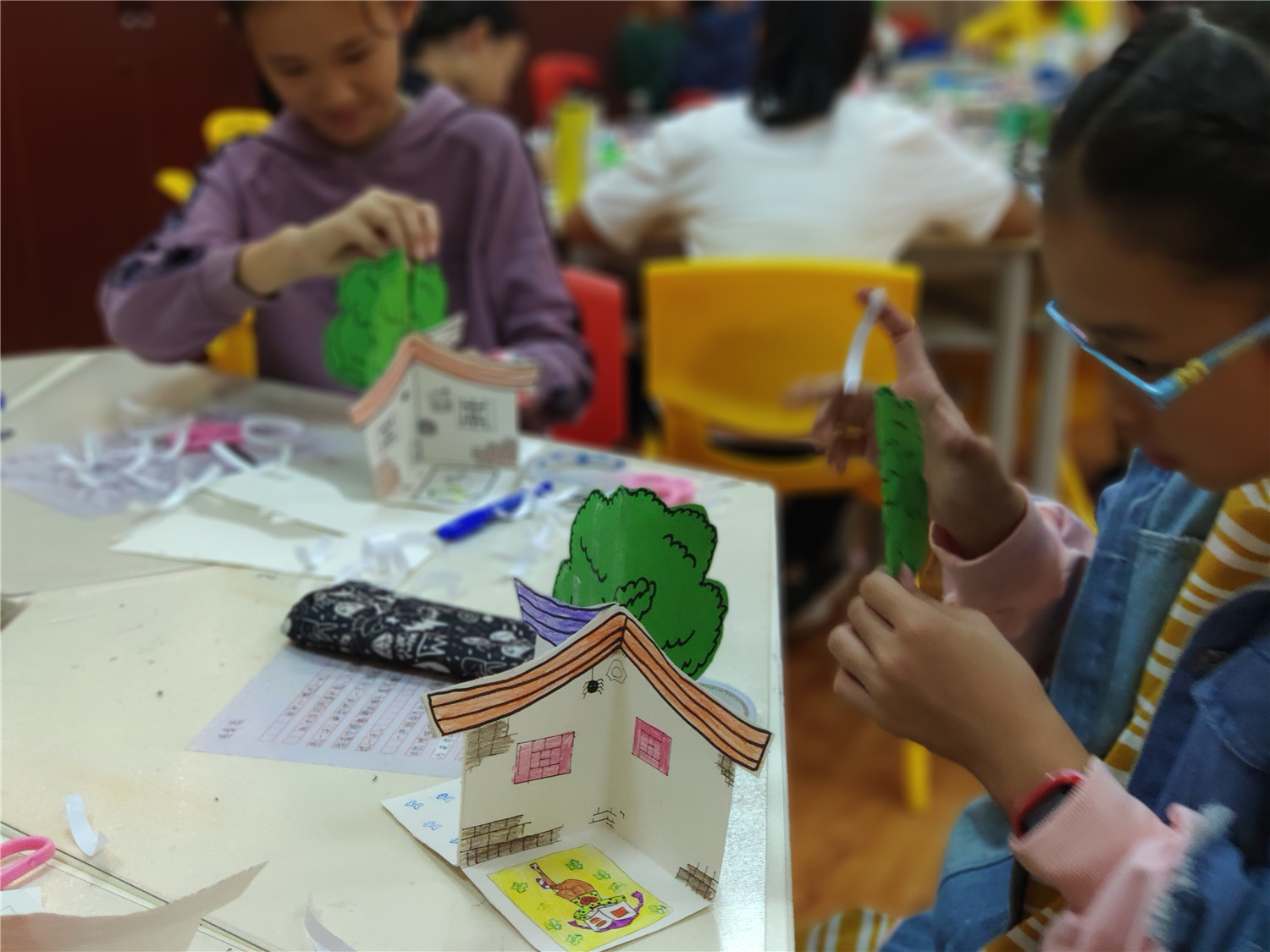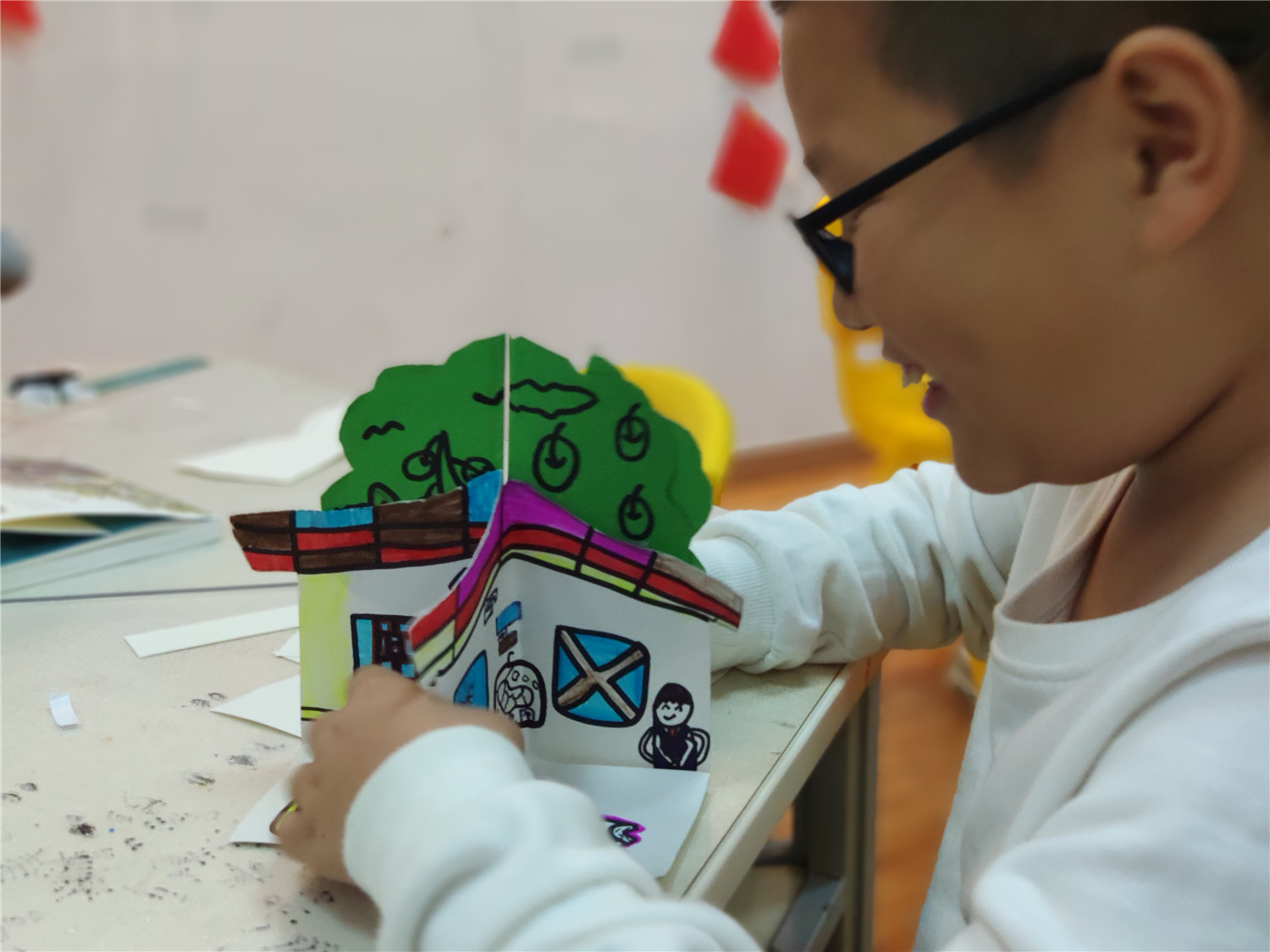 本期“智绘书”活动,香橼老师首先向小读者们介绍了五官联动的写作方法,并从《花猫三丫上房了》这本书入手,教他们学会用好“眼、耳、鼻”,加上心理描写来写好作文;而后进行同步作文《我和XXX过一天》的撰写,老师还对他们的作文做了现场批改和点评;手工书制作环节,老师指导他们制作惟妙惟肖的立体“花猫三丫上房了”智绘书。
