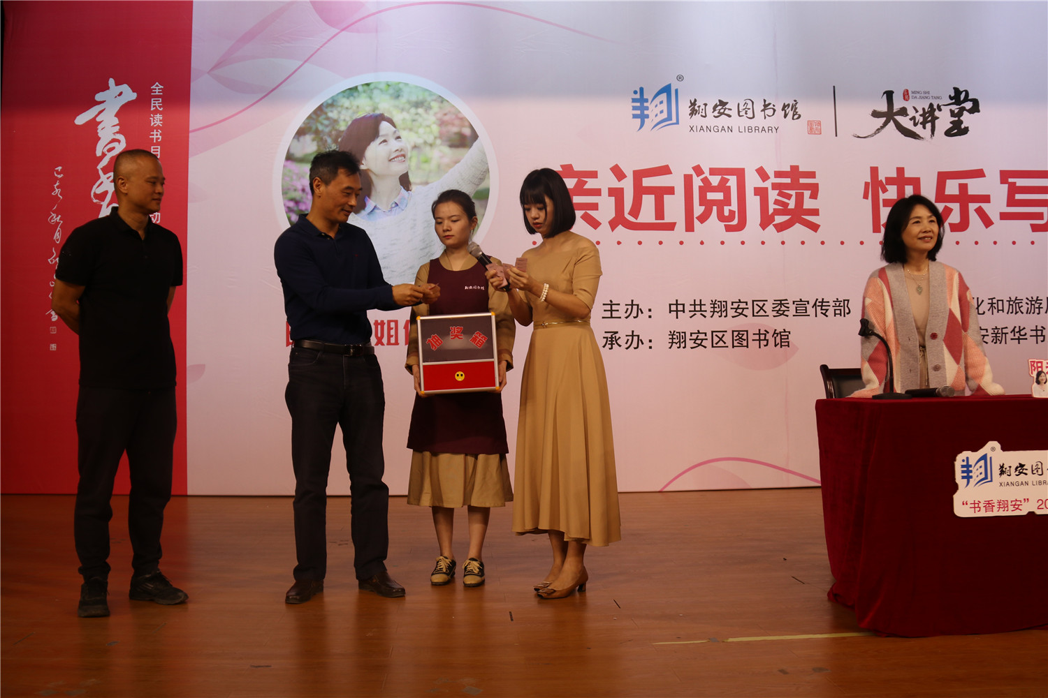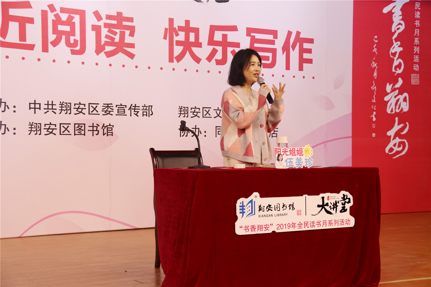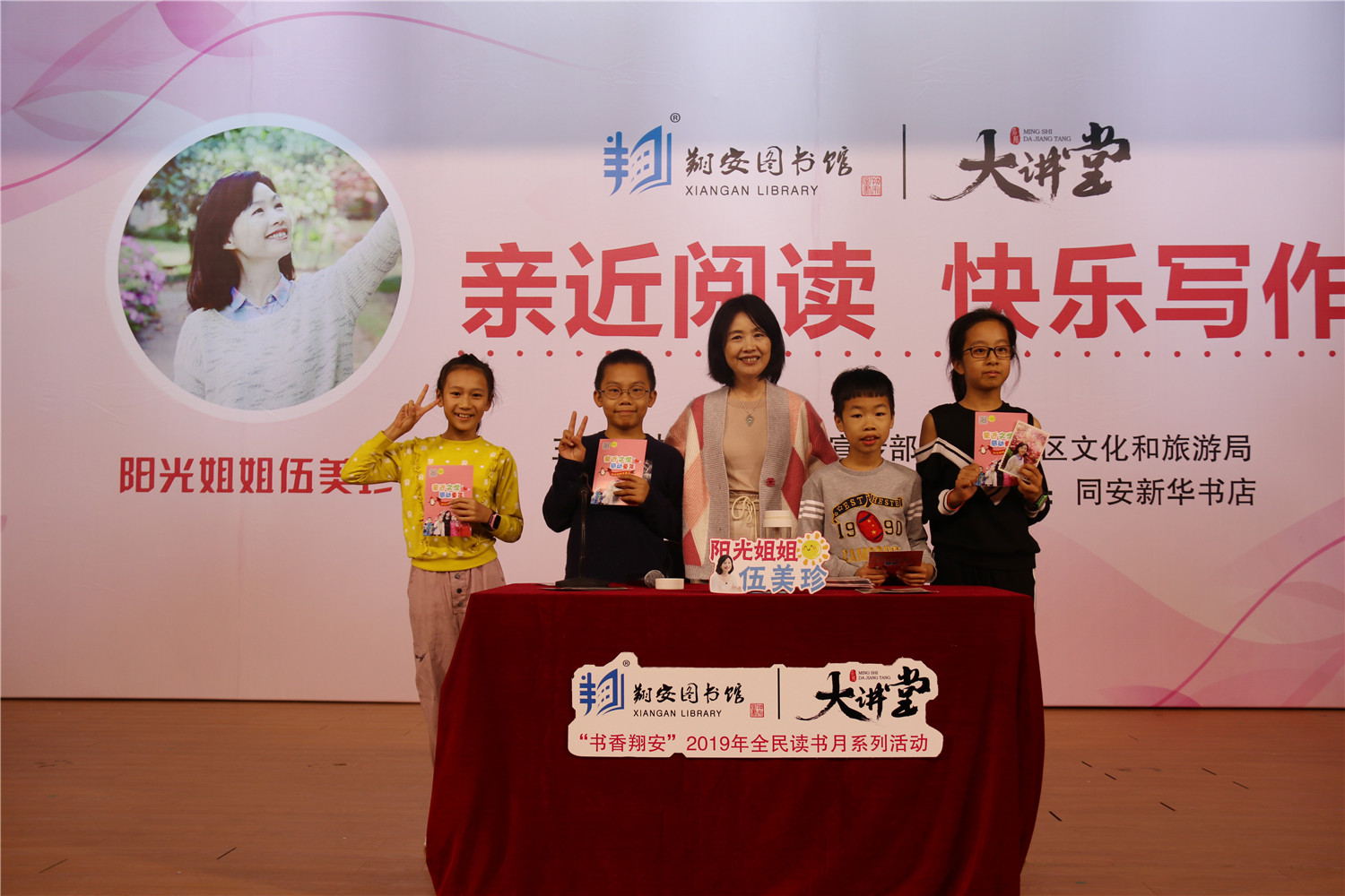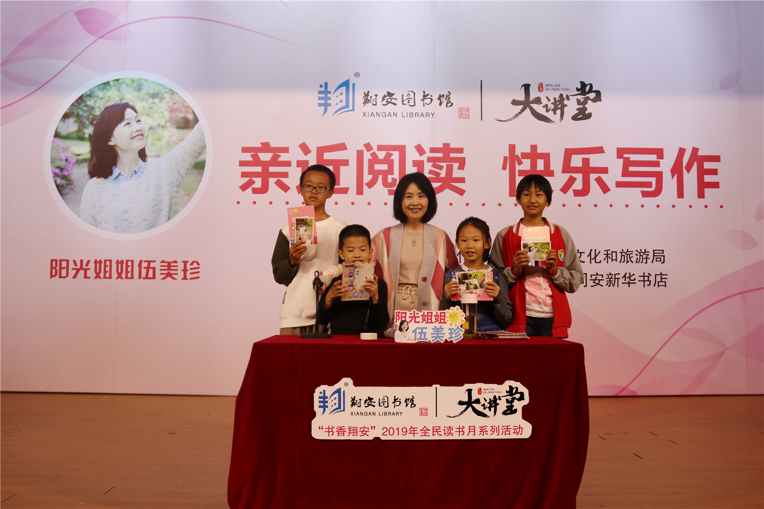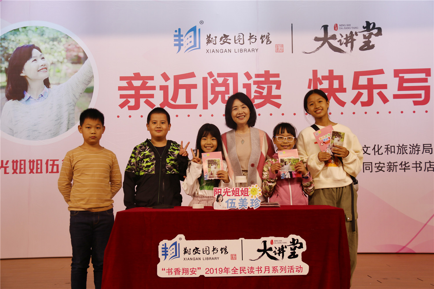 翔安区图书馆邀请了安徽大学中文系副教授、安徽大学儿童文学创研中心主任、小读者所熟悉的儿童文学作家“阳光姐姐”伍美珍,为慕名而来的700多名小读者作了《亲近阅读 快乐写作》的讲座,现场座无虚席。此活动亦是“书香翔安”2019年全民读书月系列活动之“名师大讲堂”活动之一。