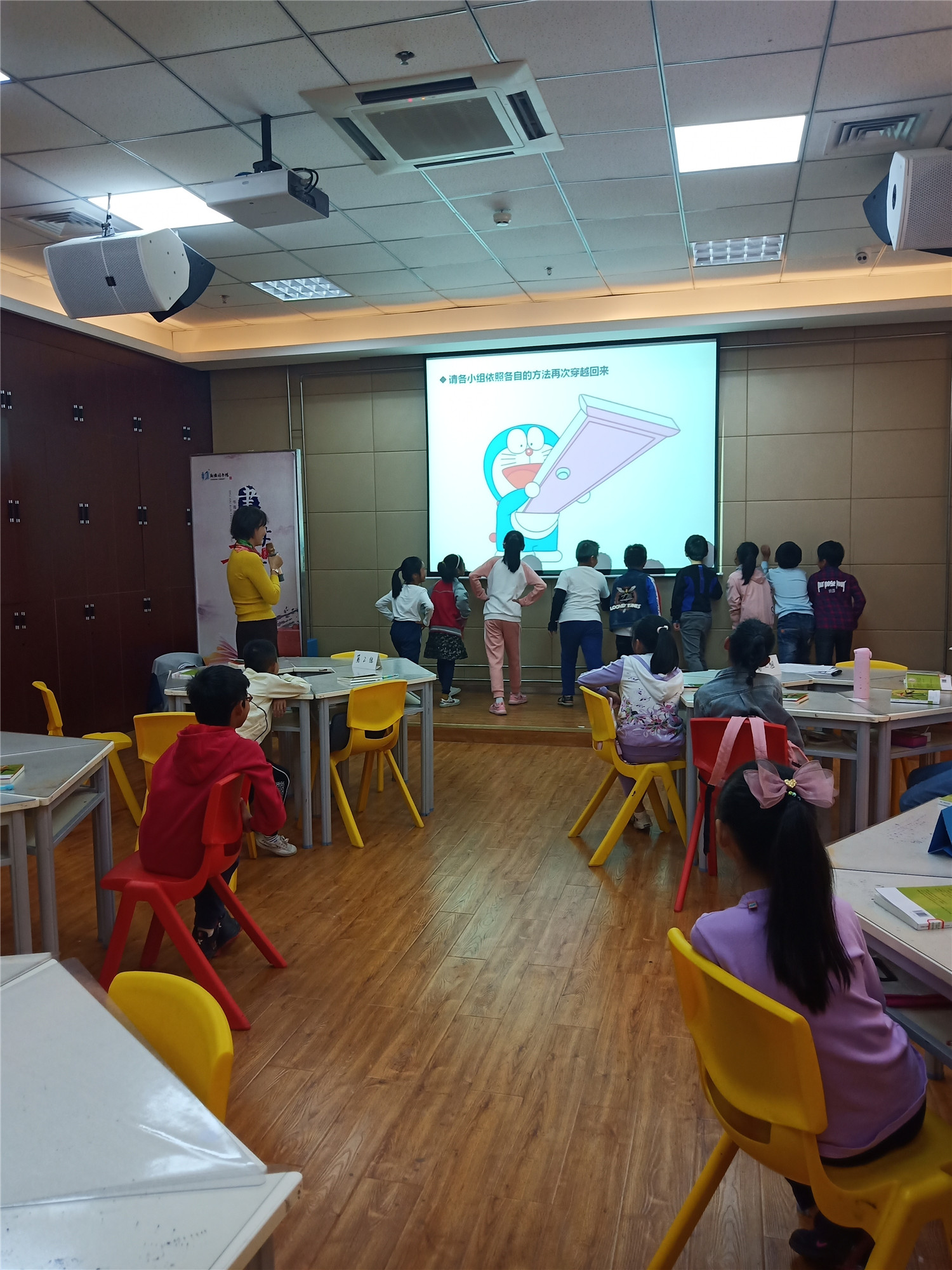 本次读书会采用分组讨论,完成阅读单的学习形式,首先概括故事的主要内容,梳理故事的主要情节。接着,领读老师让小读者阅读故事中的“衣柜穿越”片段,感受作者丰富的想象力,让每一组自创穿越方式,并上台一一表演展示,极大调动了孩子们的想象力和参与热情。