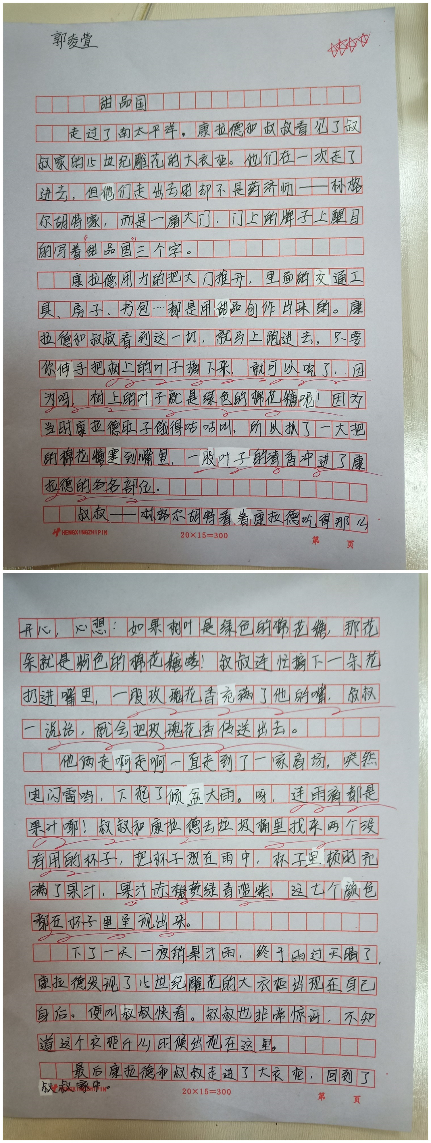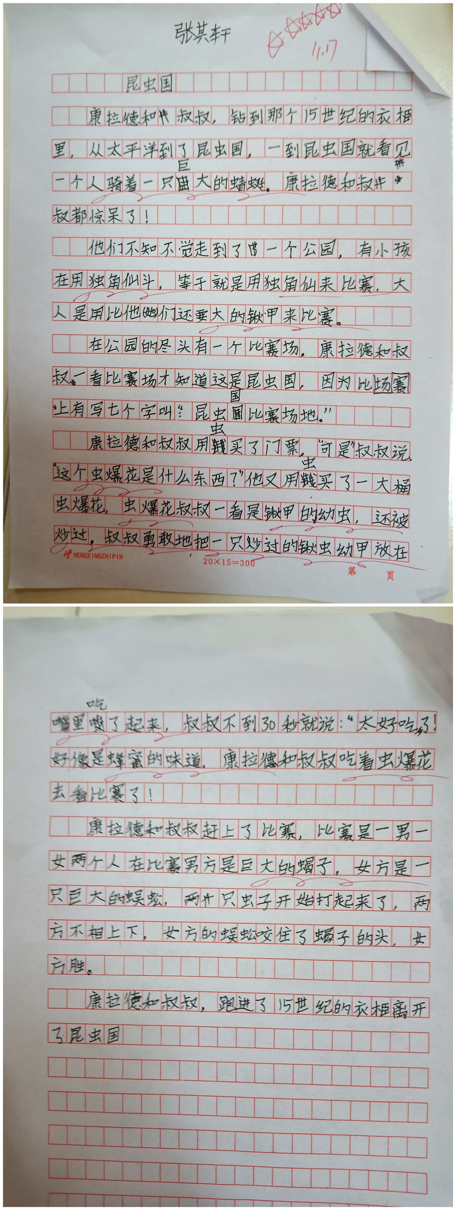 课堂最后,领读老师布置创意写作任务,让孩子们继续幻想康拉德还去了哪些有趣的地方。小读者们发挥想象力,有的写甜品国,有的写昆虫国,有的写童话国,内容丰富有趣,充满了想象力。