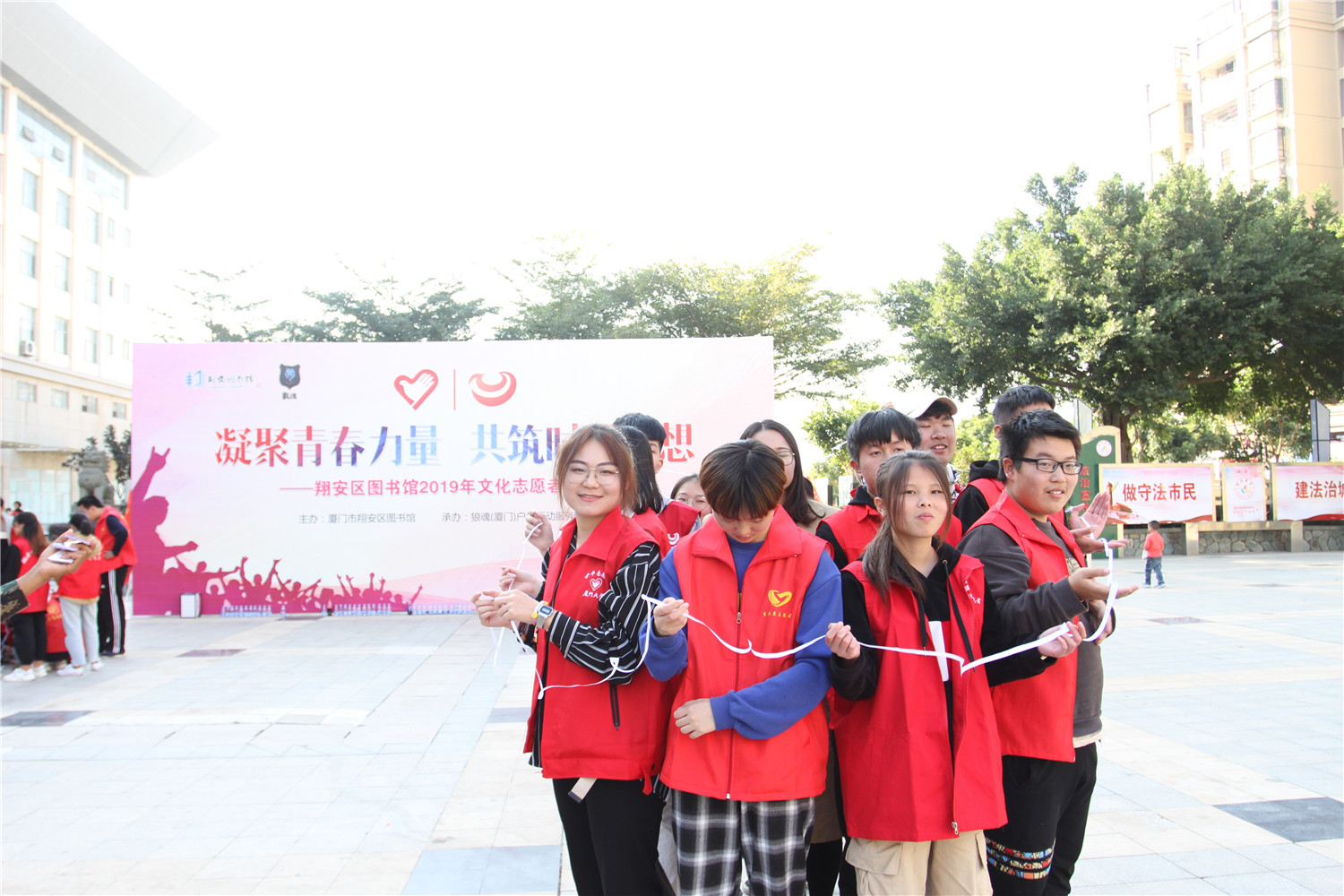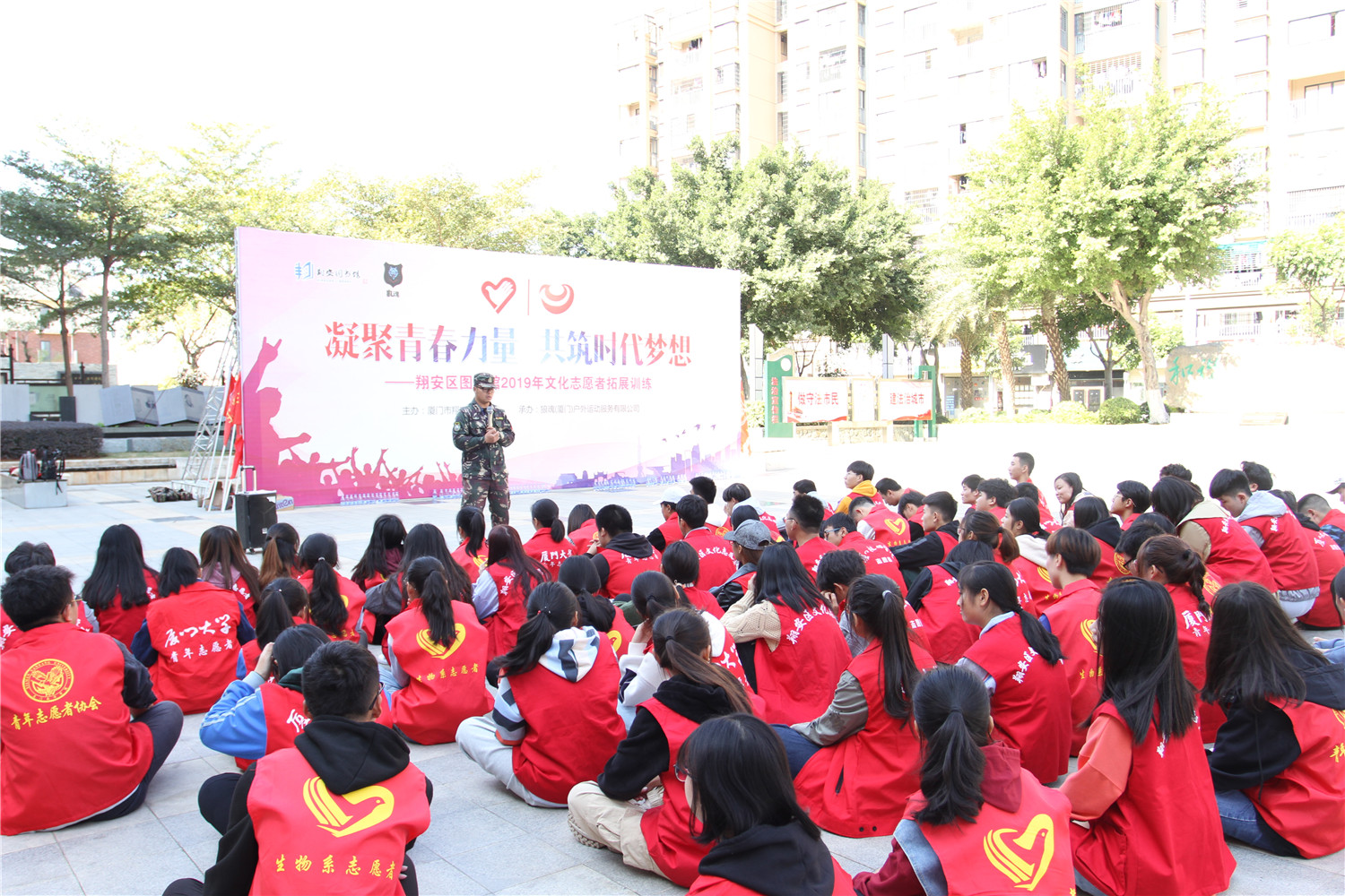 12月15日,翔安区图书馆在文化中心广场举办“凝聚青春力量 共筑时代梦想”2019年文化志愿者拓展训练,来自厦门大学、海洋学院、技师学院、南洋学院、华天学院、安防学院6所院校90名大学生文化志愿者骨干参加了活动。
