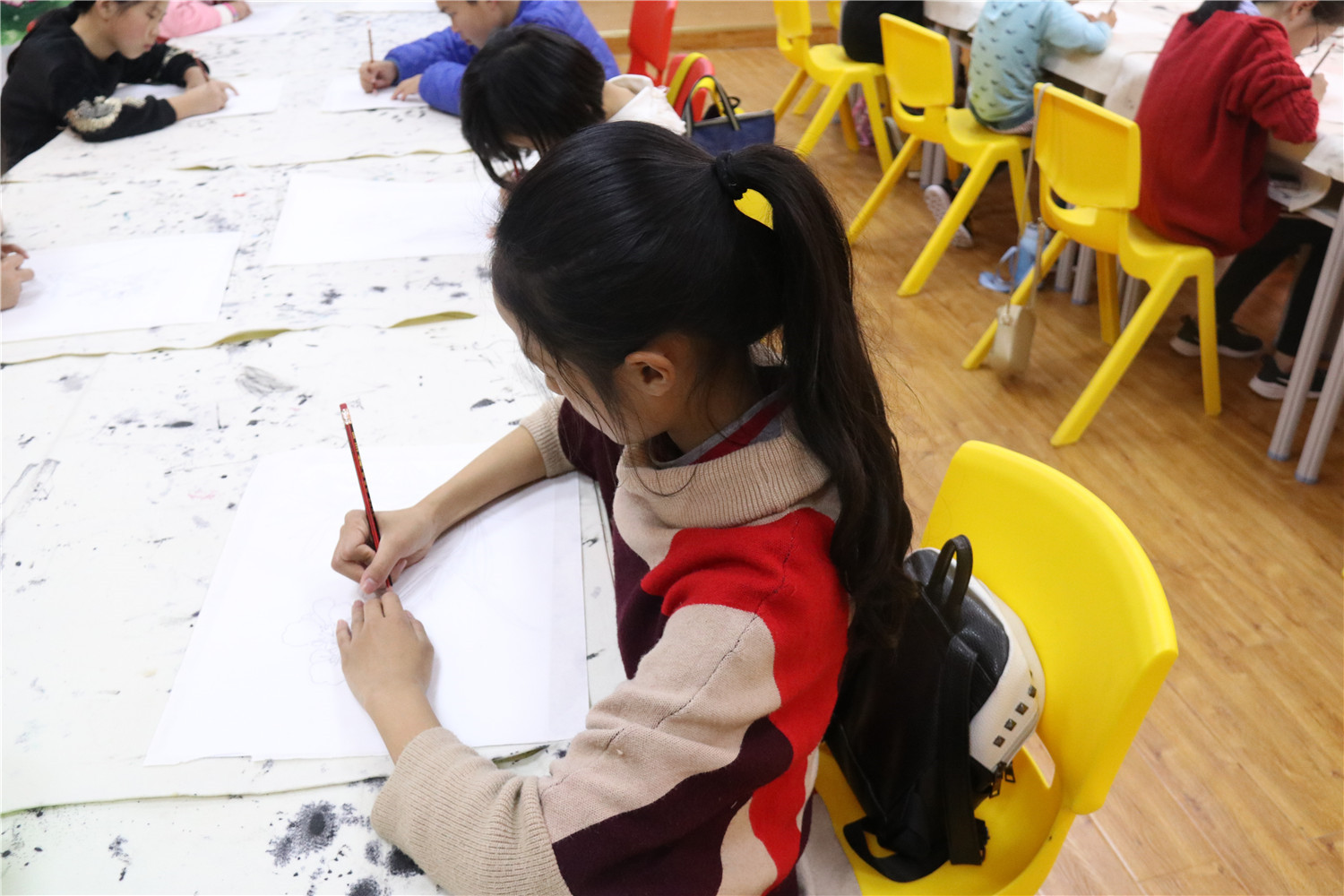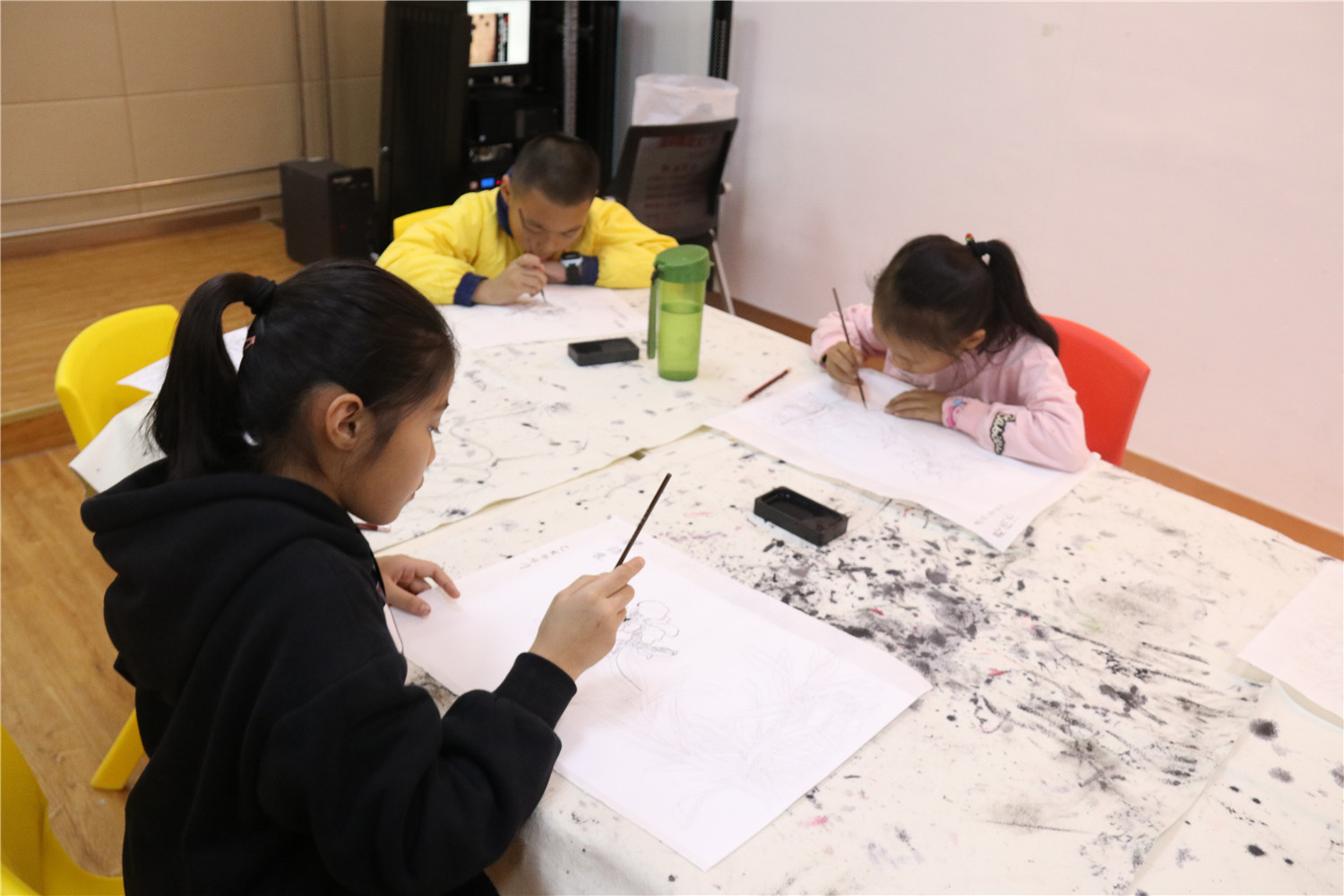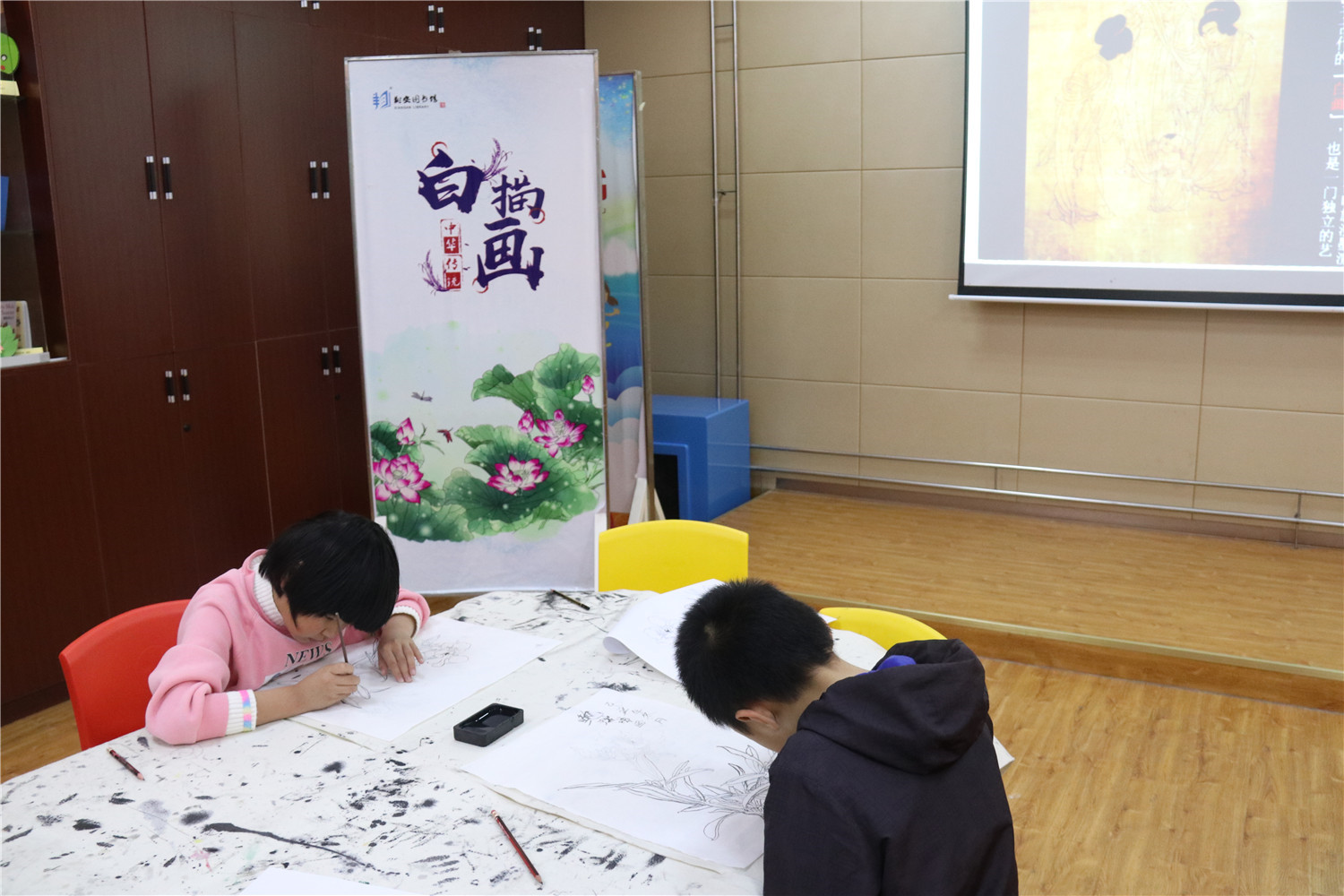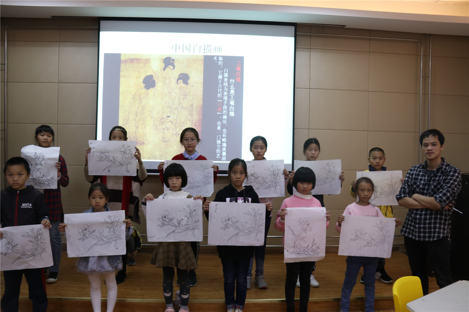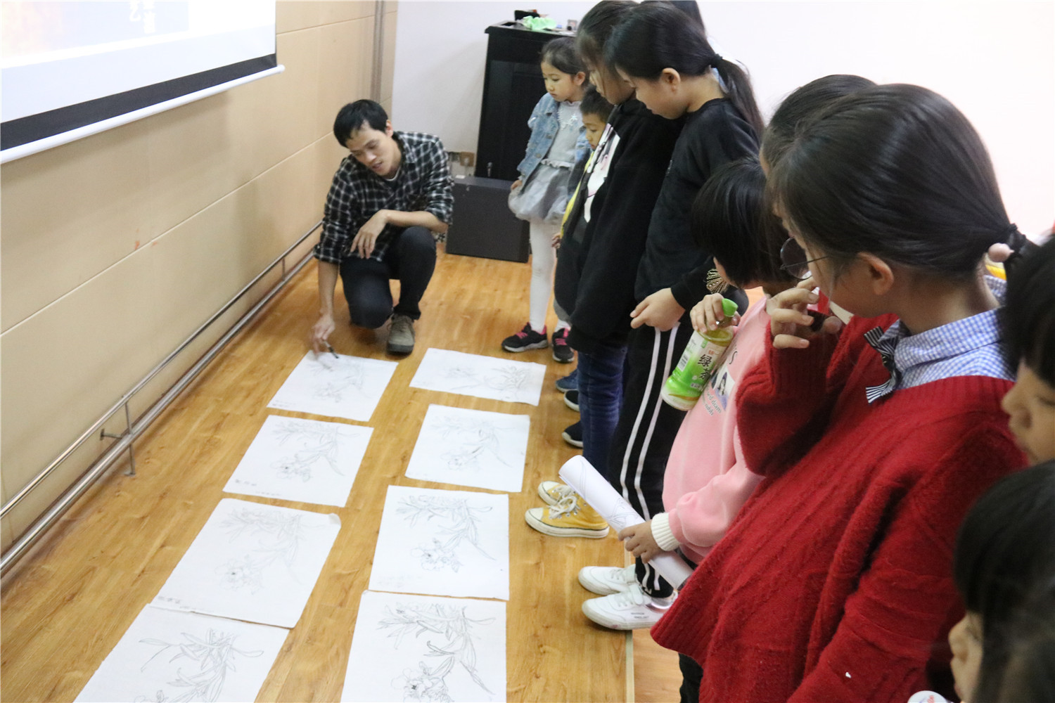 本次课堂巩固练习花卉线条白描。授课老师再一次强调了线条描绘的基础性和重要性。最后,小读者独立完成了花卉线条白描作品。
