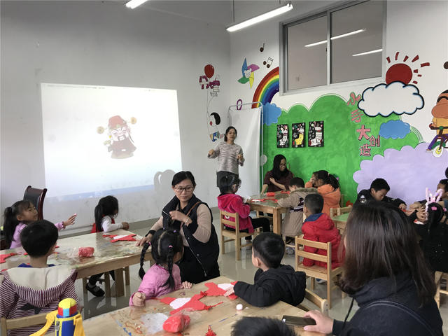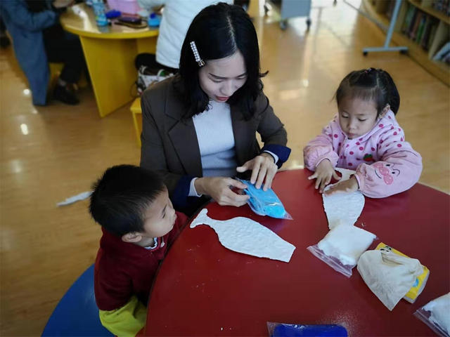 活动的最后是亲子手工,由老师教,小朋友在家长的配合下一起完成雪人的制作。