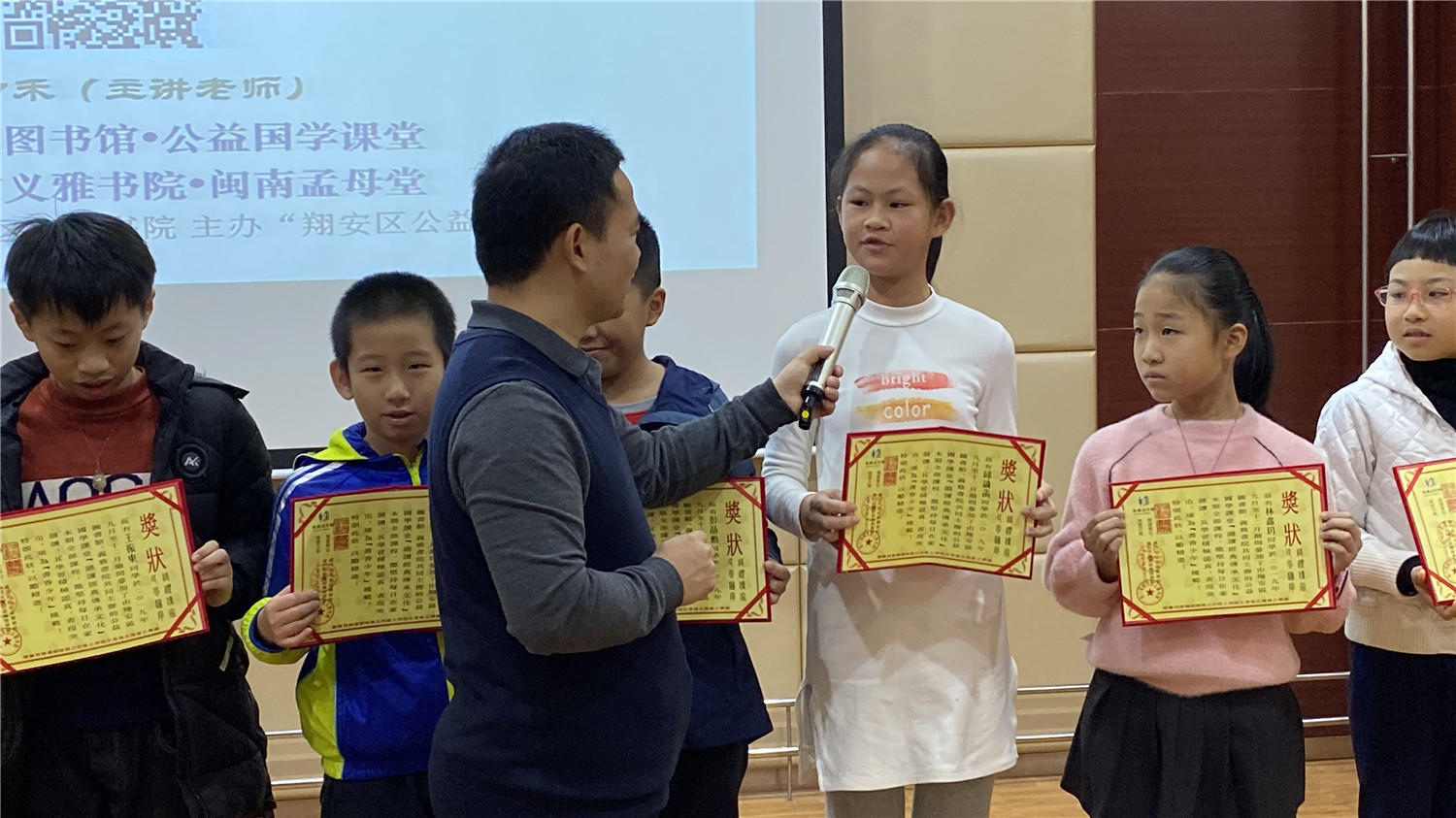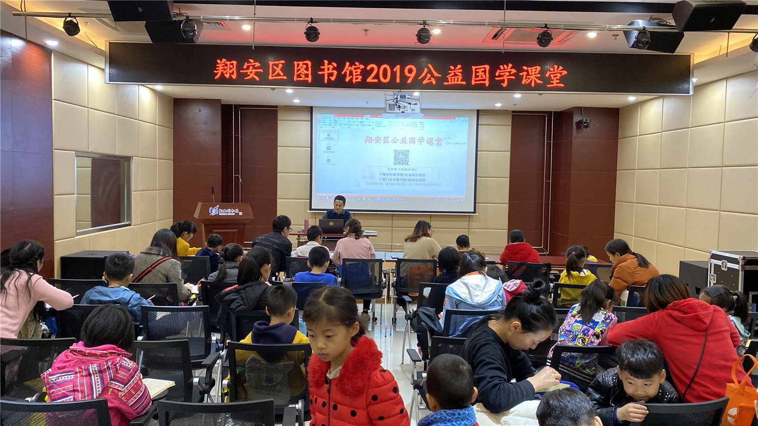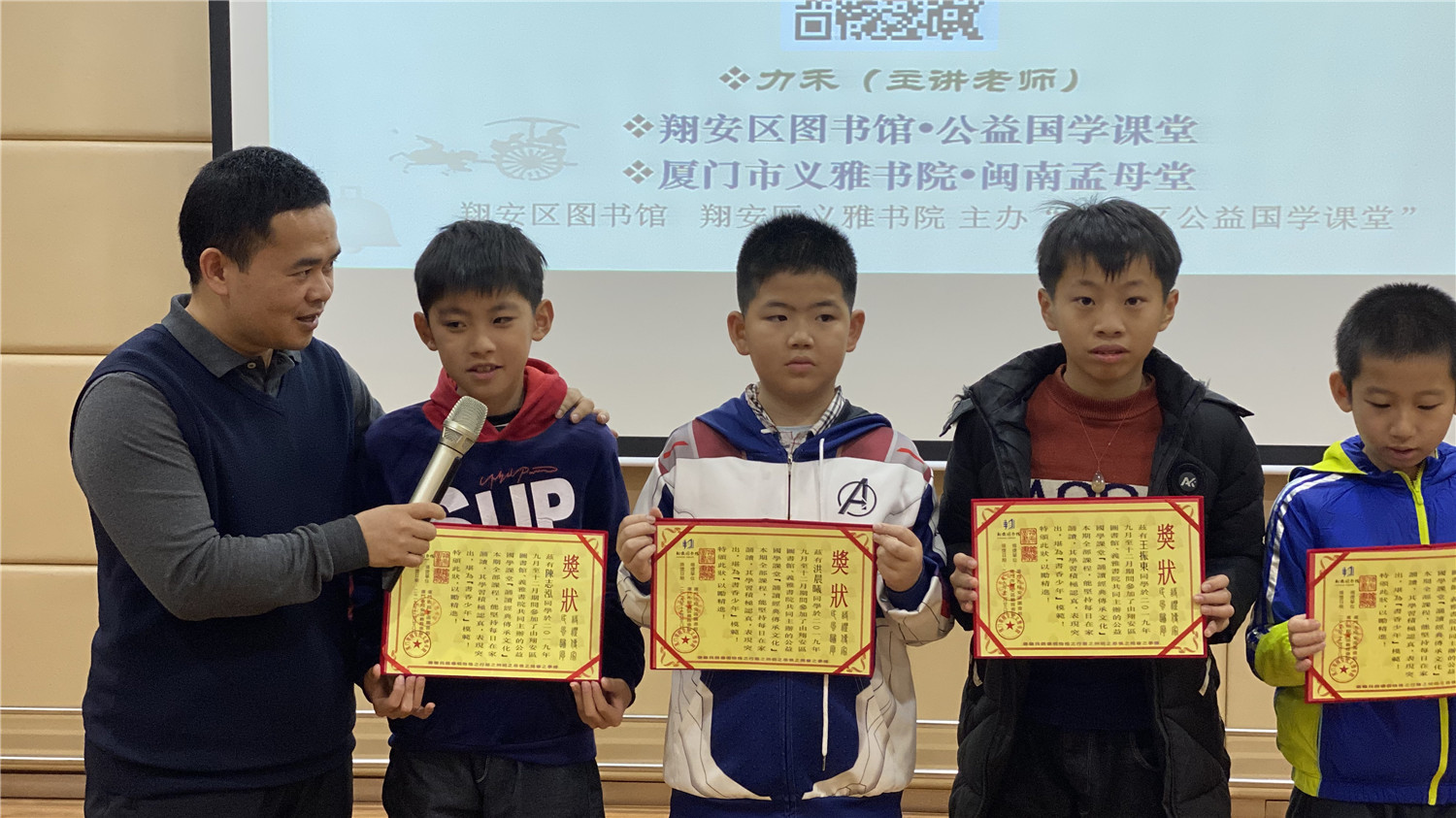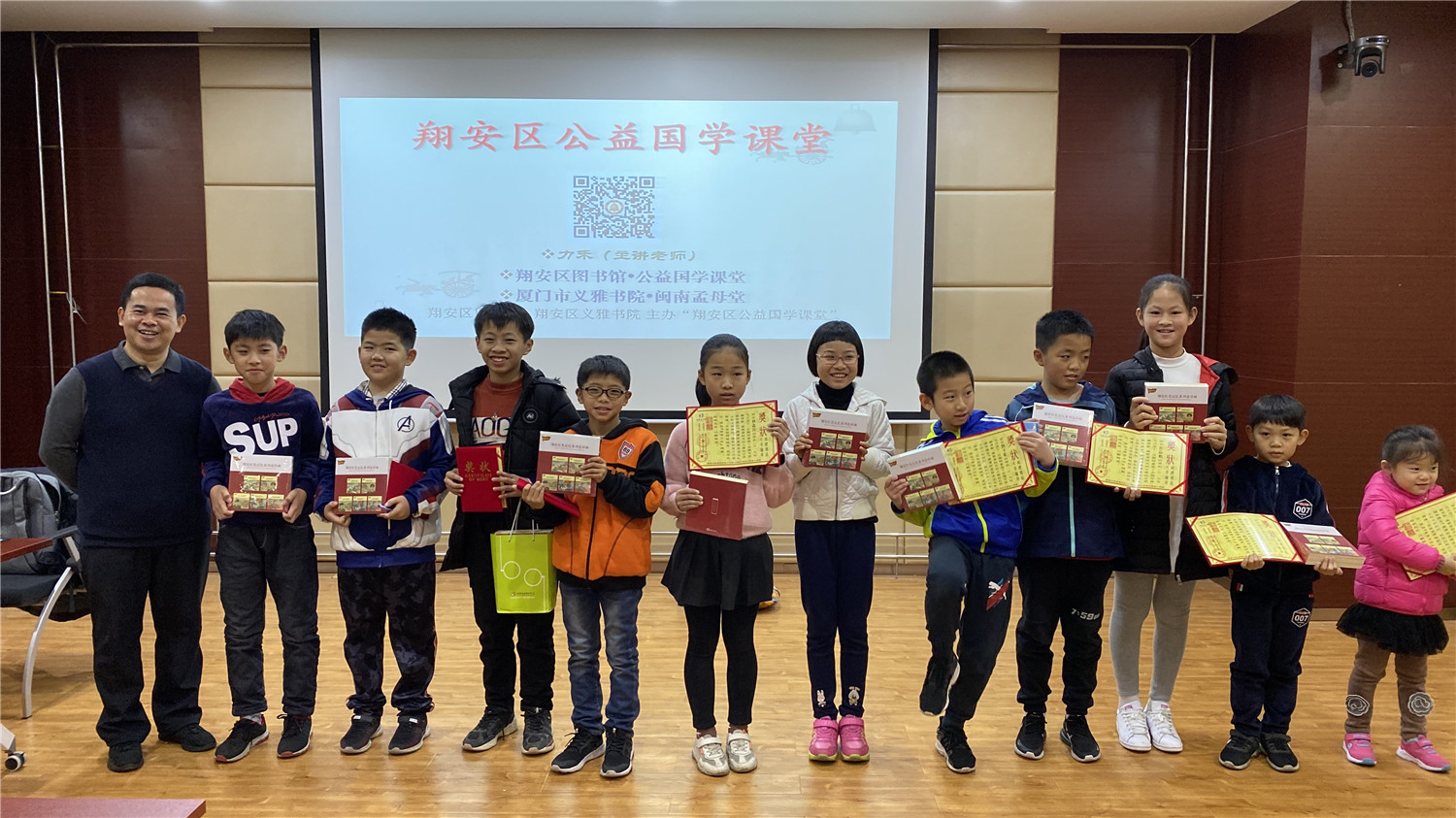 12月28日上午,2019年秋季公益国学课堂最后一期活动在翔安区图书馆报告厅举办,现场座无虚席。本次活动由翔安区义雅书院院长力禾老师主持,他作了德能讲座分享,并指导在座亲子家庭的读者诵读《论语》、《千家诗》等国学经典。课堂上有分享、有讨论、有答惑,由浅入深,亲子共学,既诵读经典、学习圣贤的智慧,又在德能分享活动中帮助读者树立正确的知见。最后,主办方还向坚持参加公益课堂活动的亲子家庭颁发了奖状和奖品。