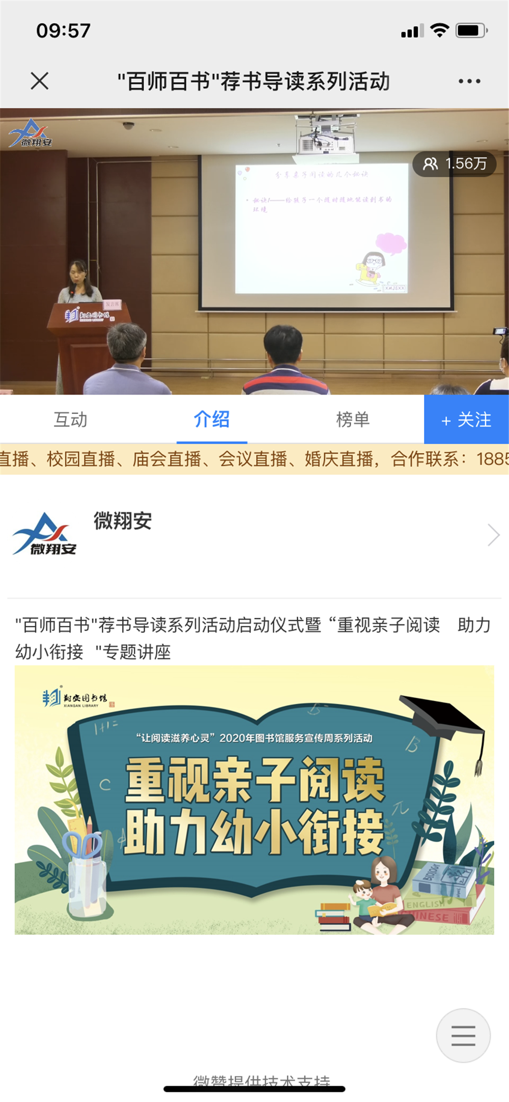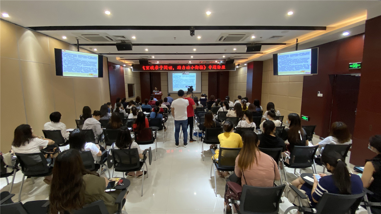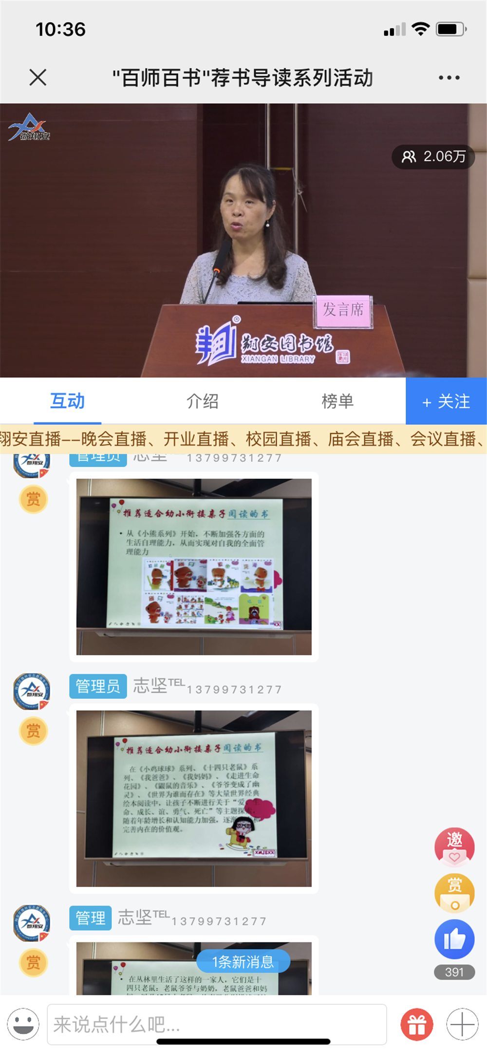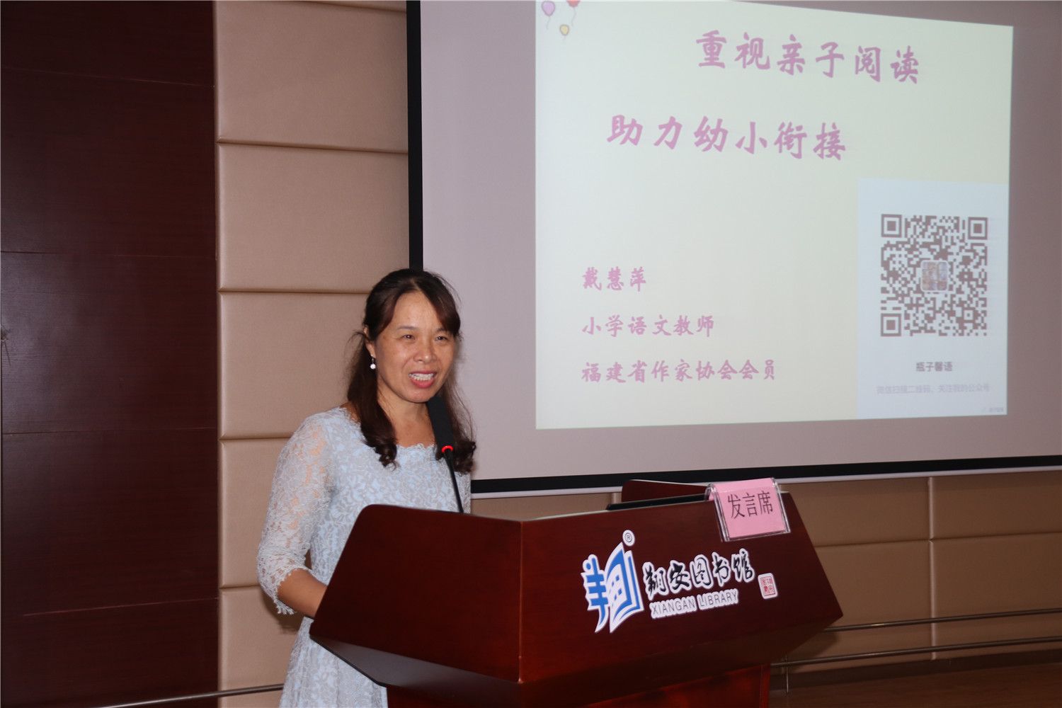 启动仪式后还举办了《重视亲子阅读,助力幼小衔接》专题讲座,此活动是“让阅读滋养心灵”2020年图书馆服务宣传周系列活动之一。区图书馆邀请了福建省学科带头人,省作协会员戴慧萍老师为现场教师代表开讲。讲座上,戴慧萍老师从一个资深小学语文老师和一个母亲的角度分享了坚持亲子阅读故事和亲子成长故事,向大家介绍了在幼小衔接中为什么要亲子阅读,结合当前亲子阅读中的误区,分享亲子阅读的秘诀,并推荐适合幼小衔接的阅读书目。值得一提的是,本次活动还采取线上直播的方式,把学术资源带给更多的读者,当日直播观看人数达到了2.83万人次。