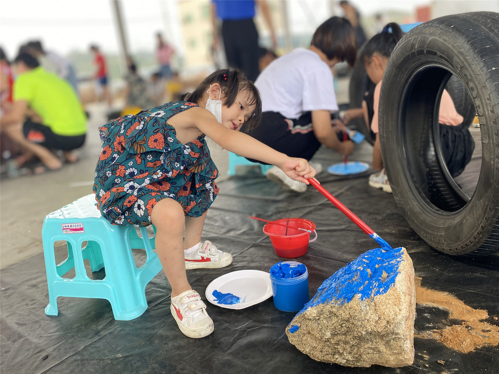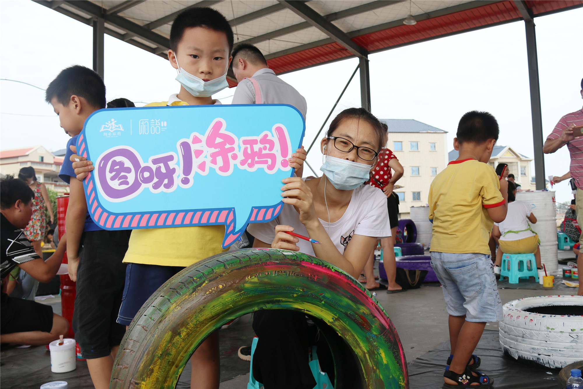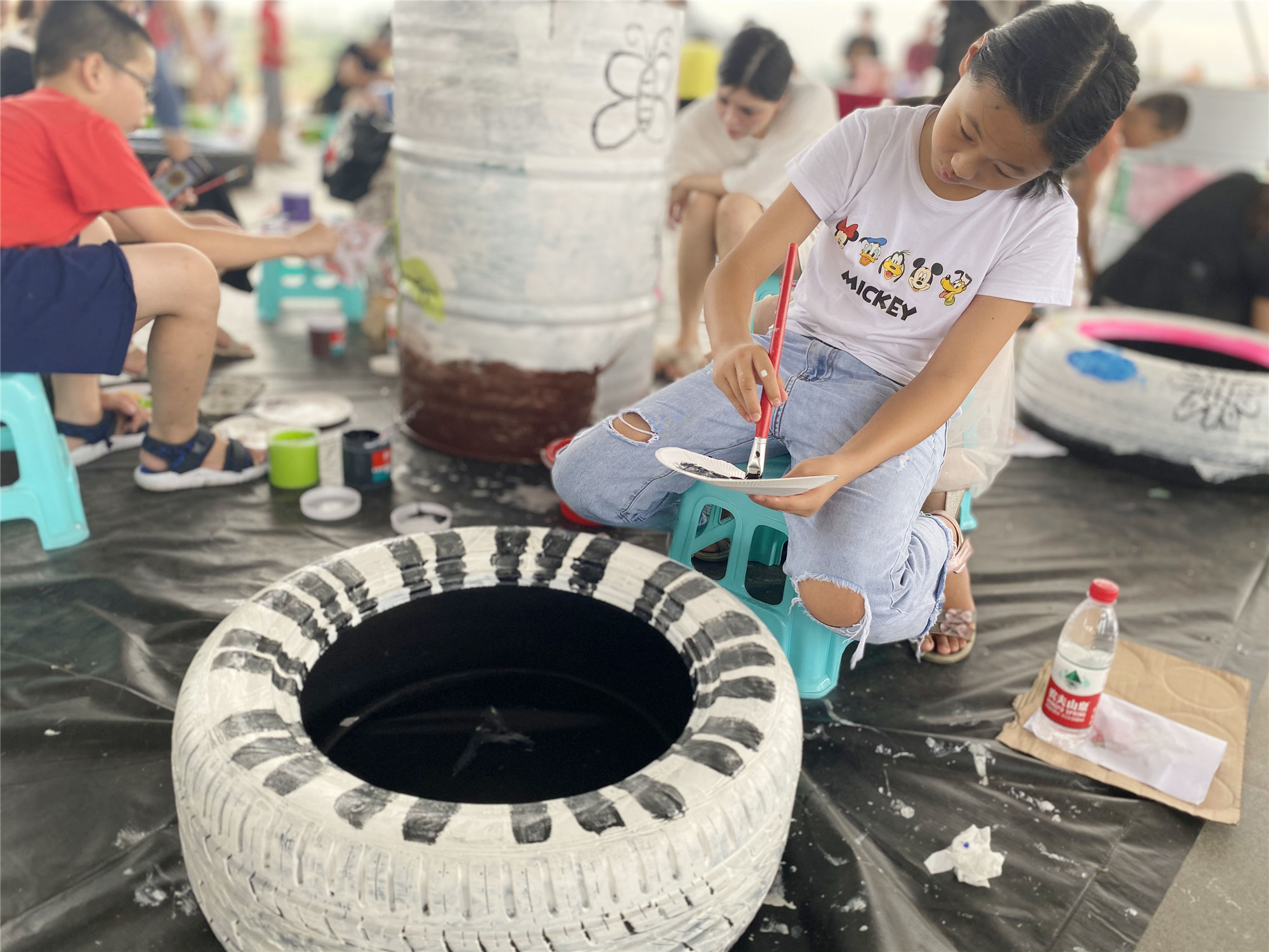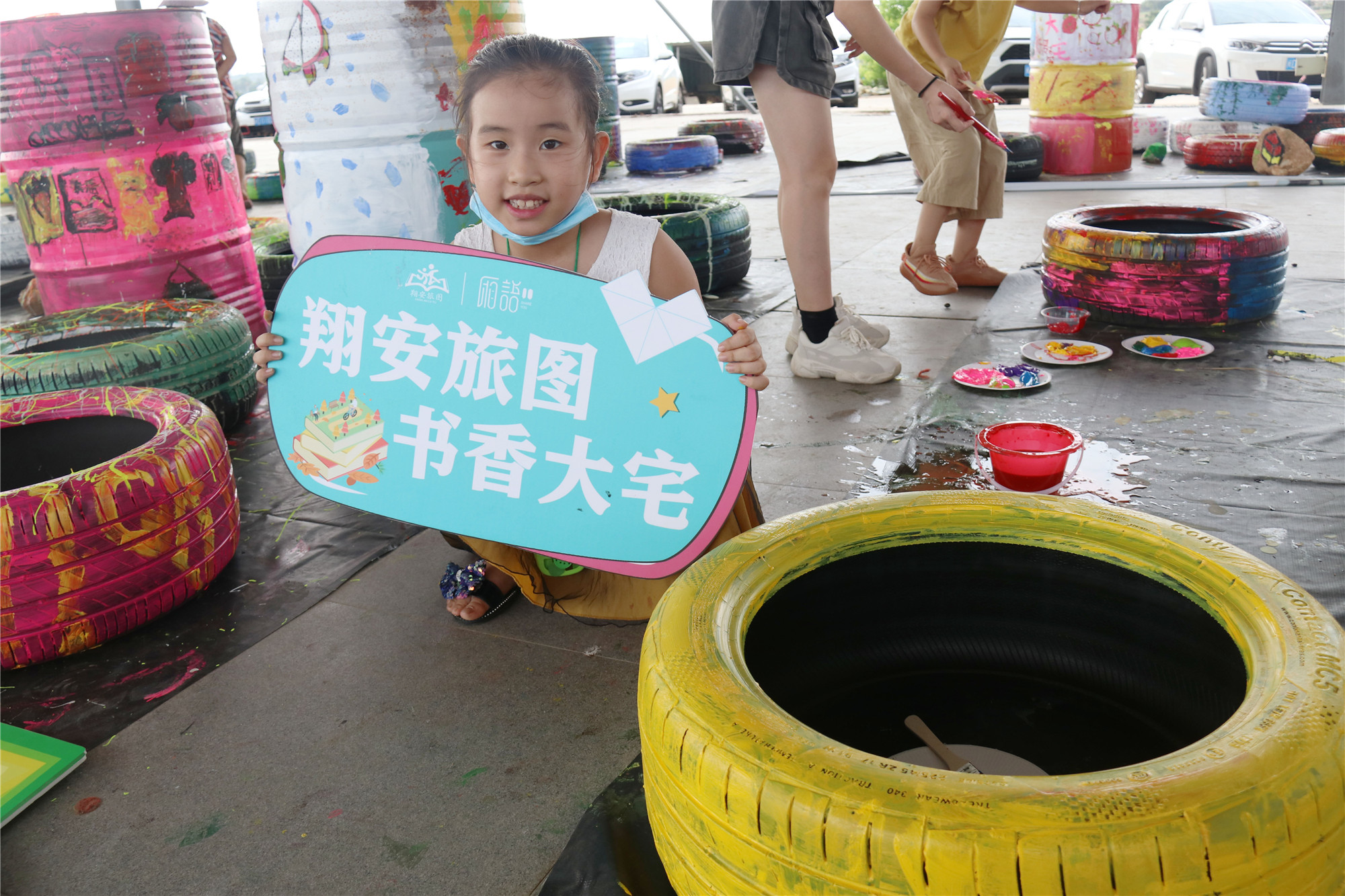 7月25日、26日下午,由翔安区图书馆组织的共120组亲子家庭在涂鸦师的指导下一起动手在废旧轮胎、油漆桶、石头等旧物上进行荧光创意涂鸦彩绘。