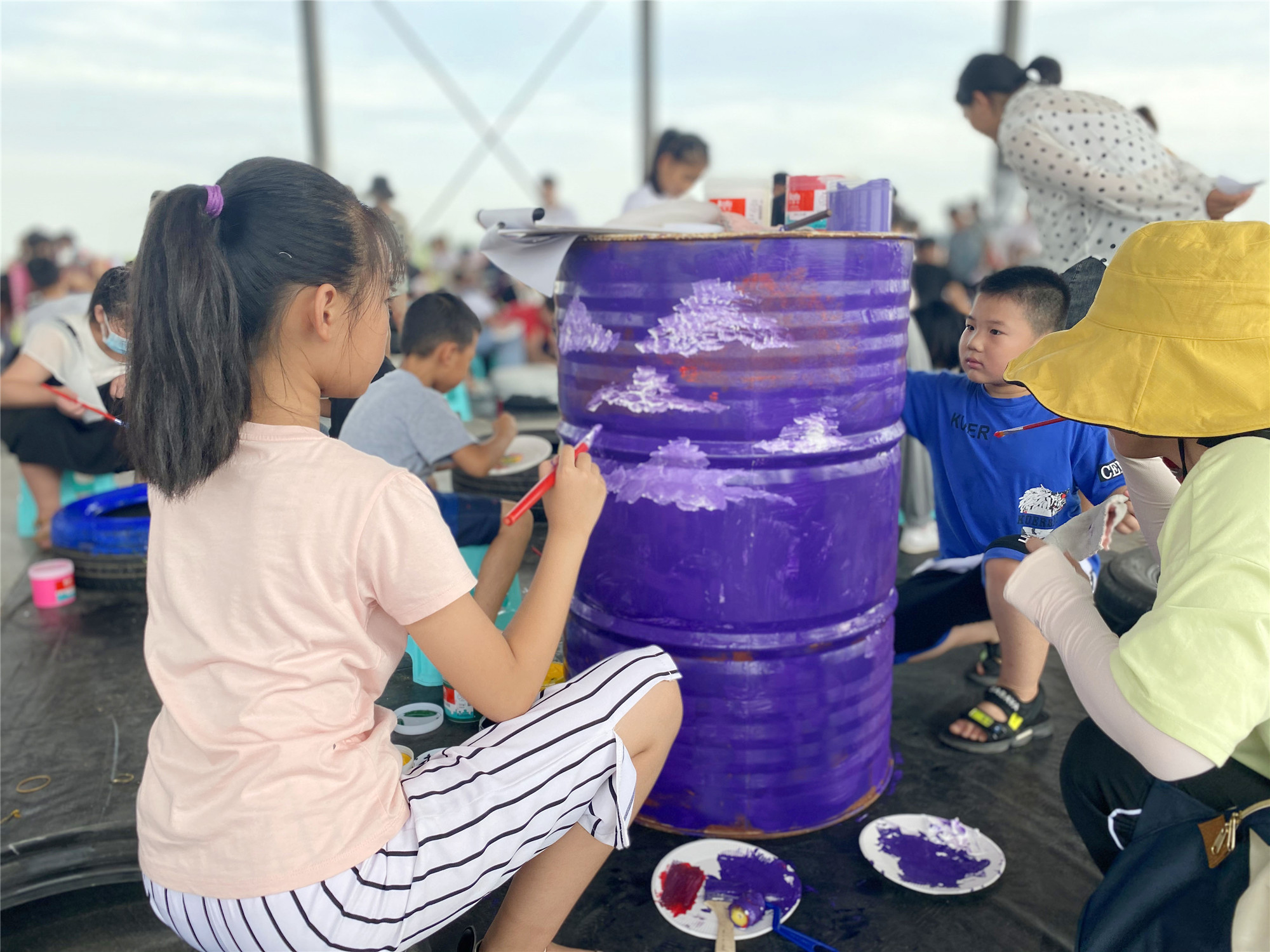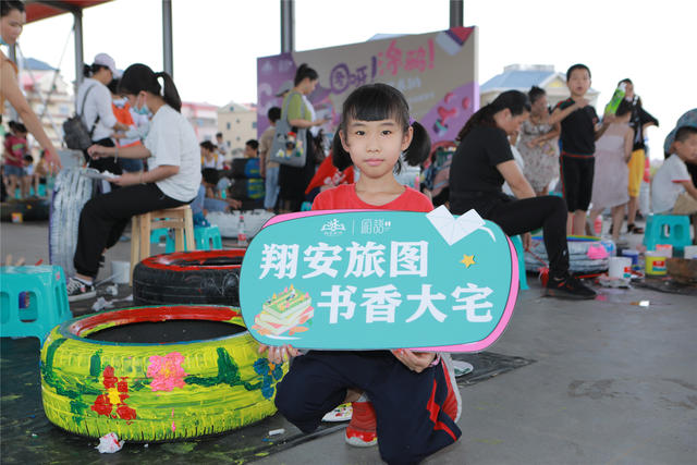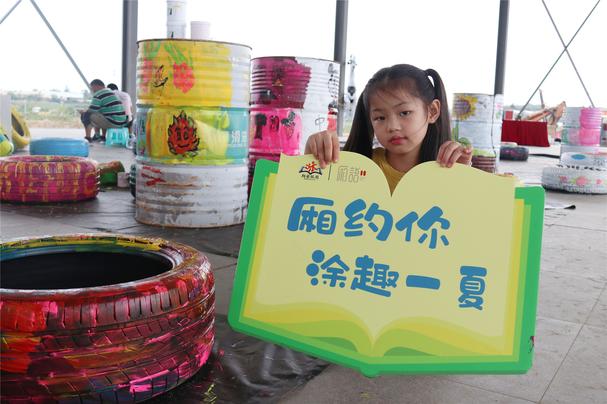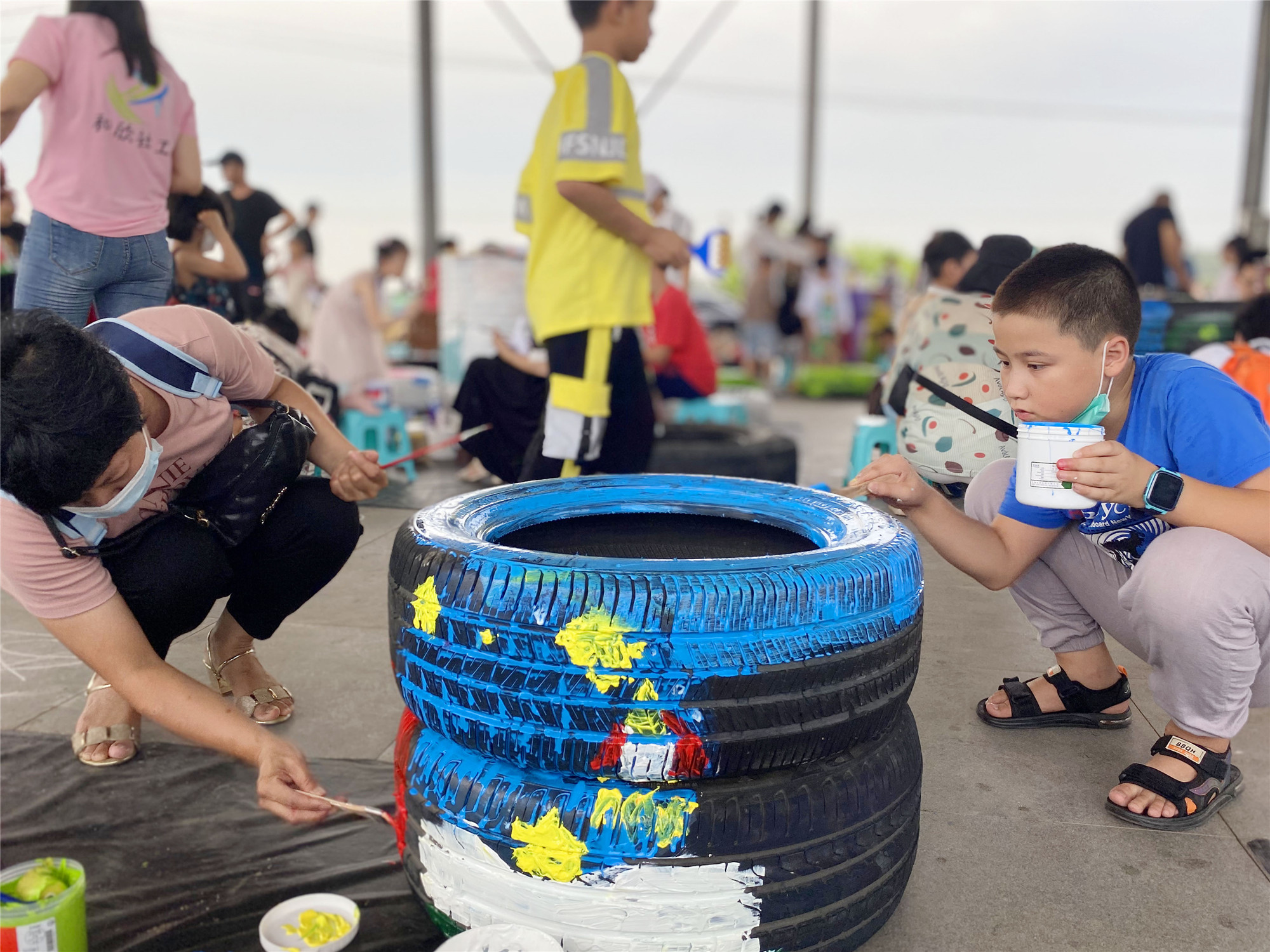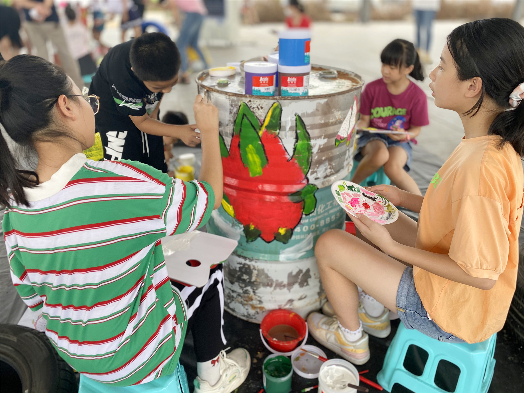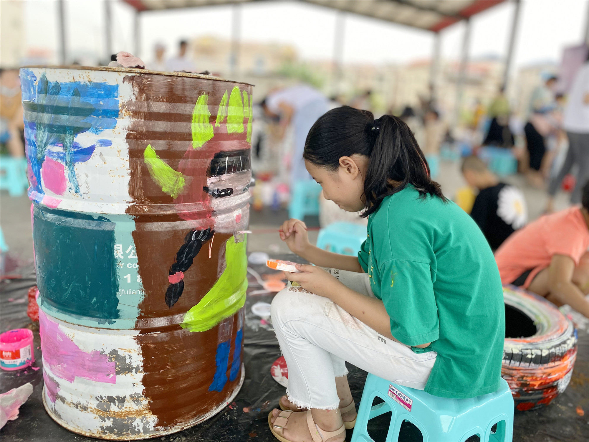 7月25日、26日下午,由翔安区图书馆组织的共120组亲子家庭在涂鸦师的指导下一起动手在废旧轮胎、油漆桶、石头等旧物上进行荧光创意涂鸦彩绘。