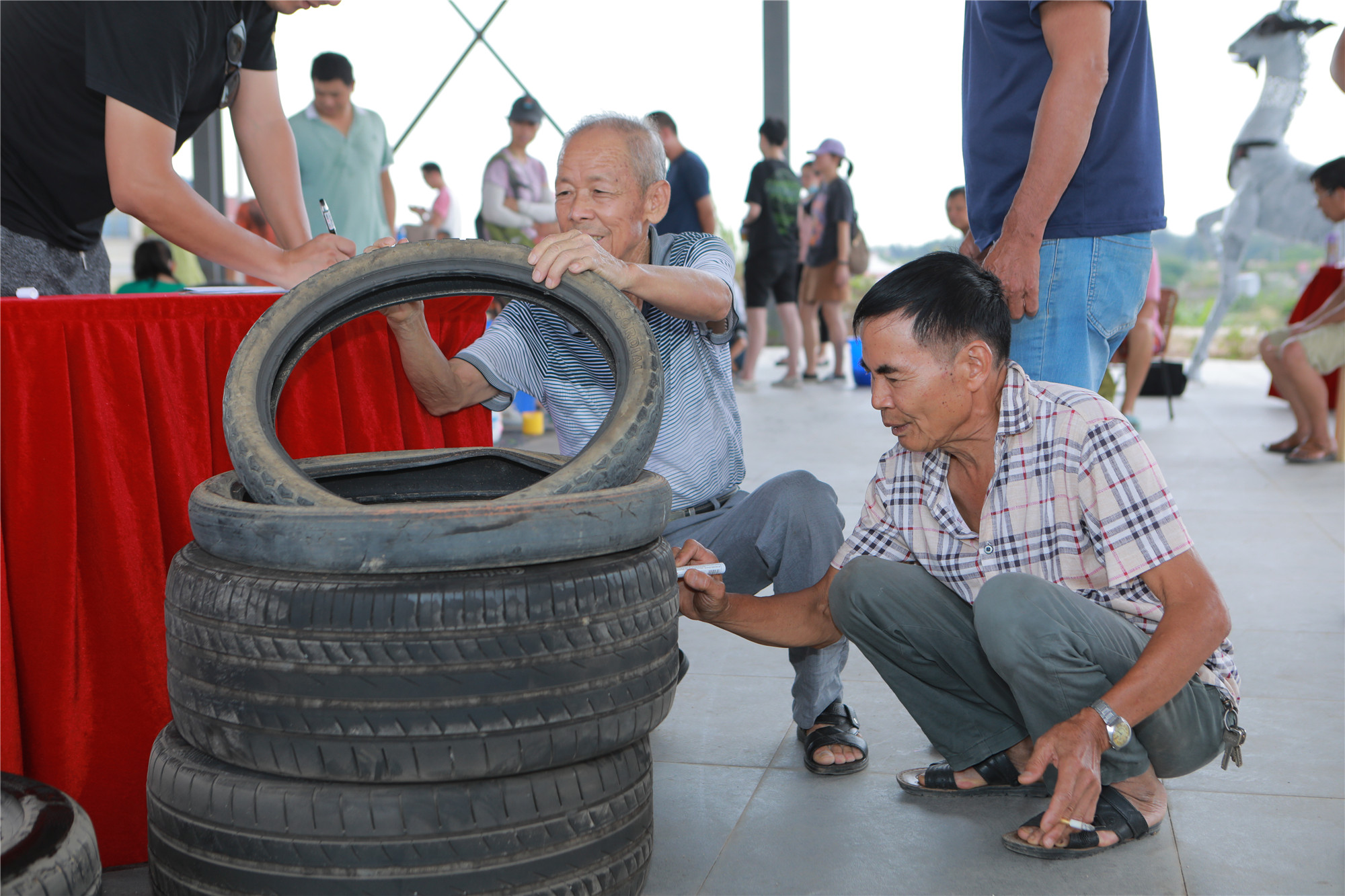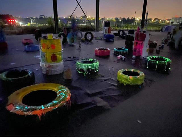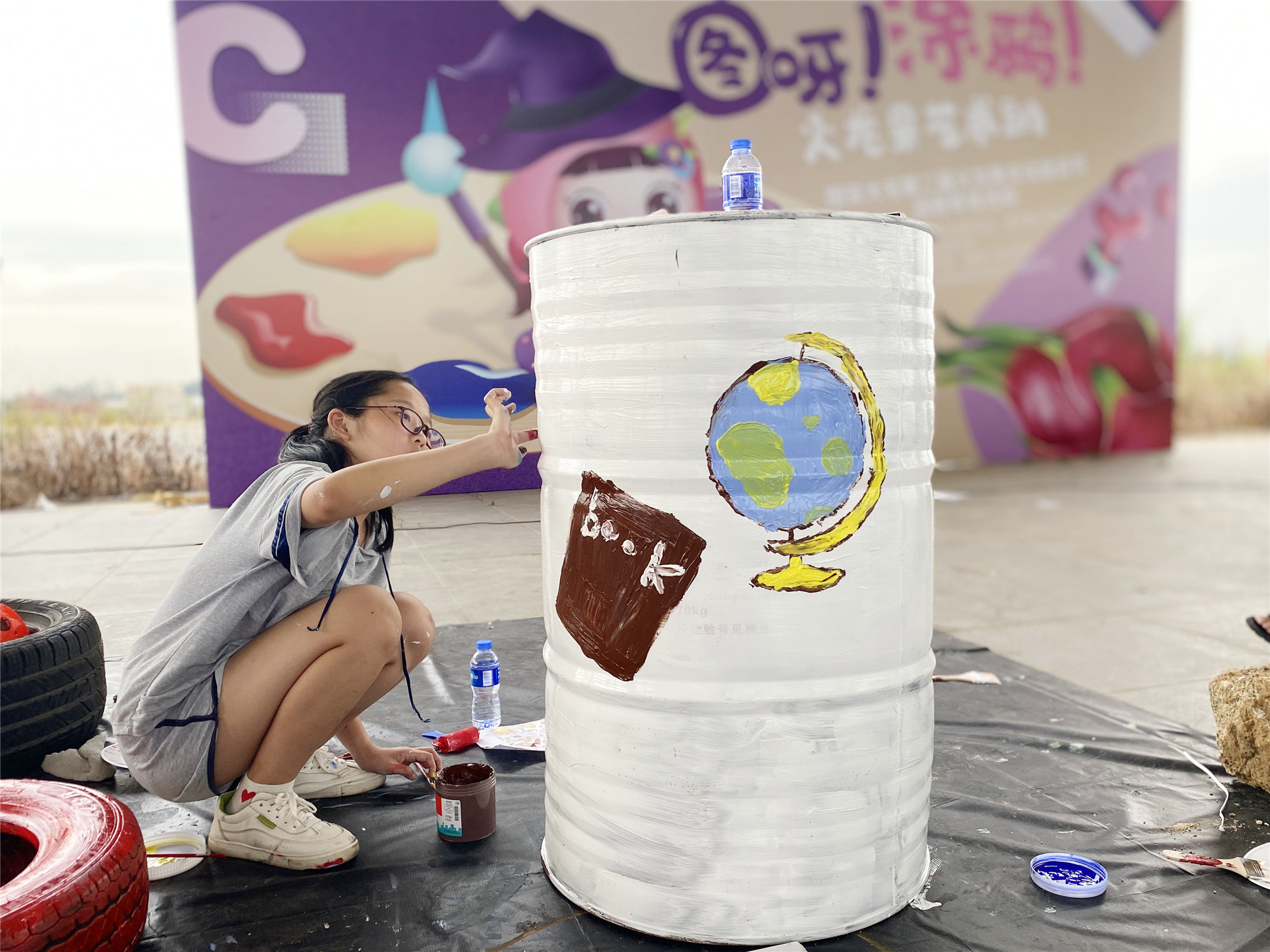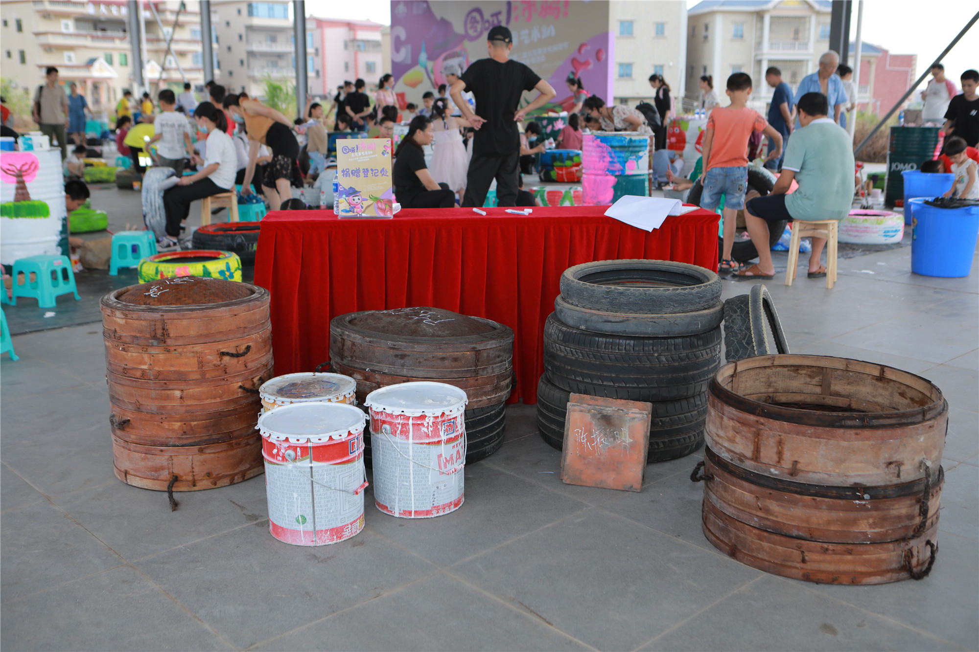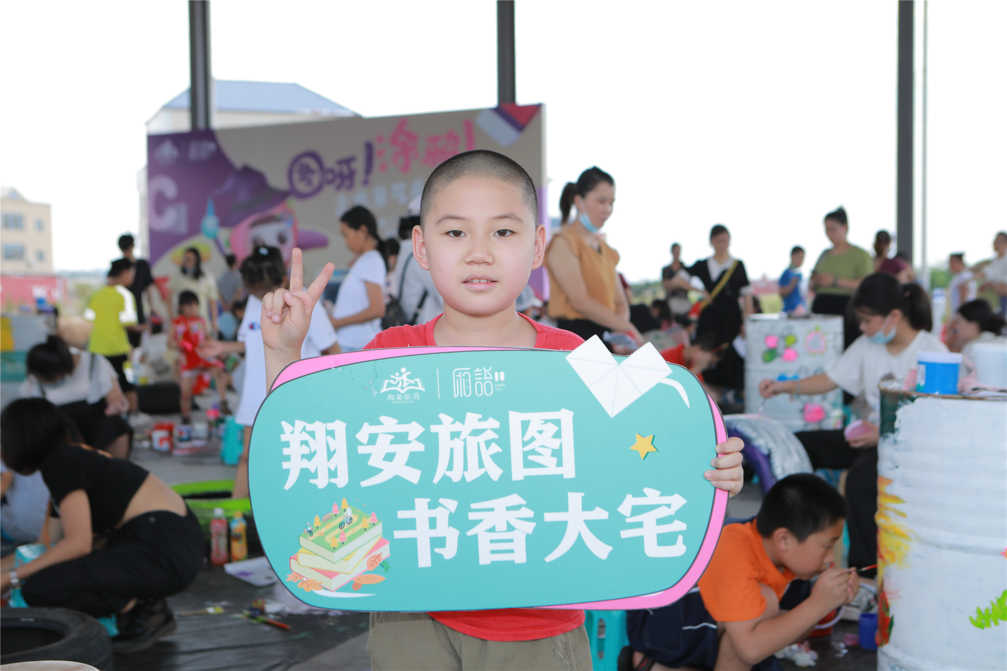 7月25日、26日下午,由翔安区图书馆组织的共120组亲子家庭在涂鸦师的指导下一起动手在废旧轮胎、油漆桶、石头等旧物上进行荧光创意涂鸦彩绘。