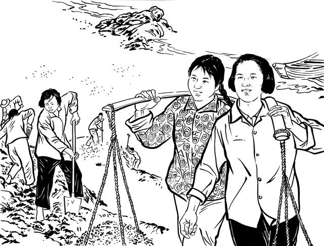 13. 构筑工事还需要大量沙子垒沙包。洪秀枞组建“女子运沙队”,挑海沙上阵地。妇女们挑着沉甸甸一大担沙子,从海滩登上小嶝岛,必须沿着一百三十多级的石阶迂回曲折而上,攀登那样陡峭的山路,那份艰难可想而知。洪秀枞虽然人小体力差,但每次挑海沙总是走在最前面。