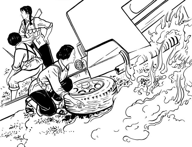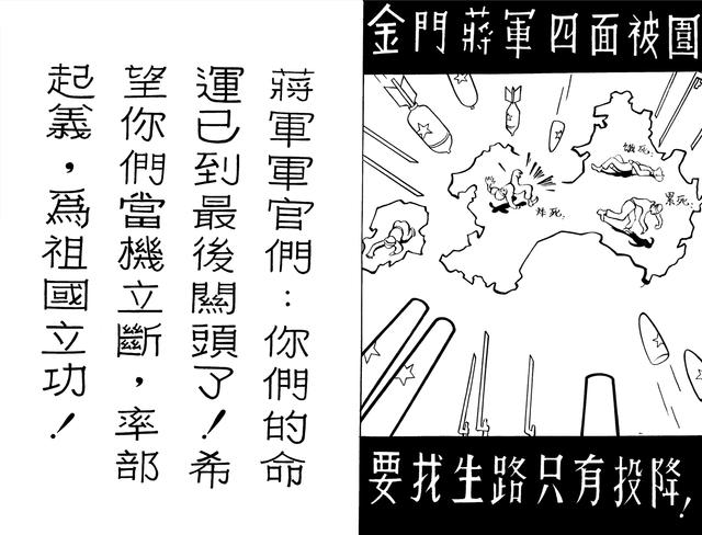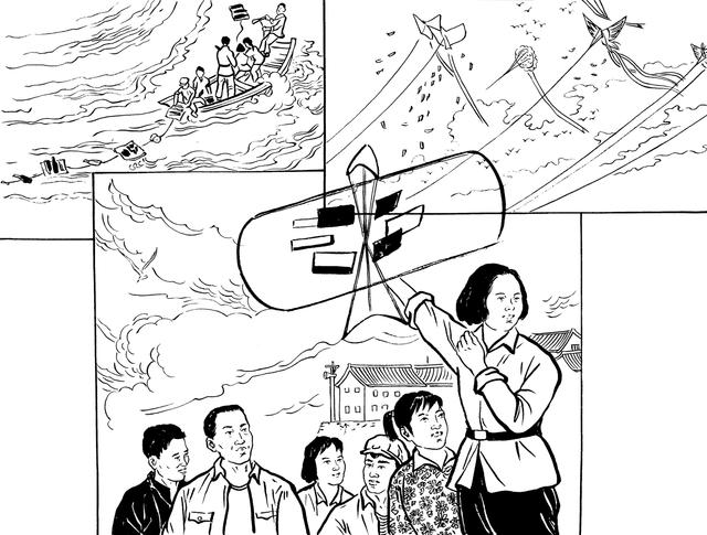 25. 洪秀枞召集民兵们集思广益,想出两个办法:“空飘”和“海漂”。他们从家家户户和内地村庄收集空酒瓶、陶壶、空罐头盒、竹筒、猪小肚……然后装进传单密封投海,借助潮力风力,漂到金门去。最有趣的是把宣传品放进猪小肚里,用打气筒打气,灌得鼓鼓囊囊的,像白气球漂在海面上。