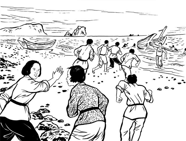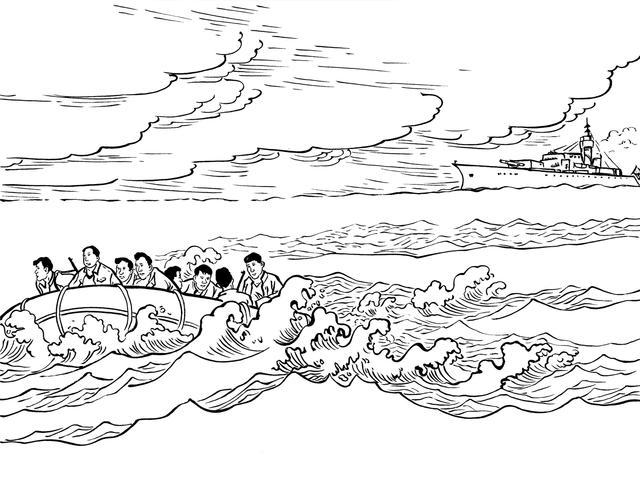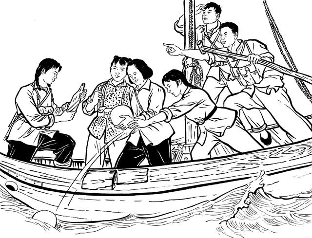54. 当“水鬼”快要接近礁石时,洪顺利大吼一声“抓!”几条小船如离弦之箭向前冲去!这时摄影机也及时启动。民兵们一下子把三名“水鬼”抓获了。这个真实精彩的战斗场面被摄制组拍了下来。