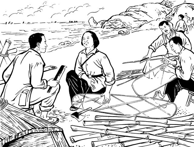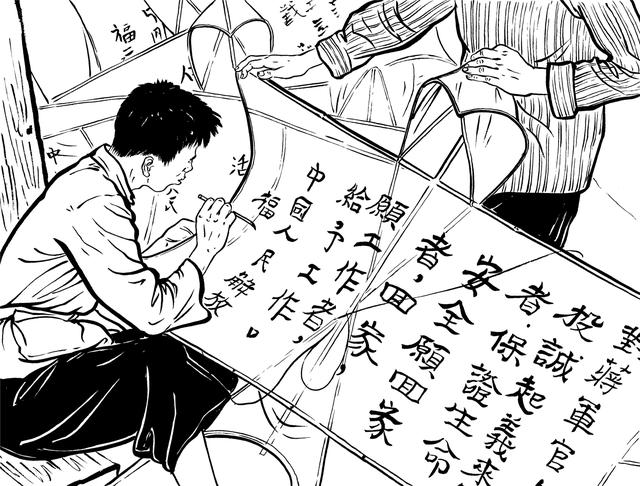 29. 男民兵们负责制作风筝。他们有的破毛竹、起篾片、剖竹条,有的扎风筝蒙棉纸,有的在线桄子上绕线团,有的拣选传单、过磅打包,每包重量1公斤,还有的锯一段段5斤重的松木,当风筝放飞时,系在风筝线的末端,扔进海里,像船舵一样,控制飞行方向。