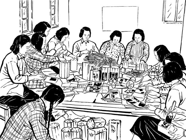30. 女民兵们负责打包。宣传品是用一种八角纱巾包装的,纱巾的八个角各有一个细小铁圈,用一条棉线串着,包装时把称好的宣传品叠放在纱巾里,再将棉线勒紧打结。包打好后还要在上面绑一支蚊香,蚊香是专门为放风筝而特制的,每分钟燃多长有固定值,根据风力的大小和距离的远近设置长度的。