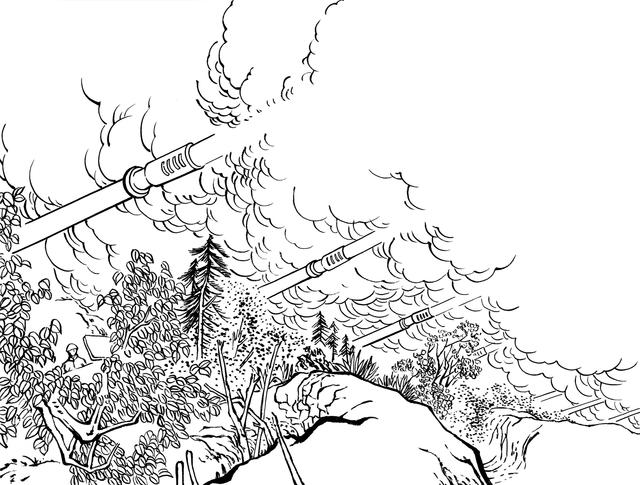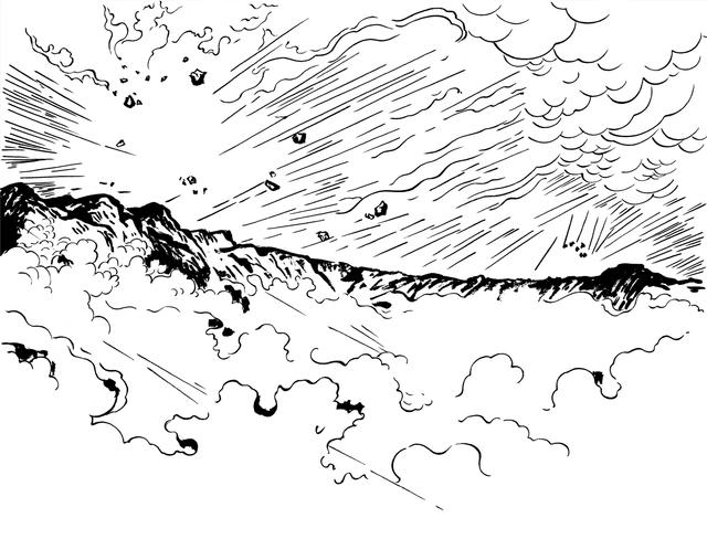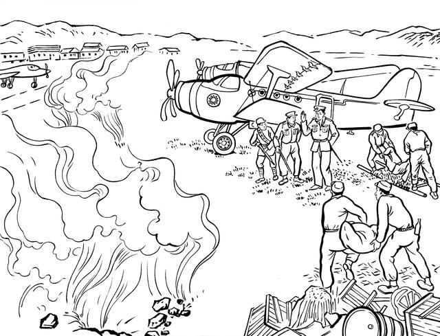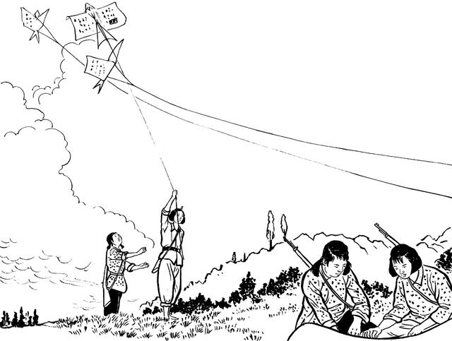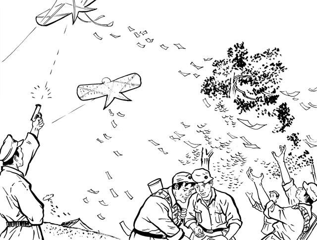 32. 于是,一行人挑着风筝、传单、线团、松木、蚊香等,摸黑沿着交通沟来到小岛南坡,那里有一大片空地,是专门开辟出来作为放风筝的场地。他们通常分成两组,每组3人,分工合作放风筝。