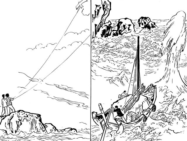 33. 一人点燃蚊香、拉着线头,一人把鹰头风筝送上天。当飞到5米高度时,拉风筝者紧紧拽住线头,另一个人迅速把纱巾包系在线上,然后才刷刷地放开线,放完线后在末端打个结扣,用食指勾住这个结扣送下海滩,系在松木上,抱着松木抛到海里。