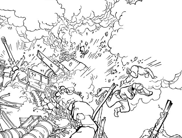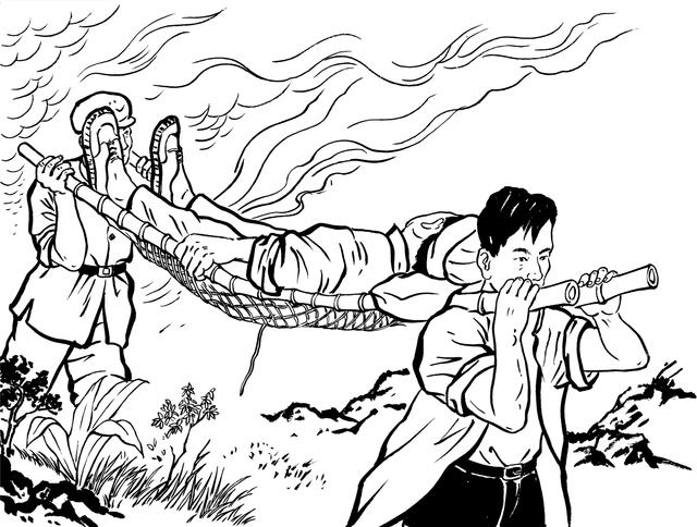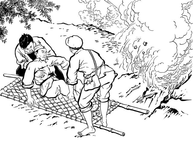 83. 正在防炮洞待命的民兵担架队员邱朝枝、邱维平像箭一样冲上阵地,抱着周副连长放在担架上,飞一般地抬着他跑。刚到邱氏祠堂。此时,突然头顶上“嘶嘶”作响,这是炮弹就要在附近爆炸的预兆。两人不约而同,就在炮弹即将爆炸的一瞬间,同时趴在周副连长的身上。
