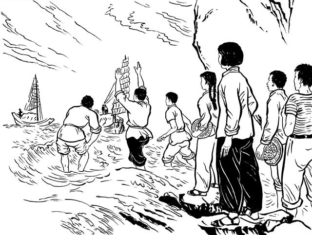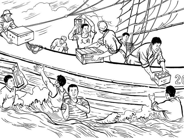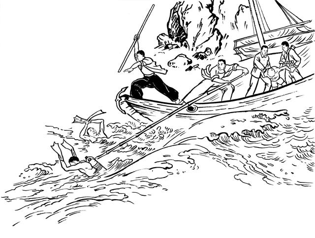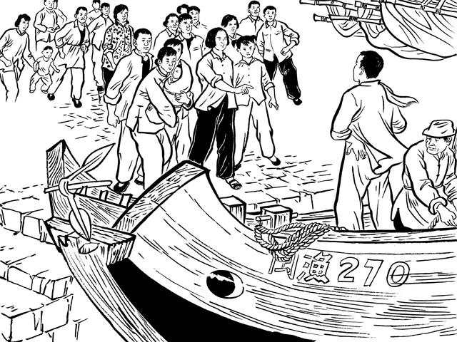 70. 8月27日夜里,3条载满物资的帆船驰向小嶝,在小岛附近海域遇风触礁,船上的木头散向海面,部队首长正带着战士抢捞木头。洪秀枞闻讯后,带着民兵纷纷下水抢捞木头。