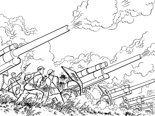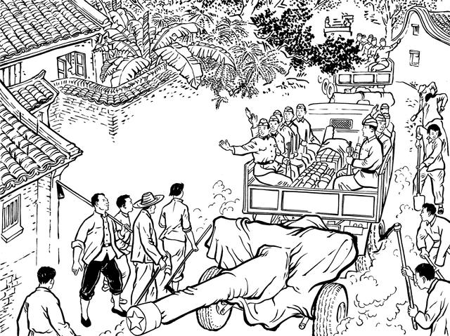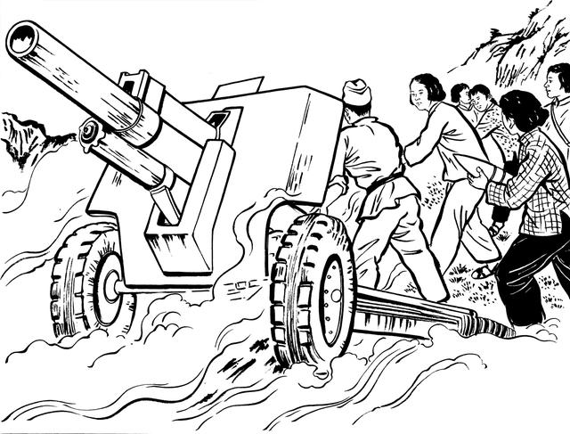 62. 全岛没有一条大路,只有几条高低不平的羊肠小道,那么重的炮,要有几十个人前拉后推,一面拉还要一面修路,艰难前进。经过大家的艰苦奋战,终于把32门大炮和数千箱炮弹搬上阵地,个个都累得筋疲力尽,但没有一个叫苦叫累的。