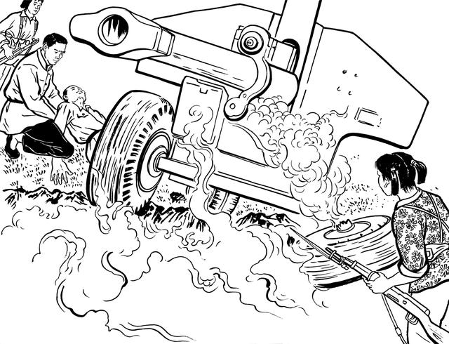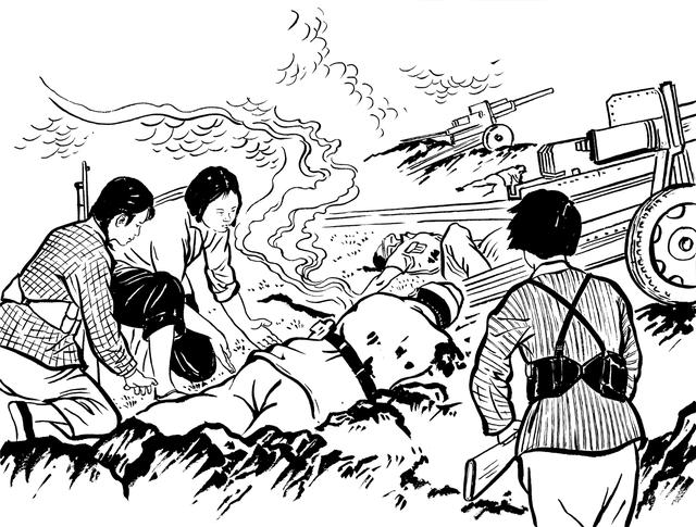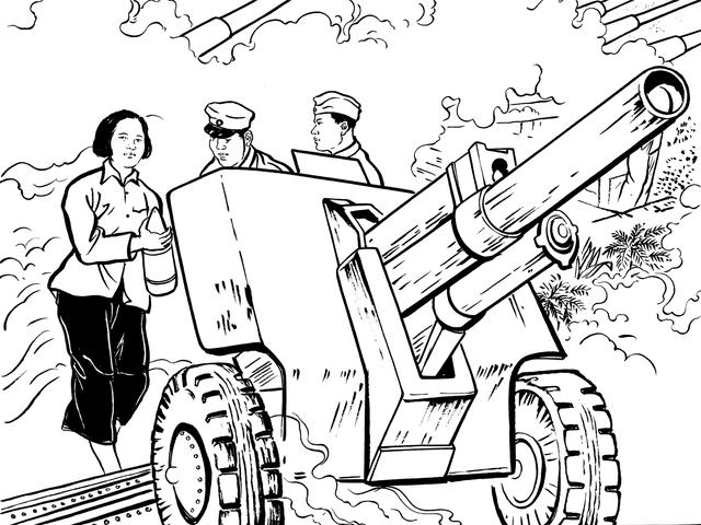 80. 姐妹们化悲痛为力量,把炮扶正,将炸断炮脚处垫上沙包,压上大石块,固定好大炮,大胆地走上炮位,在炮长指挥下,先把炮膛里的炮弹打出去,然后一次又一次地发射炮弹,一直坚持到这场战斗结束。