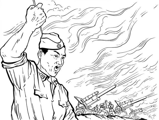 82. 前面山三连炮阵地被炸塌,部队伤亡很大。从南京军校刚毕业的周副连长站在指挥台上沉着地摇动着手中的旗帜,突然身体一颤,原来是一块弹片击中他的腹部。他左手捂着腹部,傲然屹立,准确而响亮地发布射击口令,双眼迸射着愤怒的光芒。