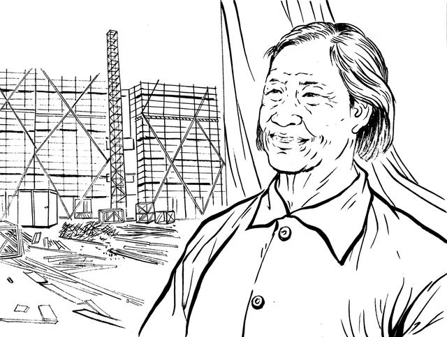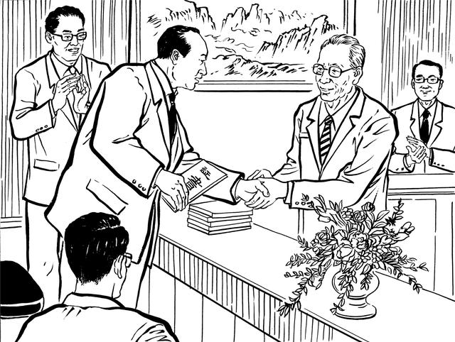 50. 李吉成虽是耄耋老人,但他神采奕奕。他手提一把普通的雨伞作拐杖,身穿褐灰色西装,结淡蓝色领带,整洁得体,显得朴实无华,端庄慈祥,给人以亲切之感。