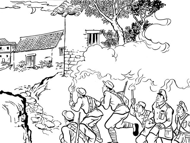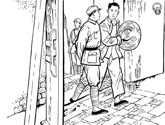 58. 7月12日午夜两点钟,夜深人静,池塘里的青蛙呱呱叫。忽然,村头群犬狂吠,人声嘈杂。不一会儿,大批国民党兵涌进村中,包围了彭金励家,任凭翻来复去地搜查,差点没把屋顶掀掉,怎么也搜不出彭金励来。