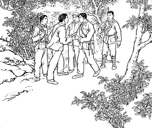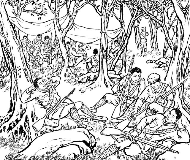 38. 夜间,游击队员们只能依着大树睡觉,遭受风寒和雨水的侵袭。为了对付恶劣的生存环境,大家想办法,利用竹子搭建棚屋,将打土豪得到的土布拿来做活动帐篷,不能生火做饭,遇到野猪、毒蛇也不能开枪射击,以防暴露目标。