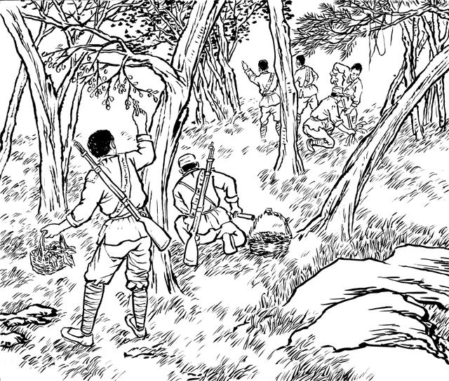 39. 山林里没有油、没有盐,游击队员们只能靠竹笋、野菜、野果充饥,在克服饥寒交迫等困难的同时,还要顽强地爬山走路,寻找各种机会打击敌人,补充装备和食物。他们度过了一段极其艰难困苦的日子。