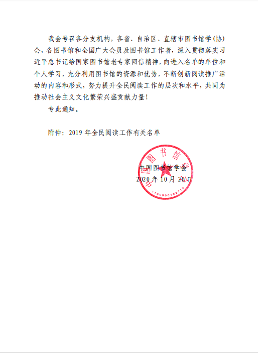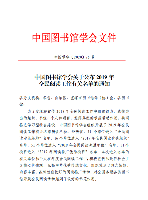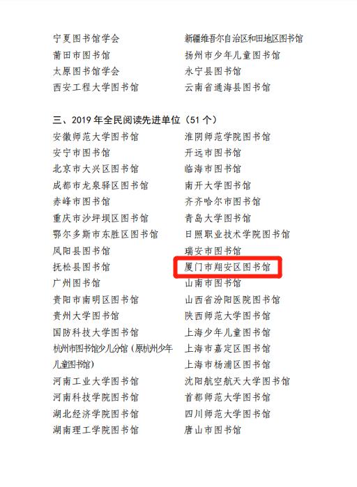 10月20日,根据中国图书馆学会发布的《中国图书馆学会关于公布 2019 年全民阅读工作有关名单的通知》,翔安区图书馆获评“2019年全民阅读先进单位”。