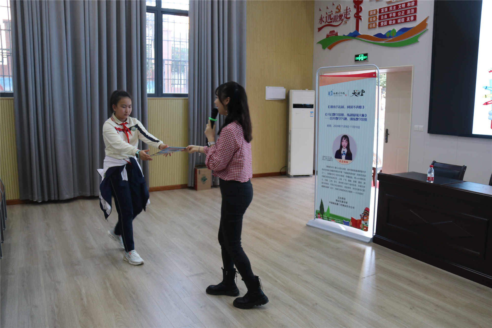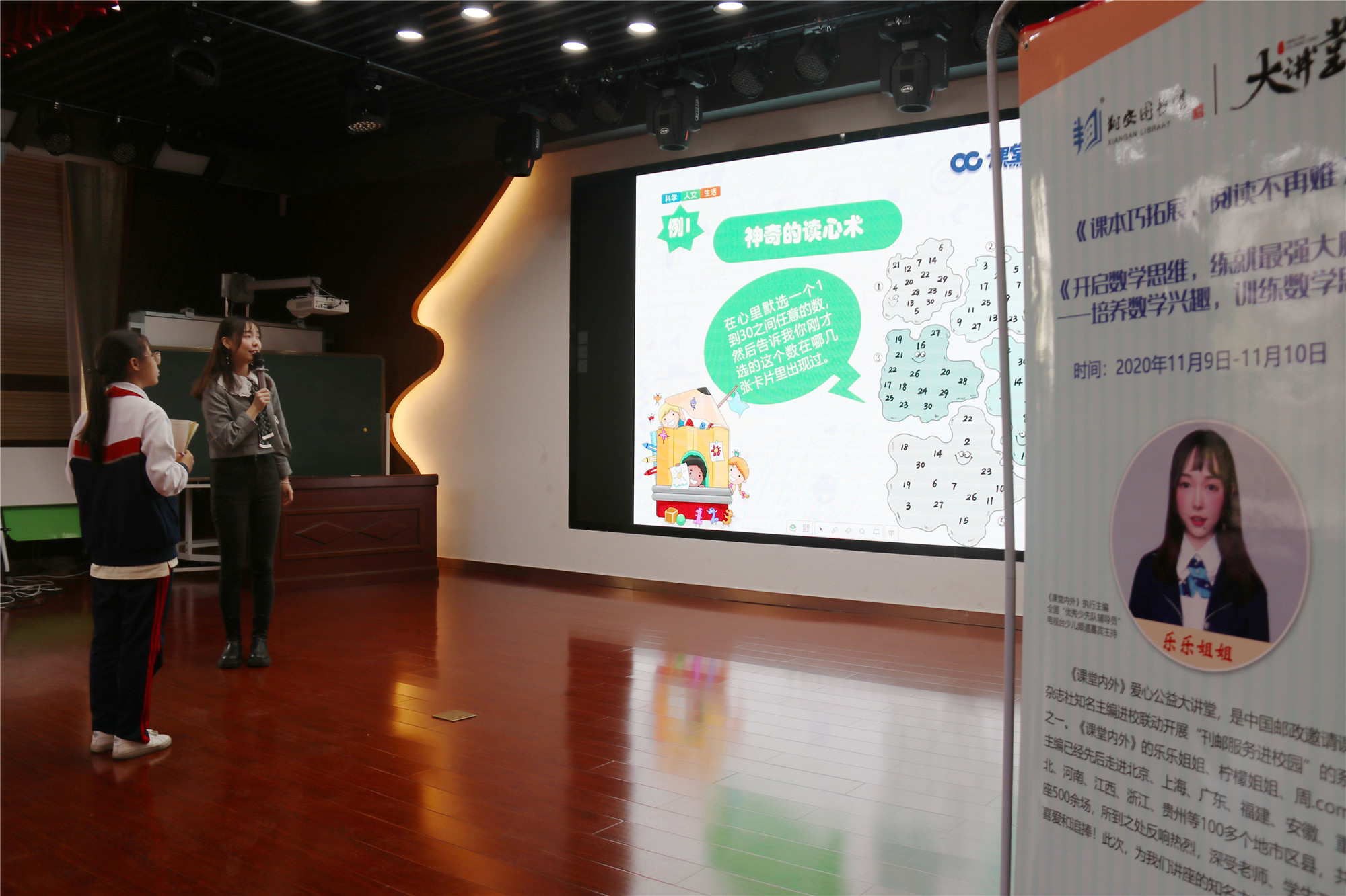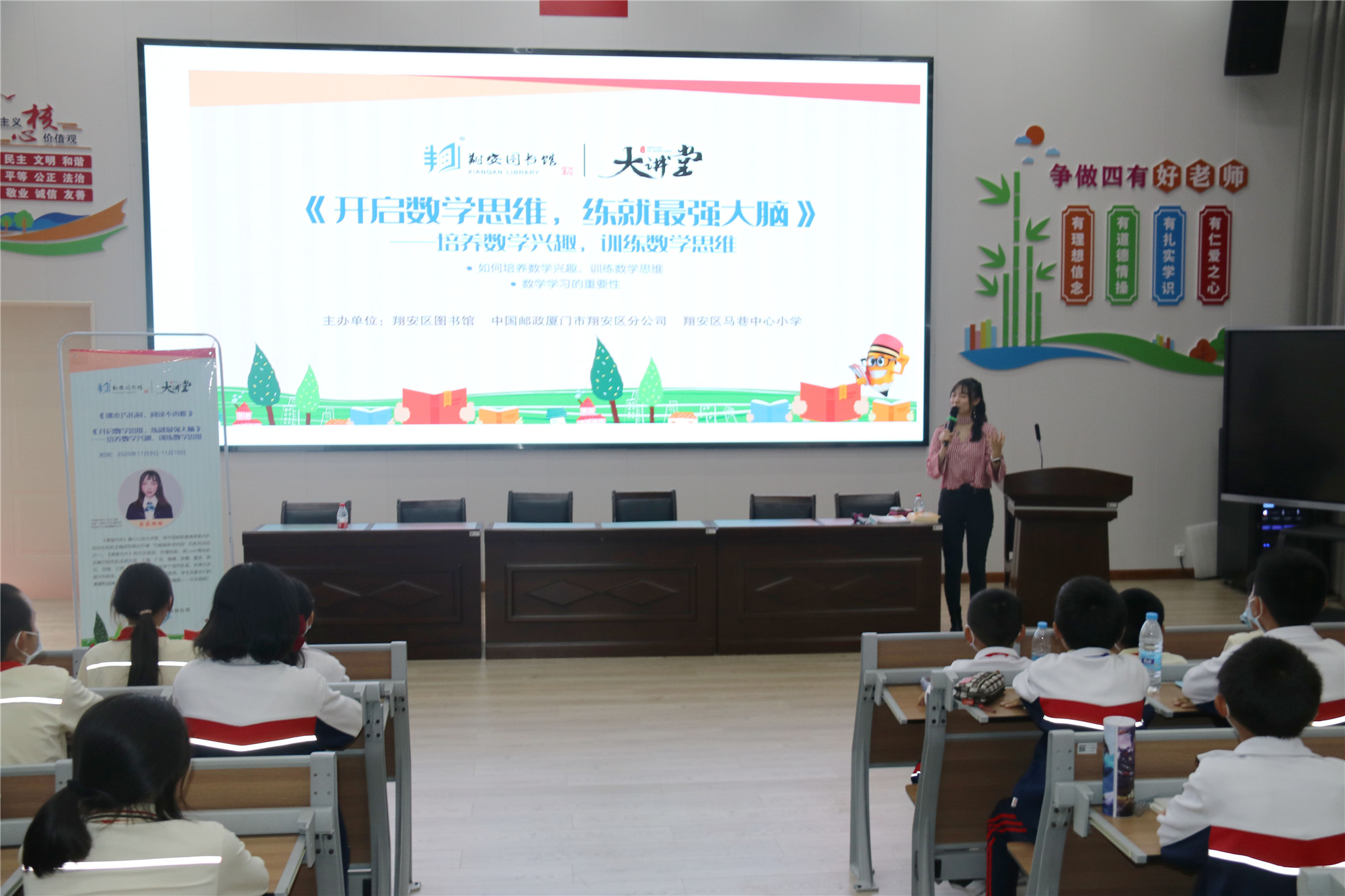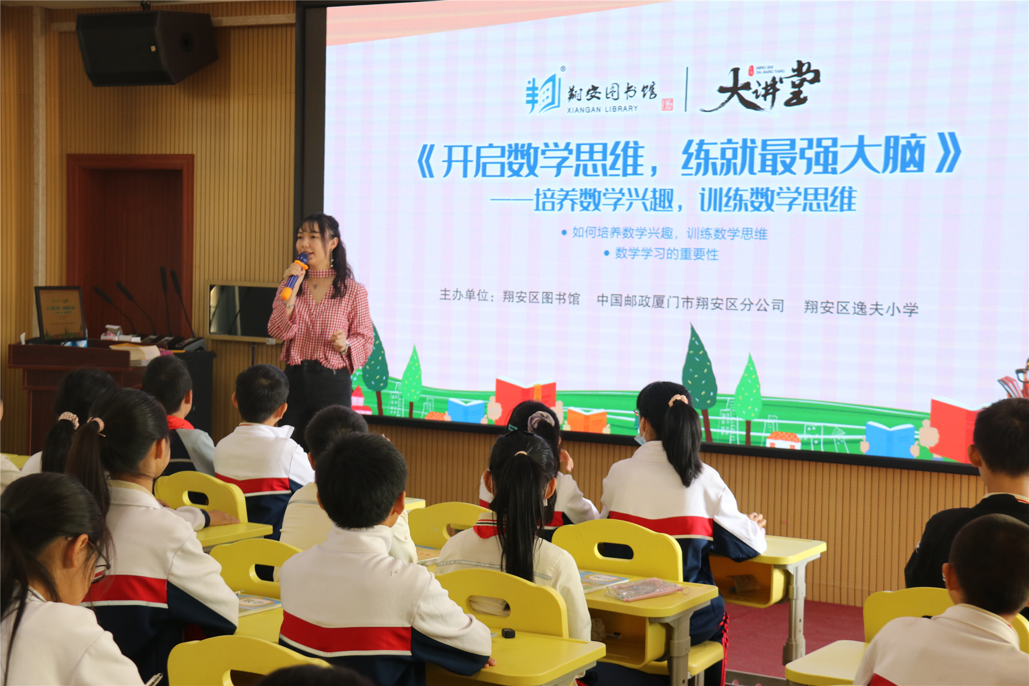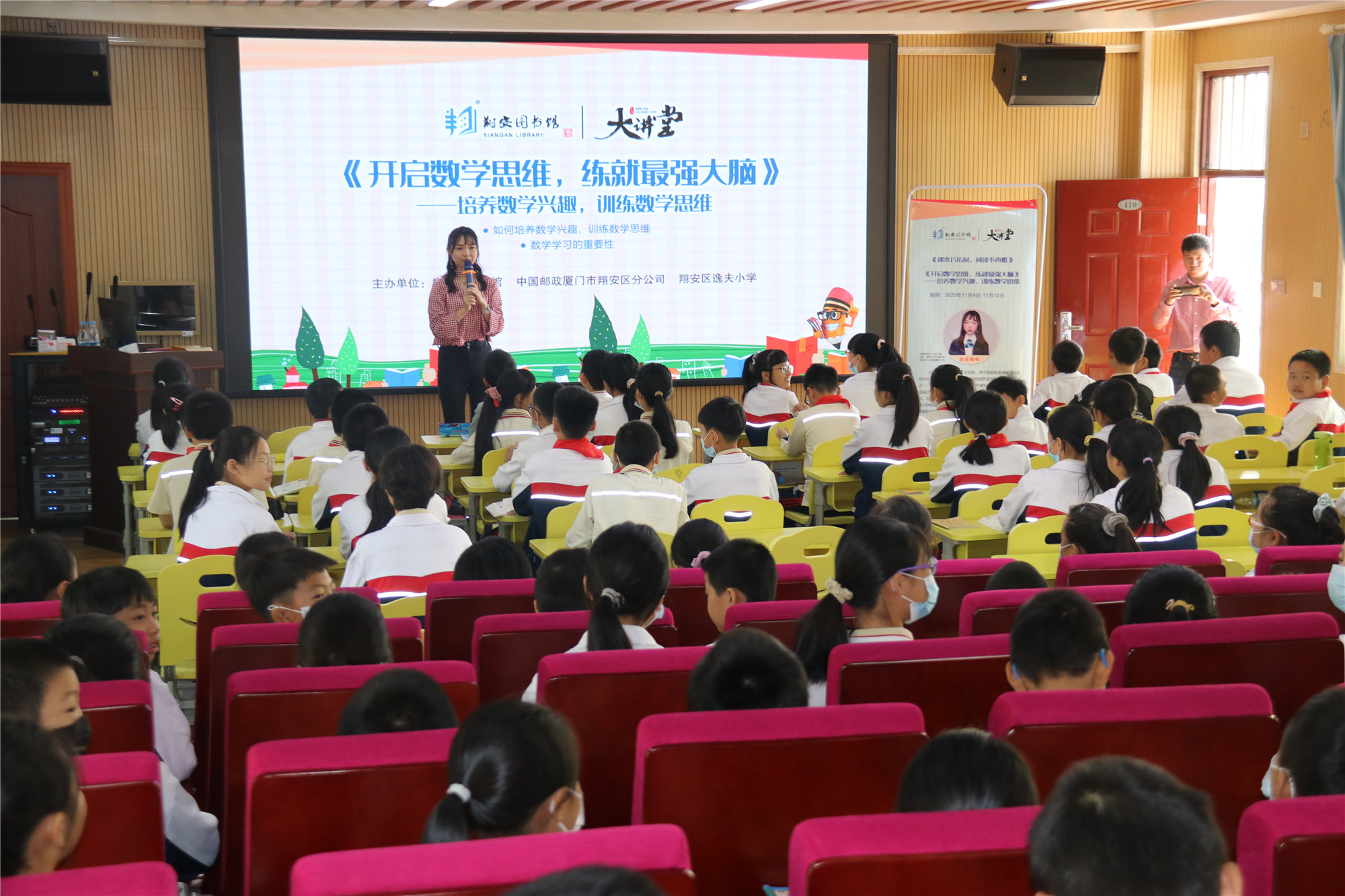 另一以培养数学兴趣,训练数学思维为主题的《开启数学思维,练就最强大脑》讲座,在翔安区金山小学、翔安区逸夫小学、翔安区马巷中心小学开展。乐乐姐姐教学生们用眼睛“看”数学,从《西游记》里的数学知识和在生活里发现数学问题;用游戏“玩”数学,从神奇的读心术和硬币趣题引发思考;用作文“写”数学,写生活里面的数学知识、写数学游戏和数学课、写数学童话。并向他们讲述了数学学习的重要性:数学是成绩的火车头,火车头跑得快,其他学科以及总体成绩才会快速提升。