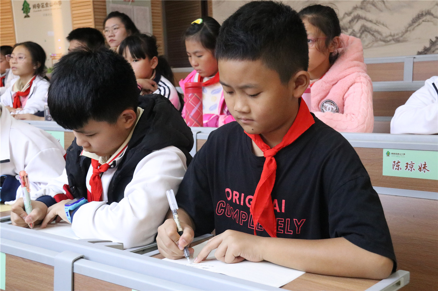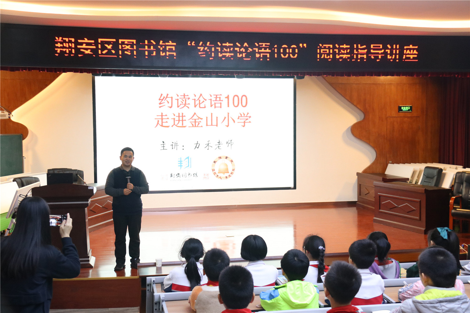 讲座由翔安区义雅书院院长力禾老师主讲。讲座伊始,力禾老师巧借校名“金山小学”四个字的由来展开介绍,一下子吸引住学生,引起学生的学习兴趣;接着,自然过渡到“人”与“仁”音同意相近,向学生讲述何为人,从而引入《论语》。