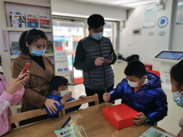 比赛环节是刺球大比拼,盒子里装满了小气球,参考游戏的人拿竹签往盒子上的小孔里戳,戳到一个气球加5分,全部戳中另加10分,最后以孩子跟家长的分数相加的总得分列名次。