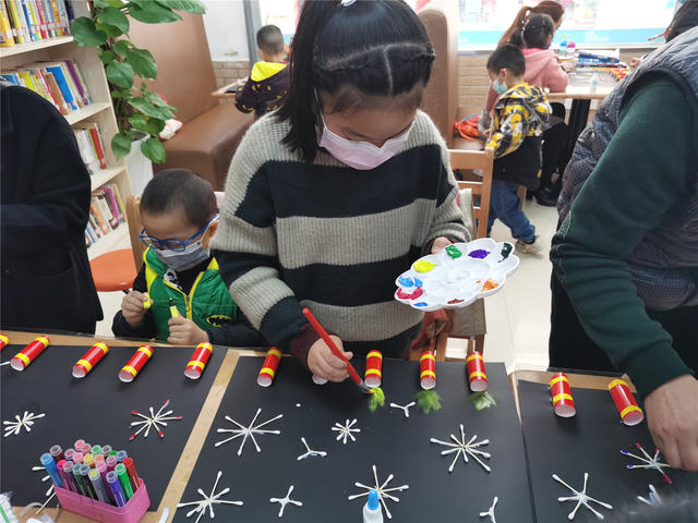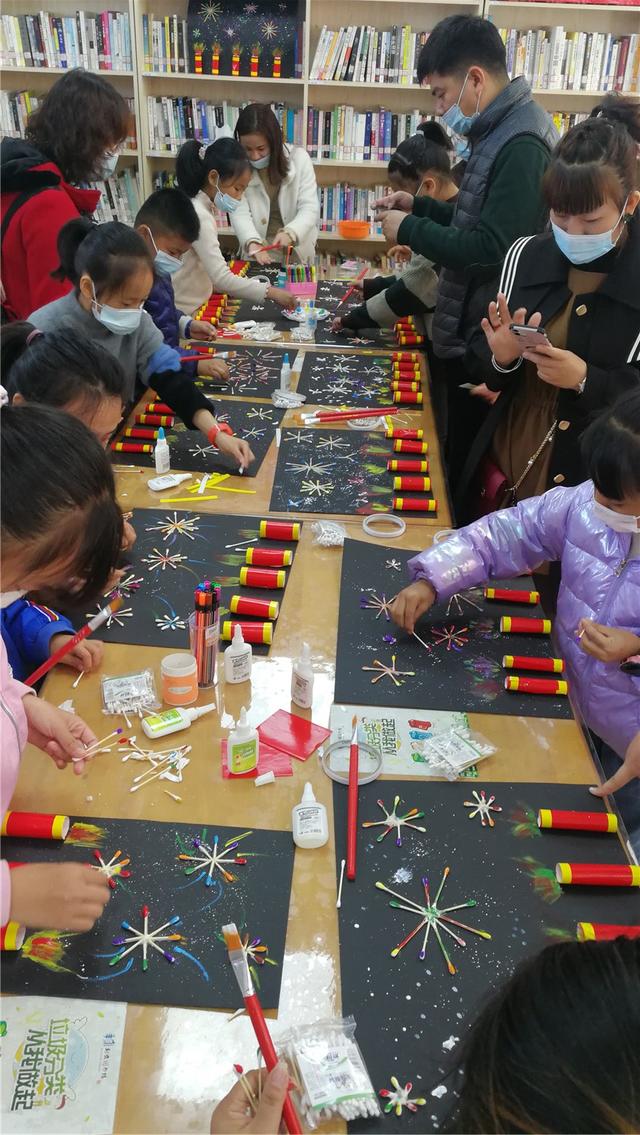 亲子手工部分。我们教孩子们制作的是:燃放的烟花。由我们工作人员在上面教,家长在小朋友旁边帮忙,配合小朋友动手完成手工制作。