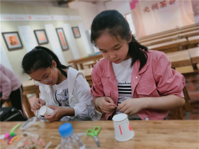 读完书后,小读者们在老师的指导下,发挥天马行空的想象力,利用废旧纸杯做成小花篮或小笔筒,既培养孩子们动手、感知能力,激发他们的想象力、创造力,又提高了他们的环保意识。