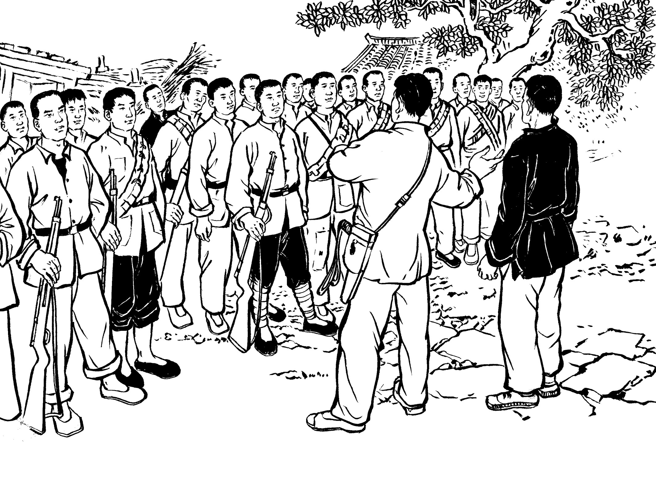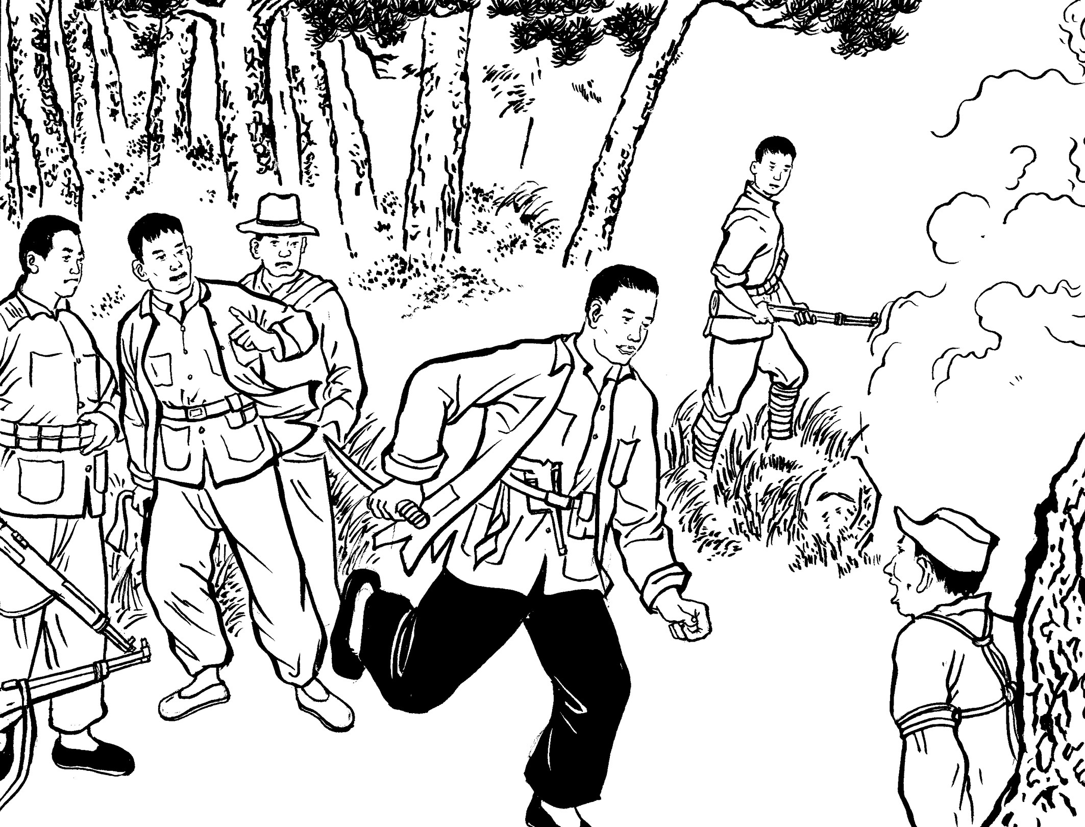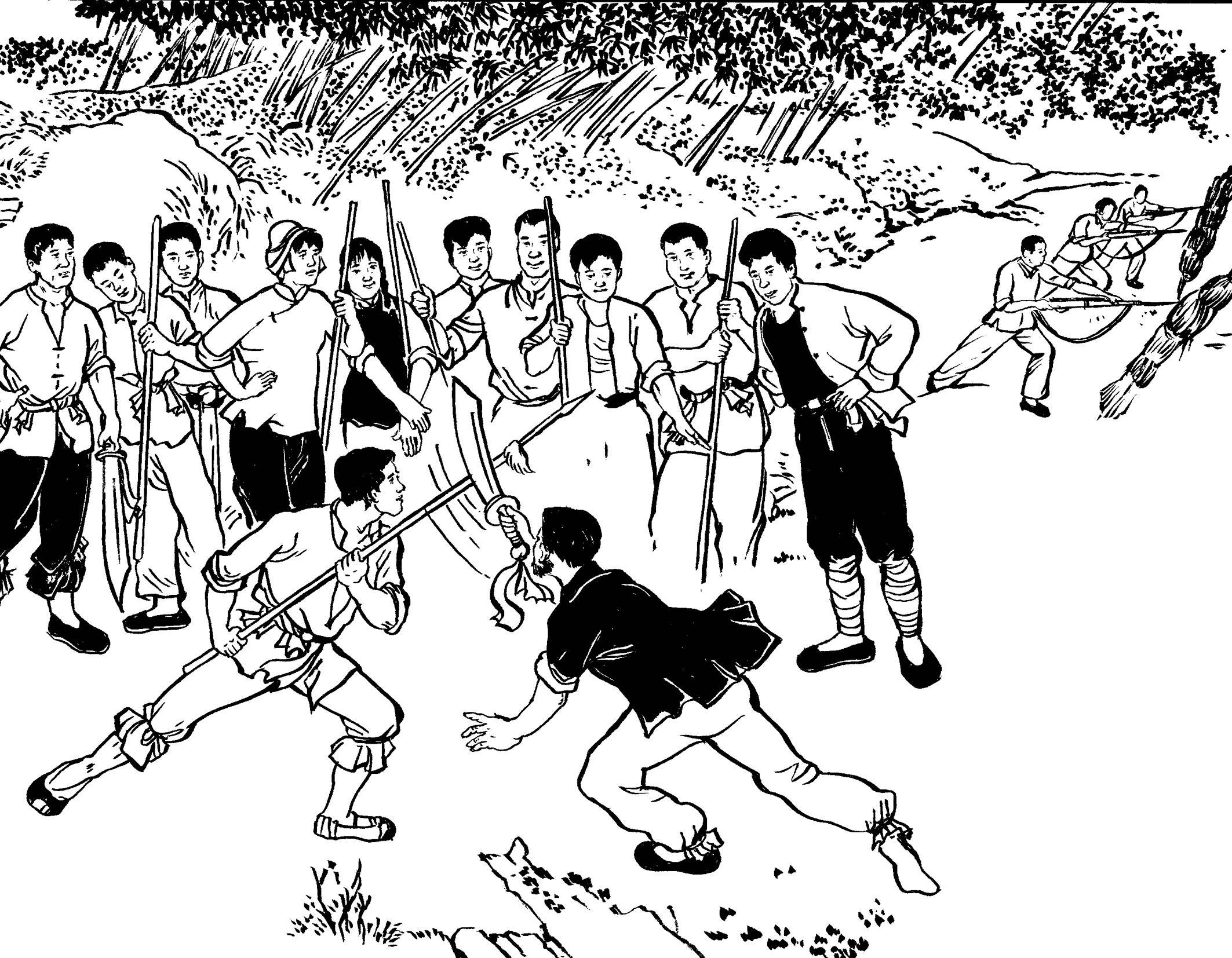 105. 游击队在加塘埔开辟了一个宽阔的训练场。每天,在陈诚志和陈耀东的带领下,队员们有的对着稻草人练习拼刺刀,有的对着树桩练习砍大刀,有的以两人为一组进行肉搏训练,有的投弹、射击……激昂的喊杀声此起彼伏,在山谷里久久回荡。