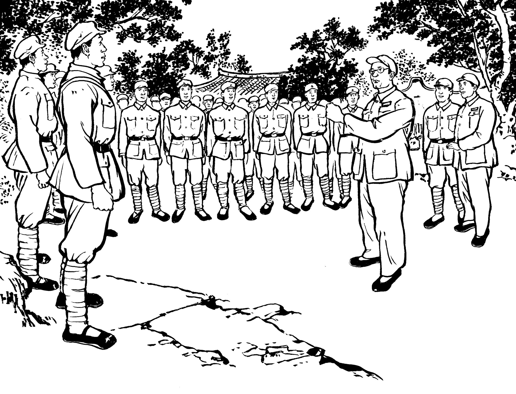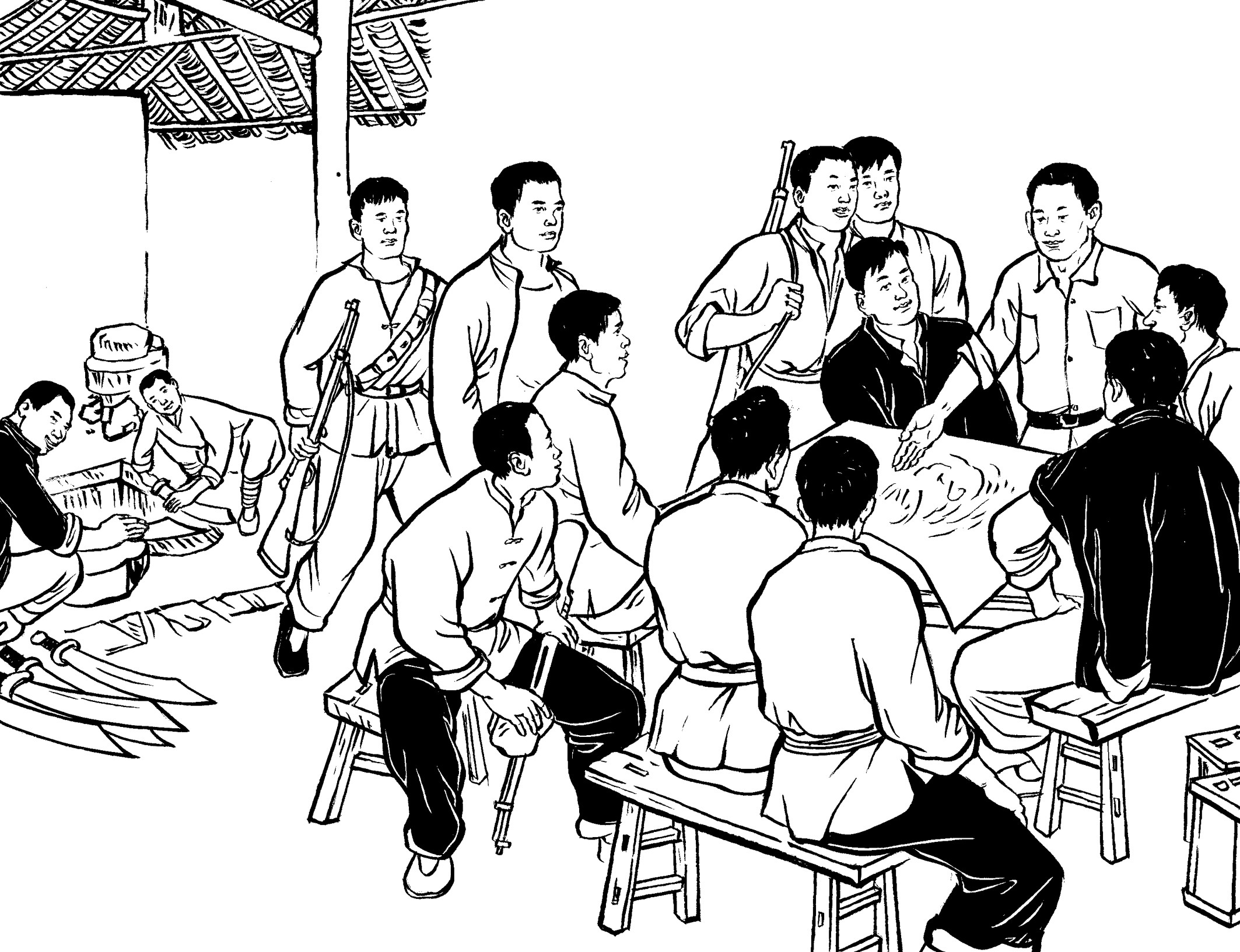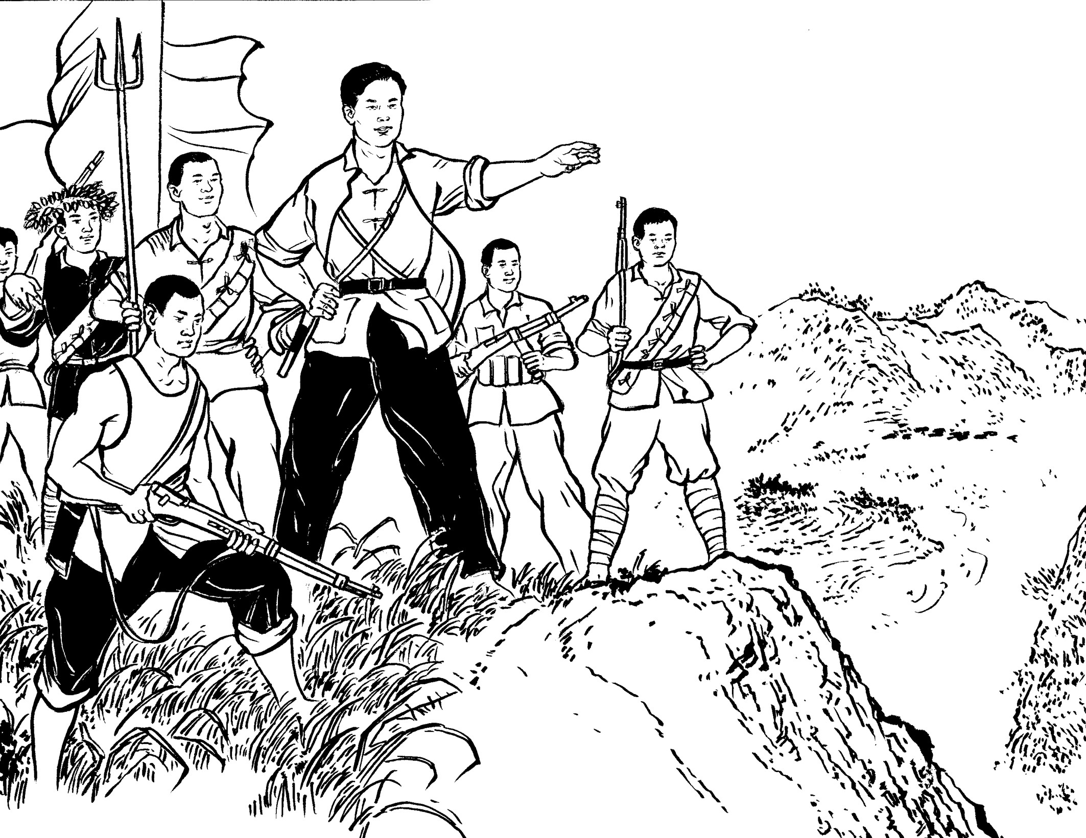 105. 游击队在加塘埔开辟了一个宽阔的训练场。每天,在陈诚志和陈耀东的带领下,队员们有的对着稻草人练习拼刺刀,有的对着树桩练习砍大刀,有的以两人为一组进行肉搏训练,有的投弹、射击……激昂的喊杀声此起彼伏,在山谷里久久回荡。