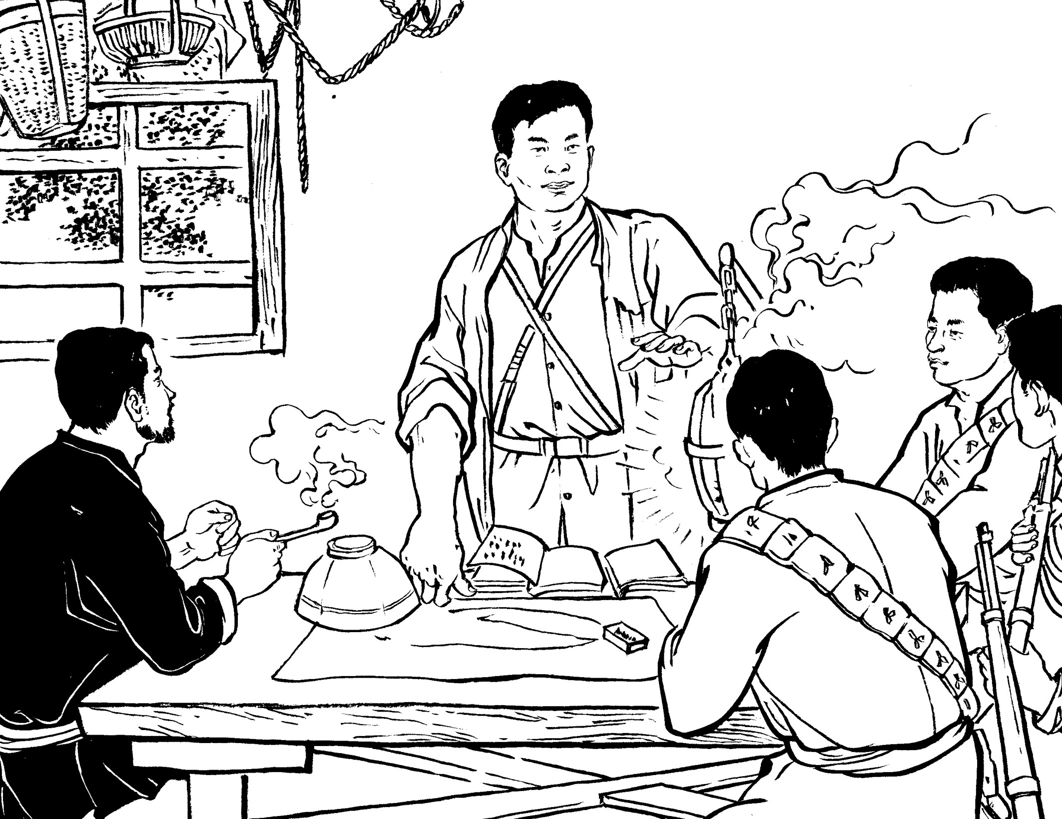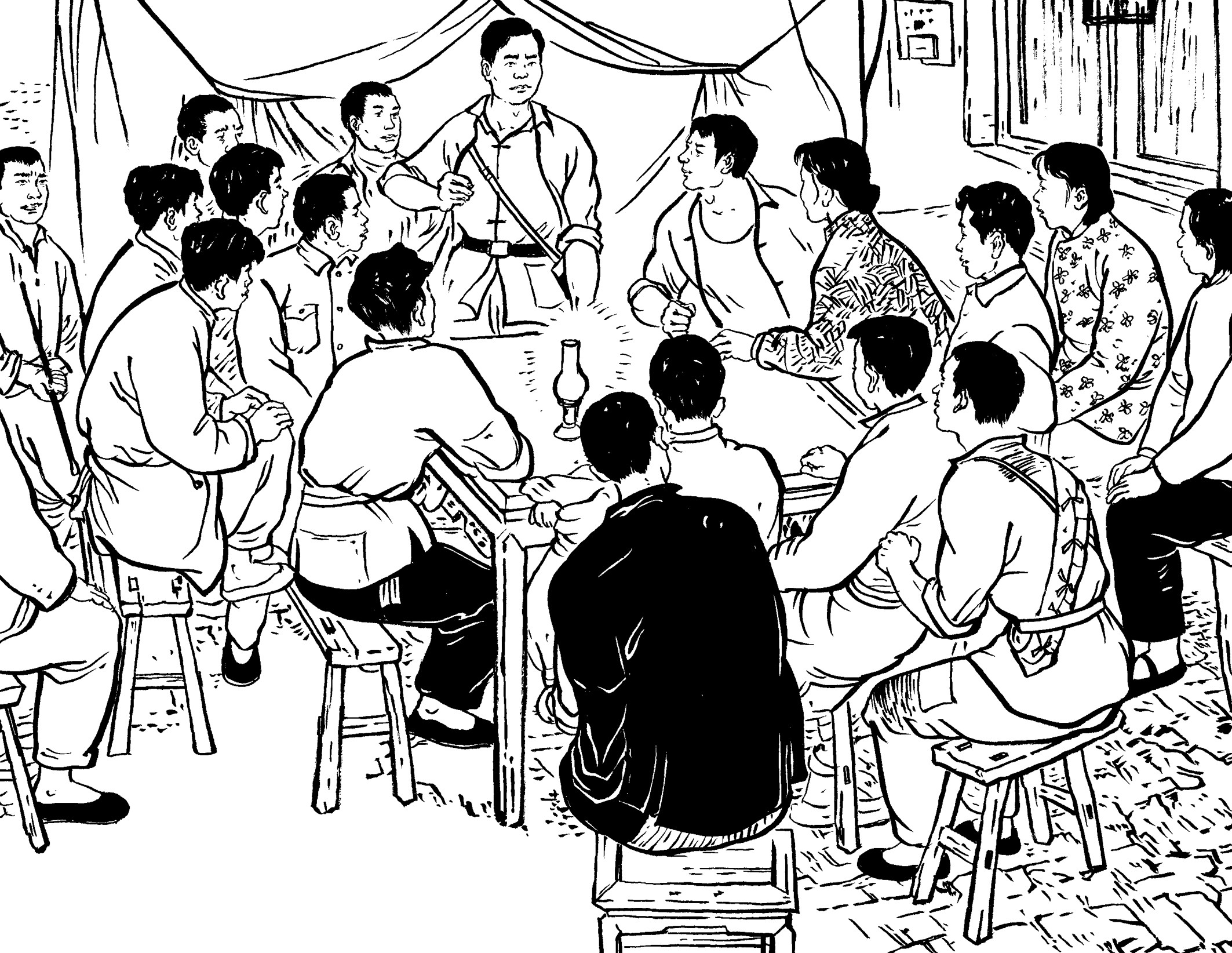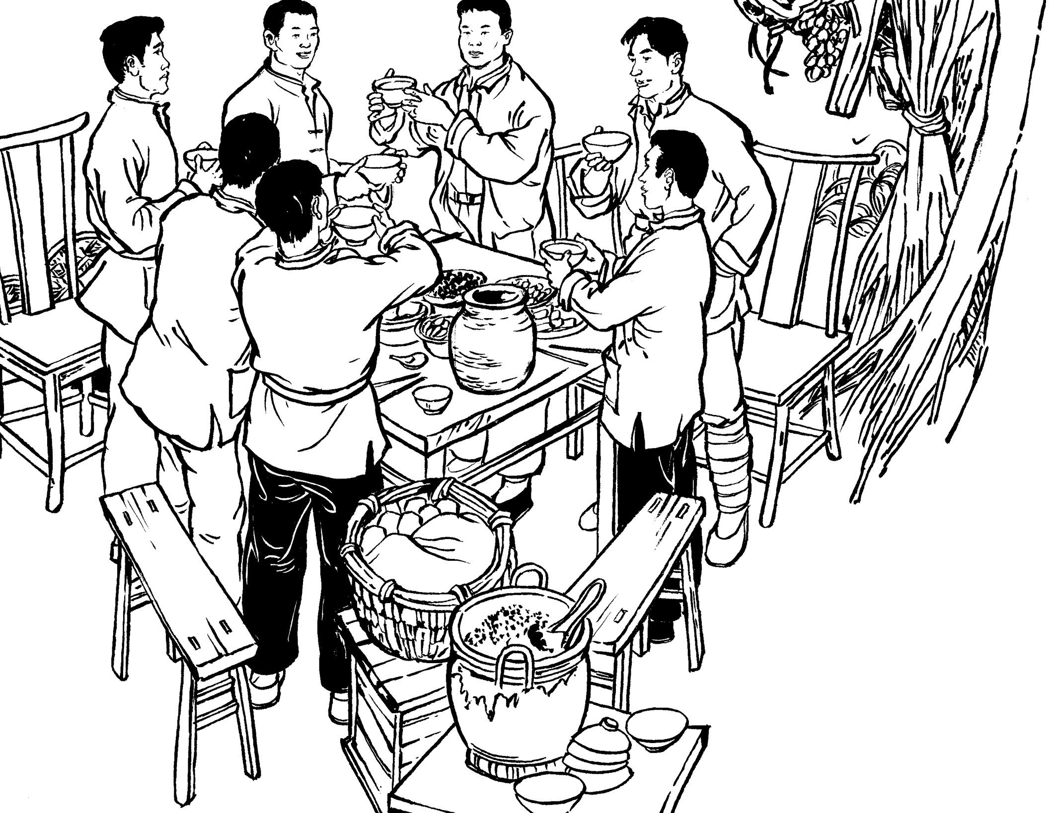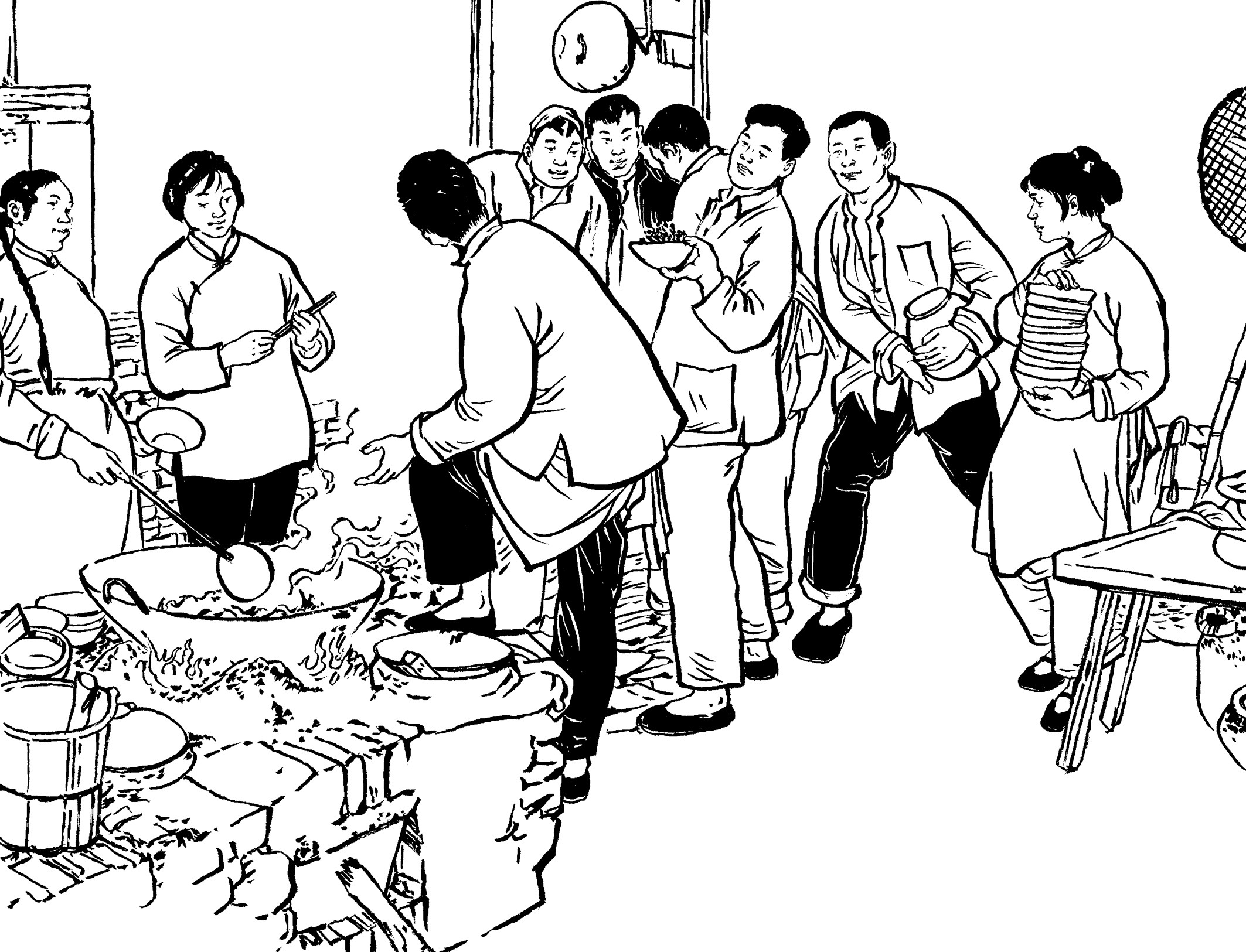90. 队员们回到大帽山加塘后,已是凌晨了。女青年陈束、黄桃、吕扦、沈乖、陈纲、陈罪各自从家里带来食材,煮了一桌庆功宴:南瓜饭、麦粉煎、兜面、花生米、观音菜、豆腐和家藏的糯米酒,犒劳凯旋而归的勇士们。