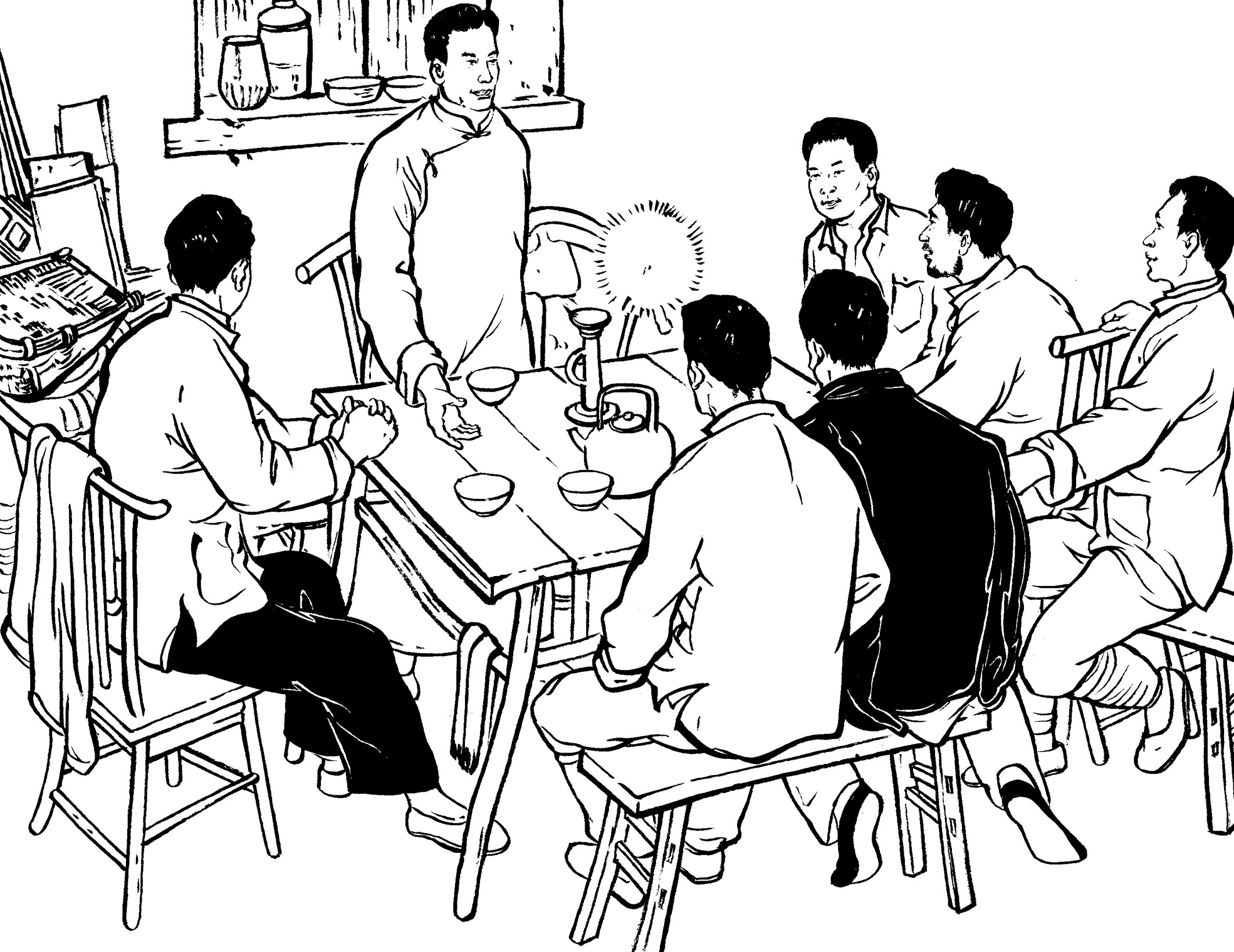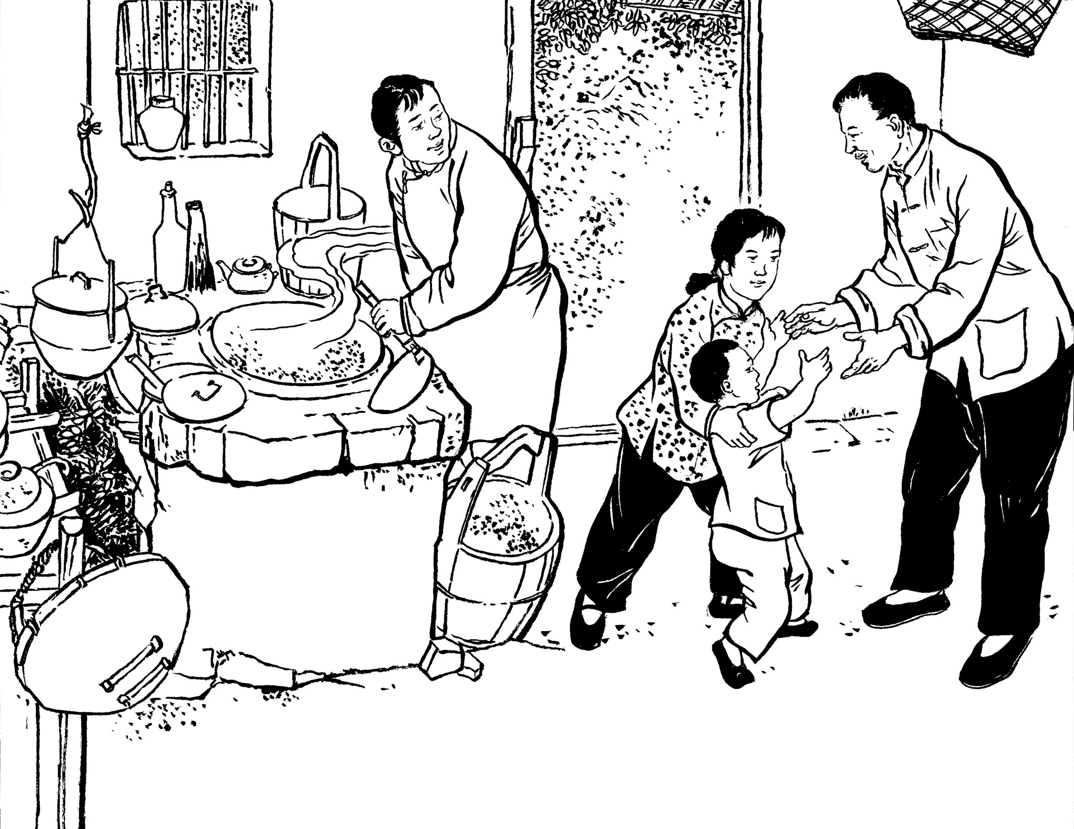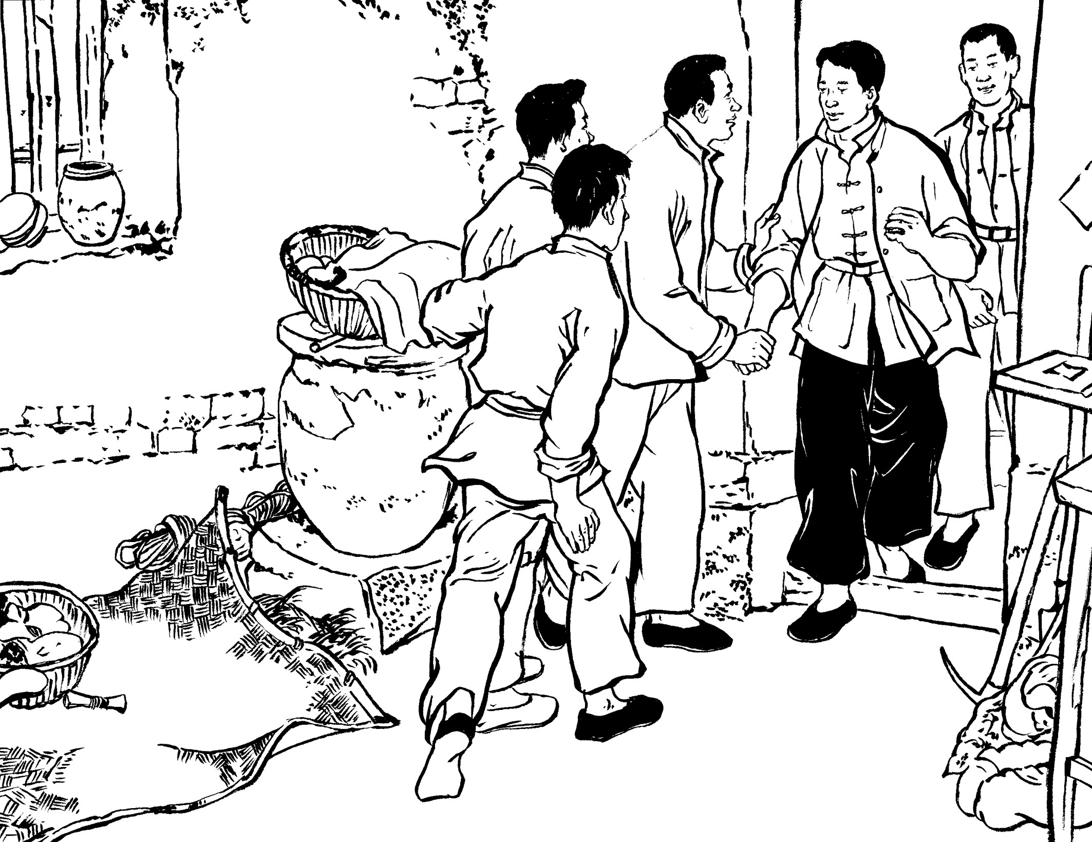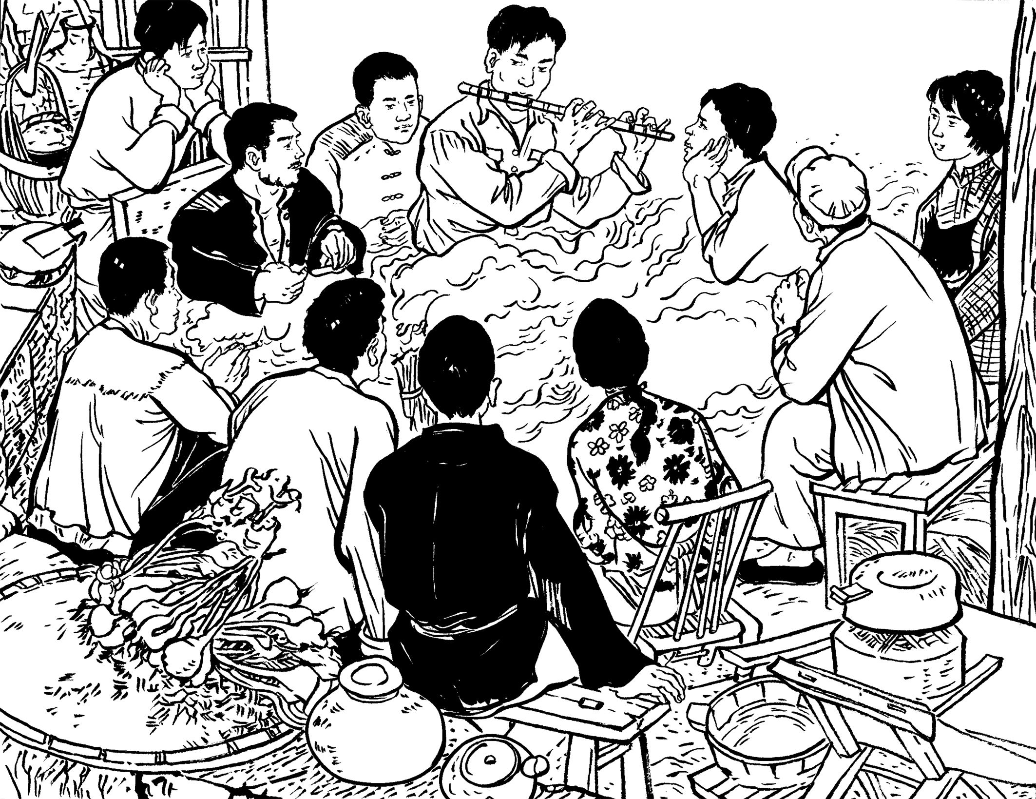 90. 队员们回到大帽山加塘后,已是凌晨了。女青年陈束、黄桃、吕扦、沈乖、陈纲、陈罪各自从家里带来食材,煮了一桌庆功宴:南瓜饭、麦粉煎、兜面、花生米、观音菜、豆腐和家藏的糯米酒,犒劳凯旋而归的勇士们。