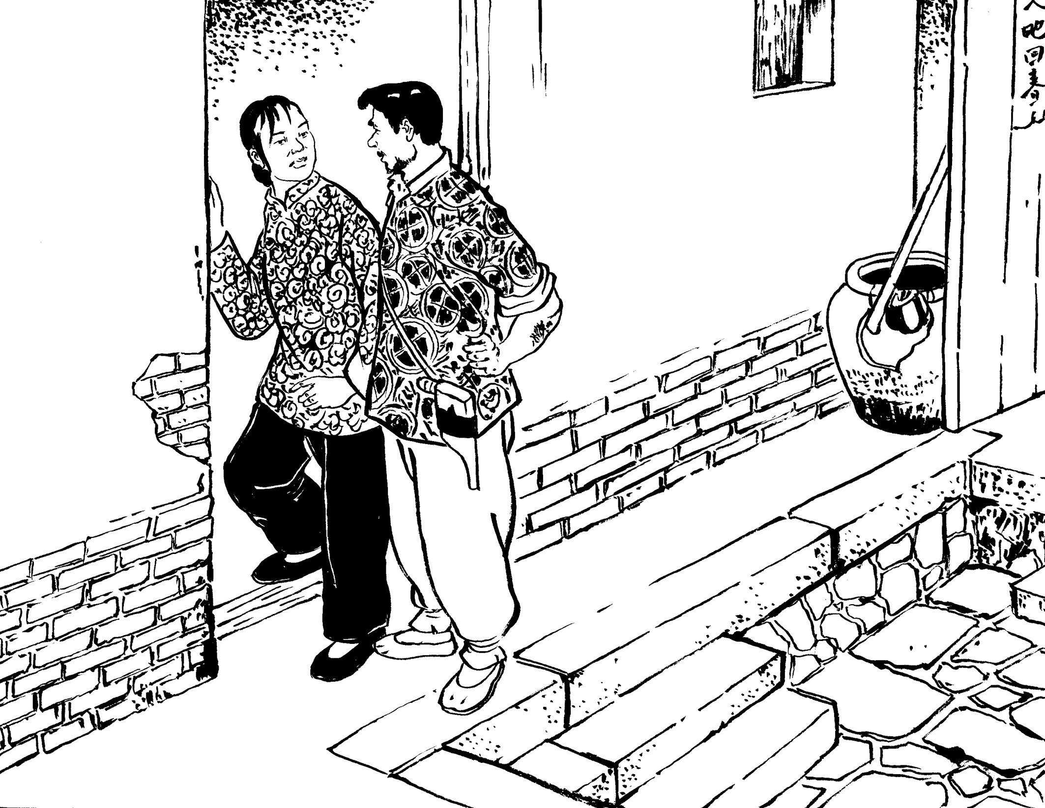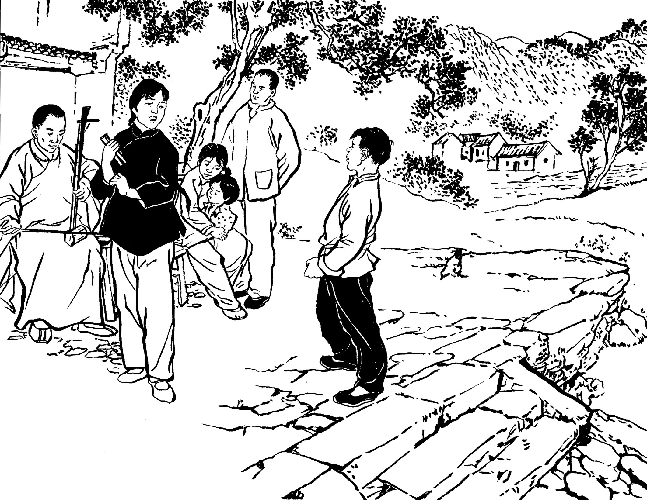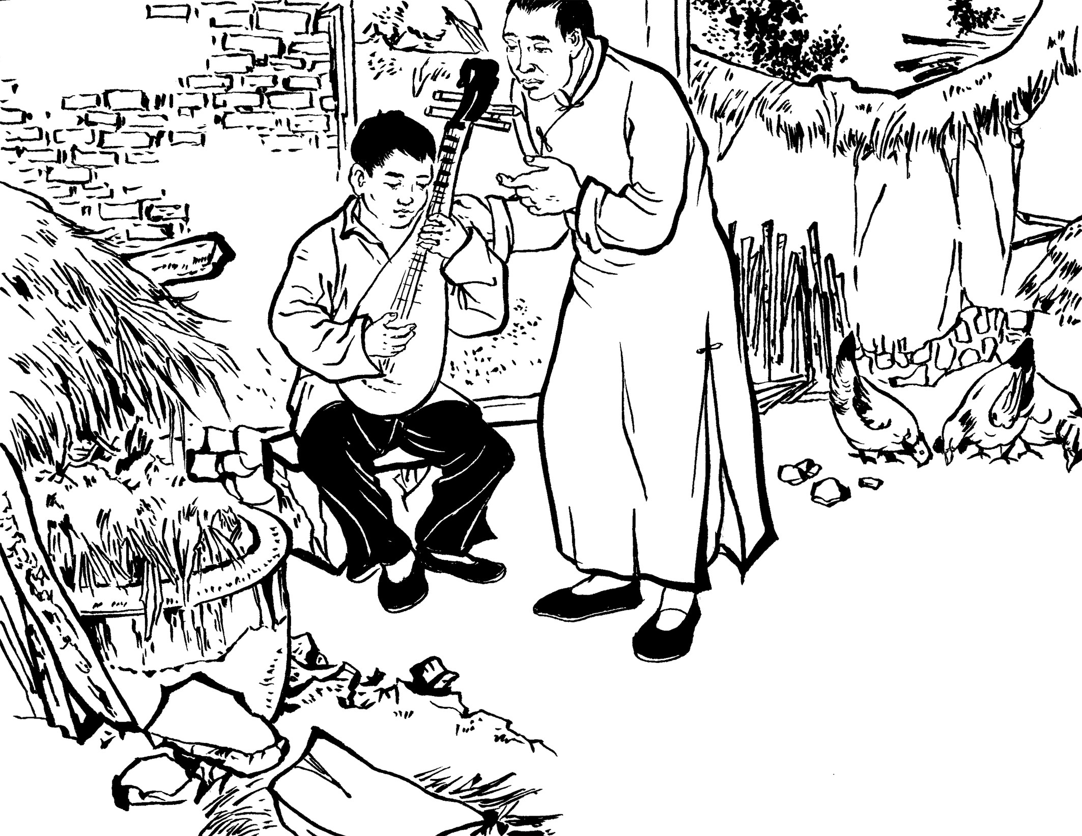 53. 王朝阳兄弟入住黄章约家。王水法出生于1928年11月,小大哥11岁, 长兄为父,他能与大哥并肩战斗,感到特骄傲。白天,兄弟俩上山下地帮黄家干农活;夜晚,黄章约的“快乐团队”都集聚到家门口,弹唱三弦古曲,听王朝阳介绍革命形势。