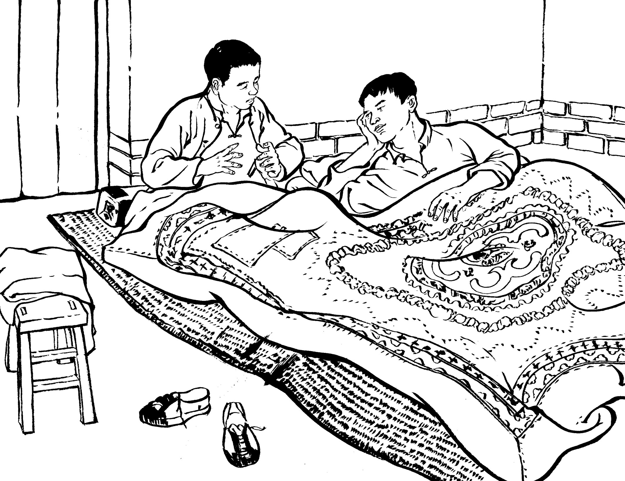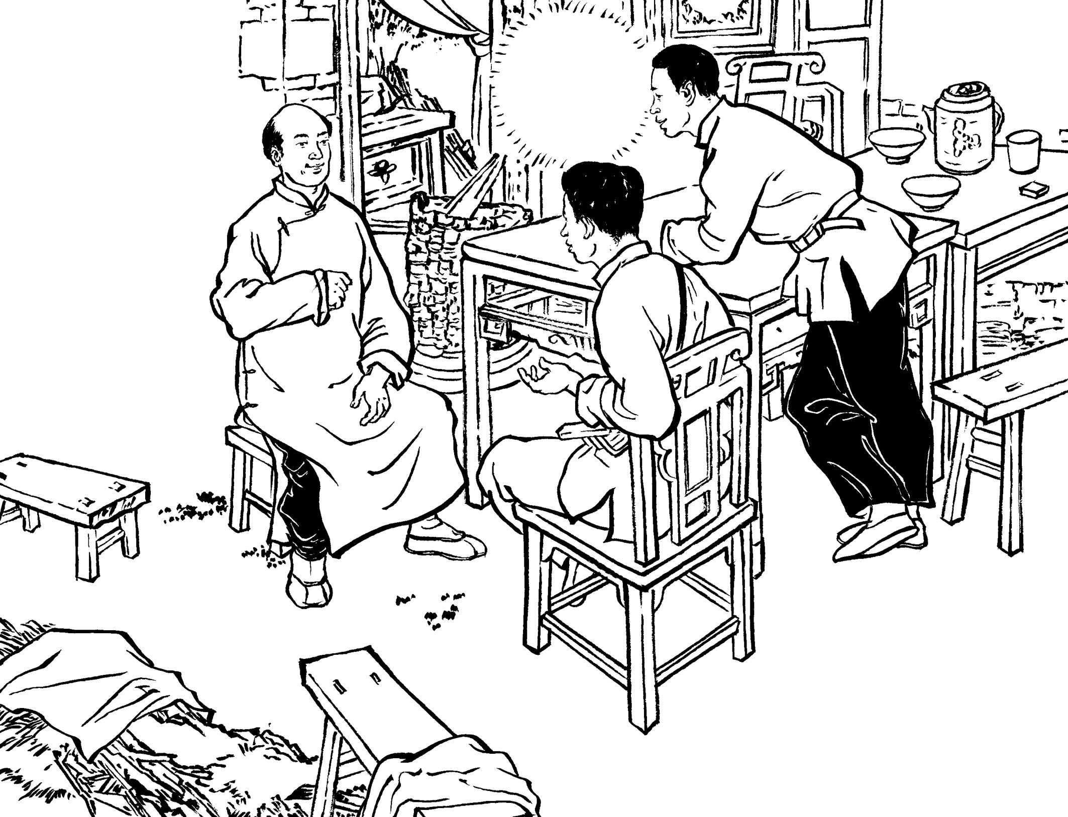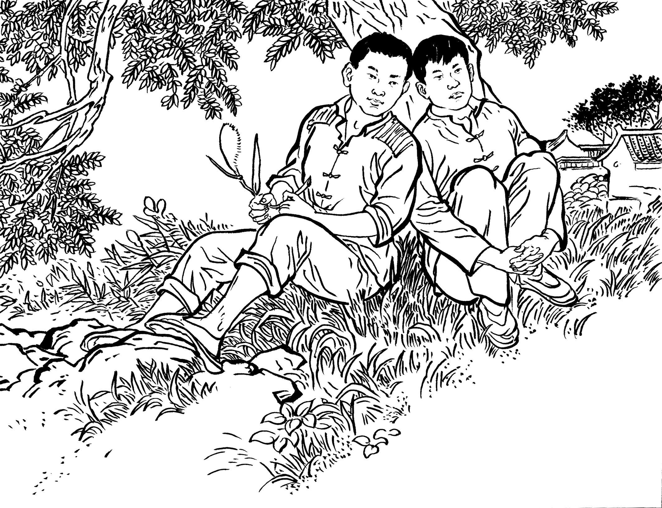 53. 王朝阳兄弟入住黄章约家。王水法出生于1928年11月,小大哥11岁, 长兄为父,他能与大哥并肩战斗,感到特骄傲。白天,兄弟俩上山下地帮黄家干农活;夜晚,黄章约的“快乐团队”都集聚到家门口,弹唱三弦古曲,听王朝阳介绍革命形势。