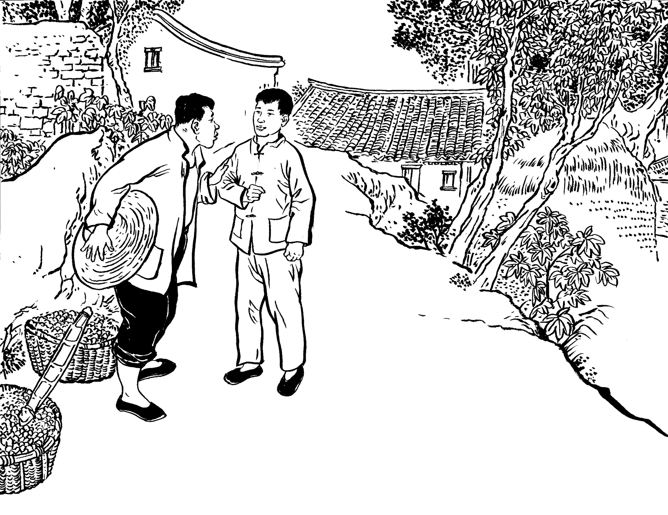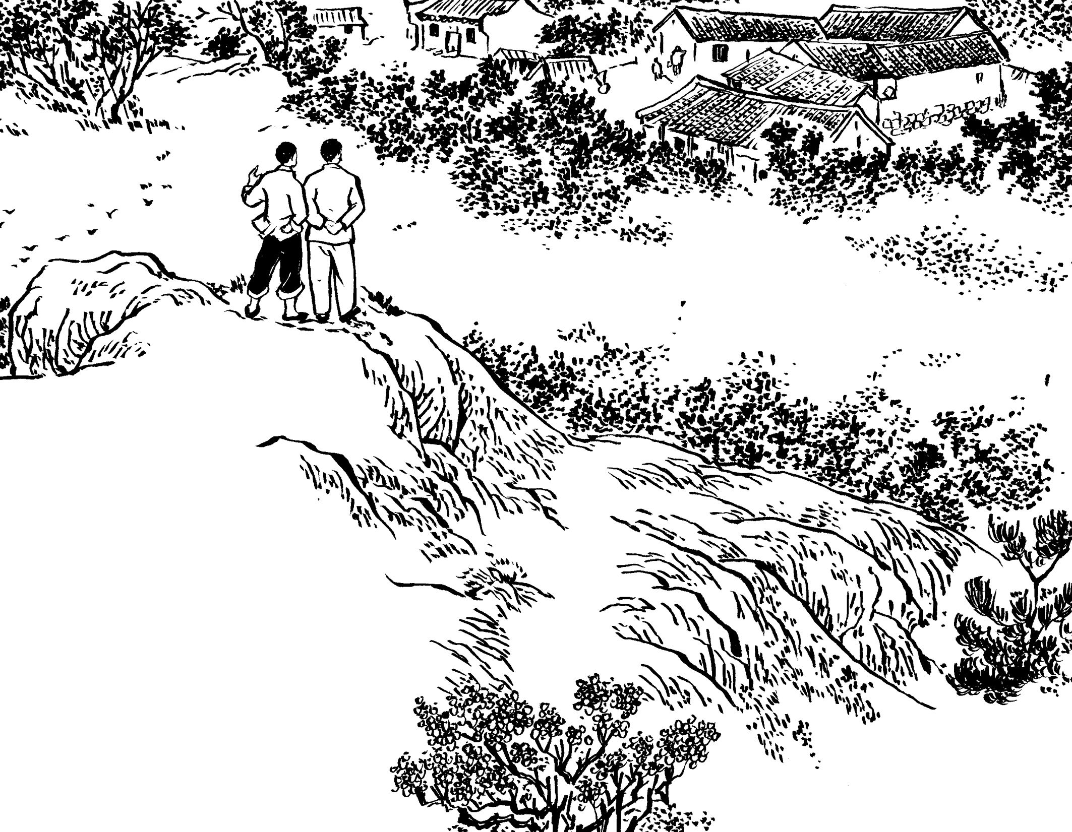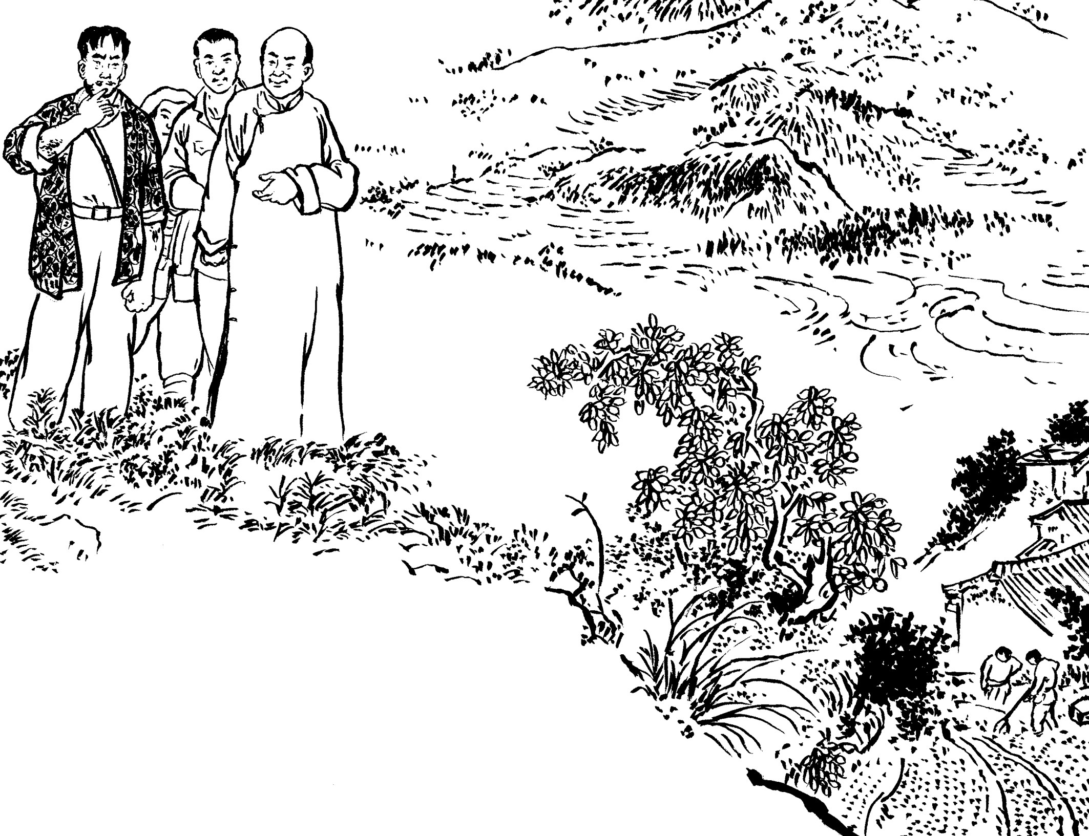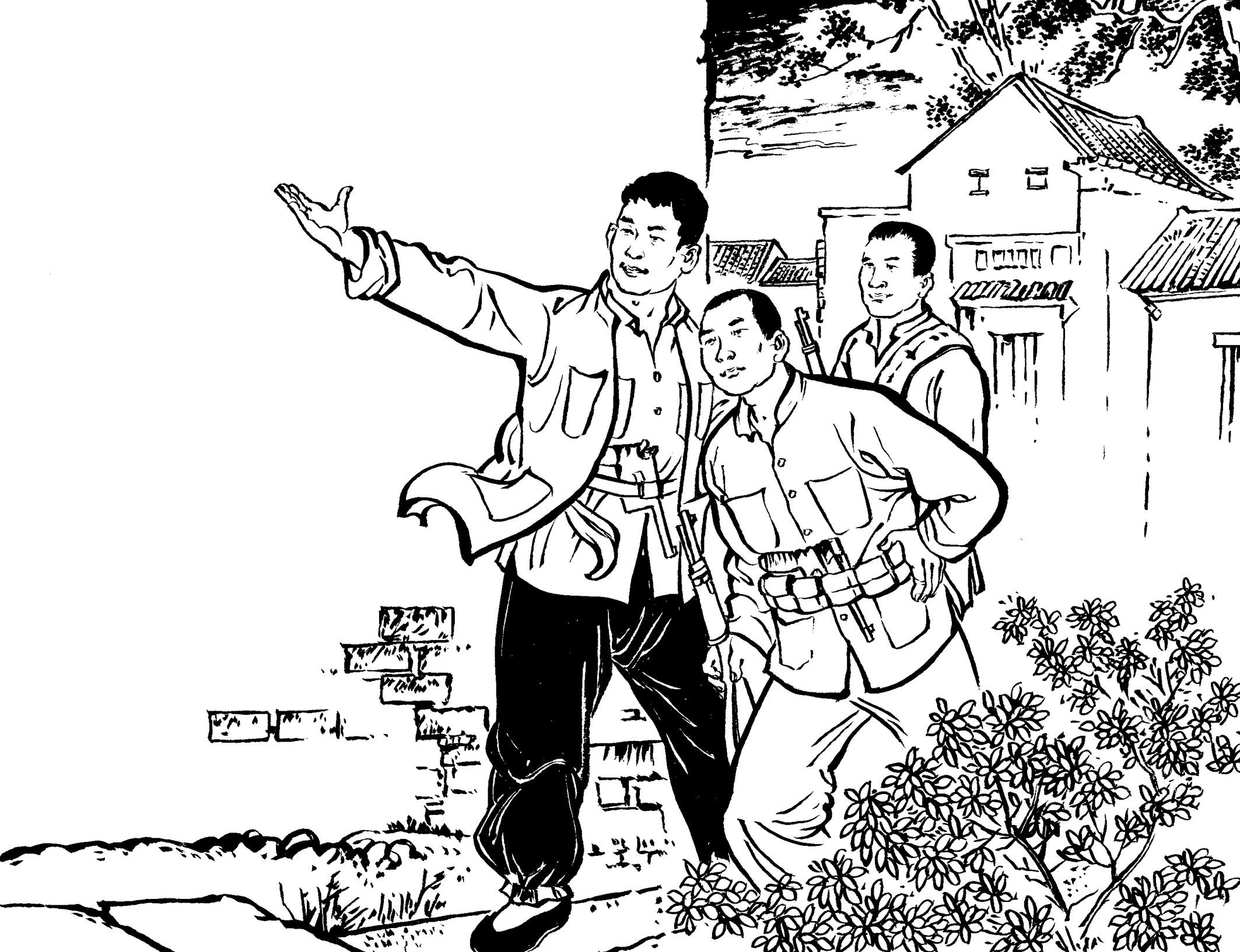 59. 保长黄天香走在队伍前面开路,望见黄章约和王朝阳兄弟正在路旁的田间锄草积肥,便巧妙地通风报信:“李队长,黄章约的家离这儿不远了,昨晚有人见他回来了,今天应该在家里。”
