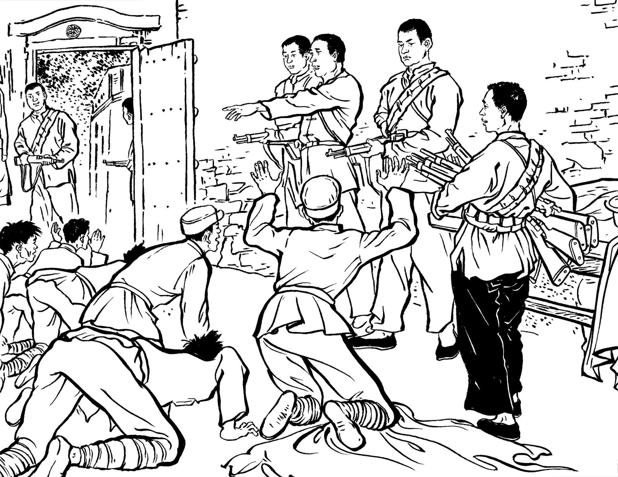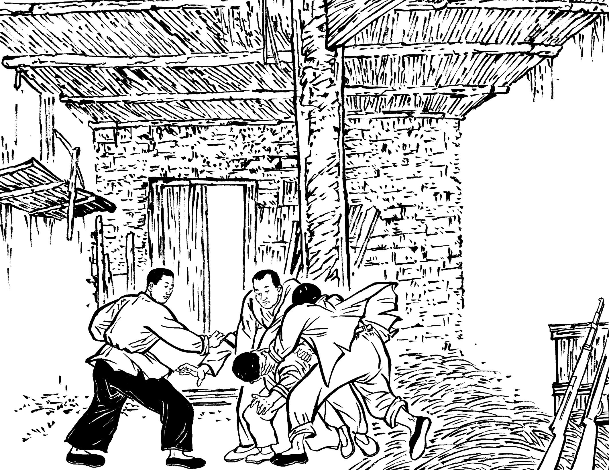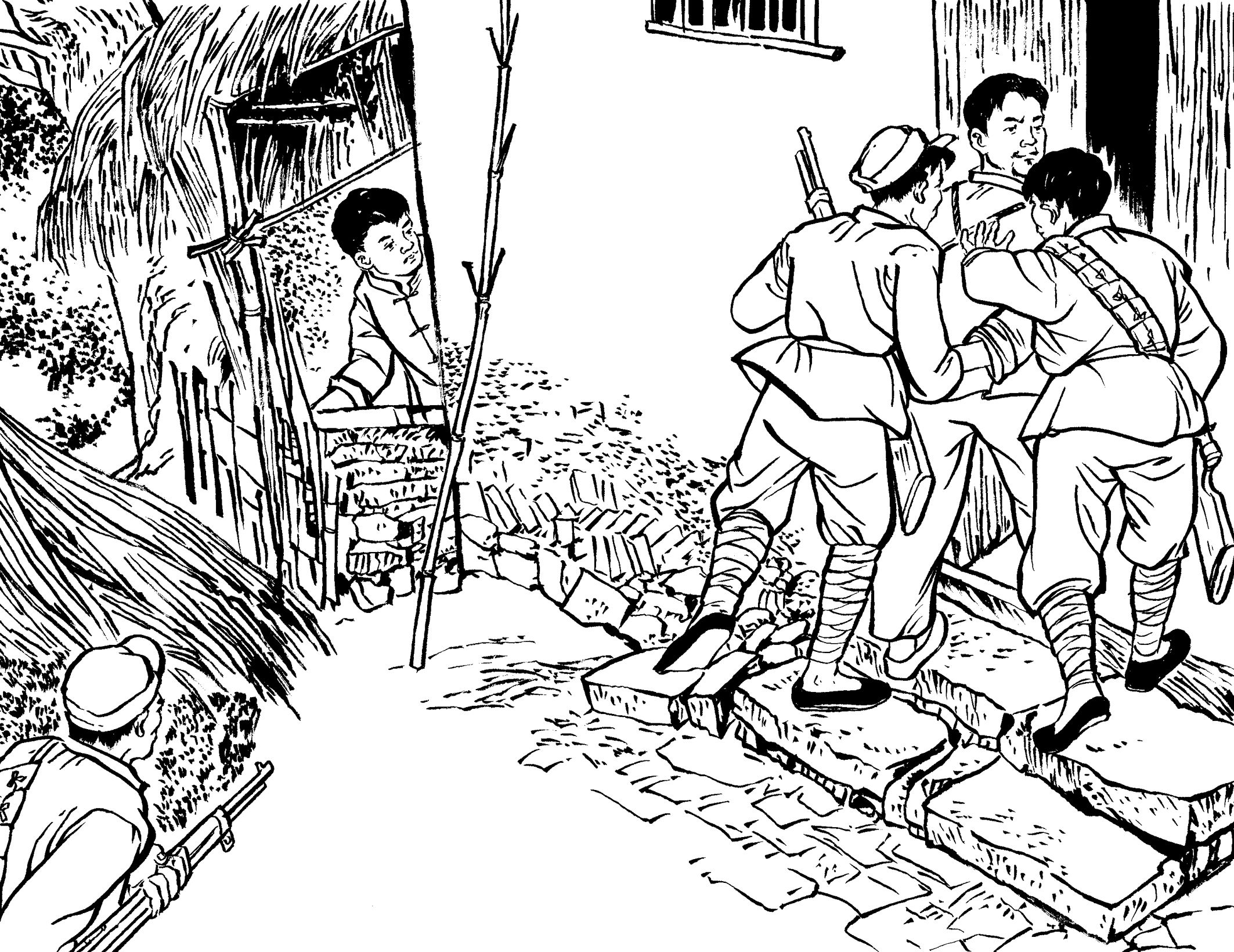 82. “咻——切,咻——切,咻咻切……”随着黄章约发出三声鸟叫声,李祖乃从草垛下悄悄地爬出来,蹑手蹑脚地跑到大门后,拉开门栓,打开大门。