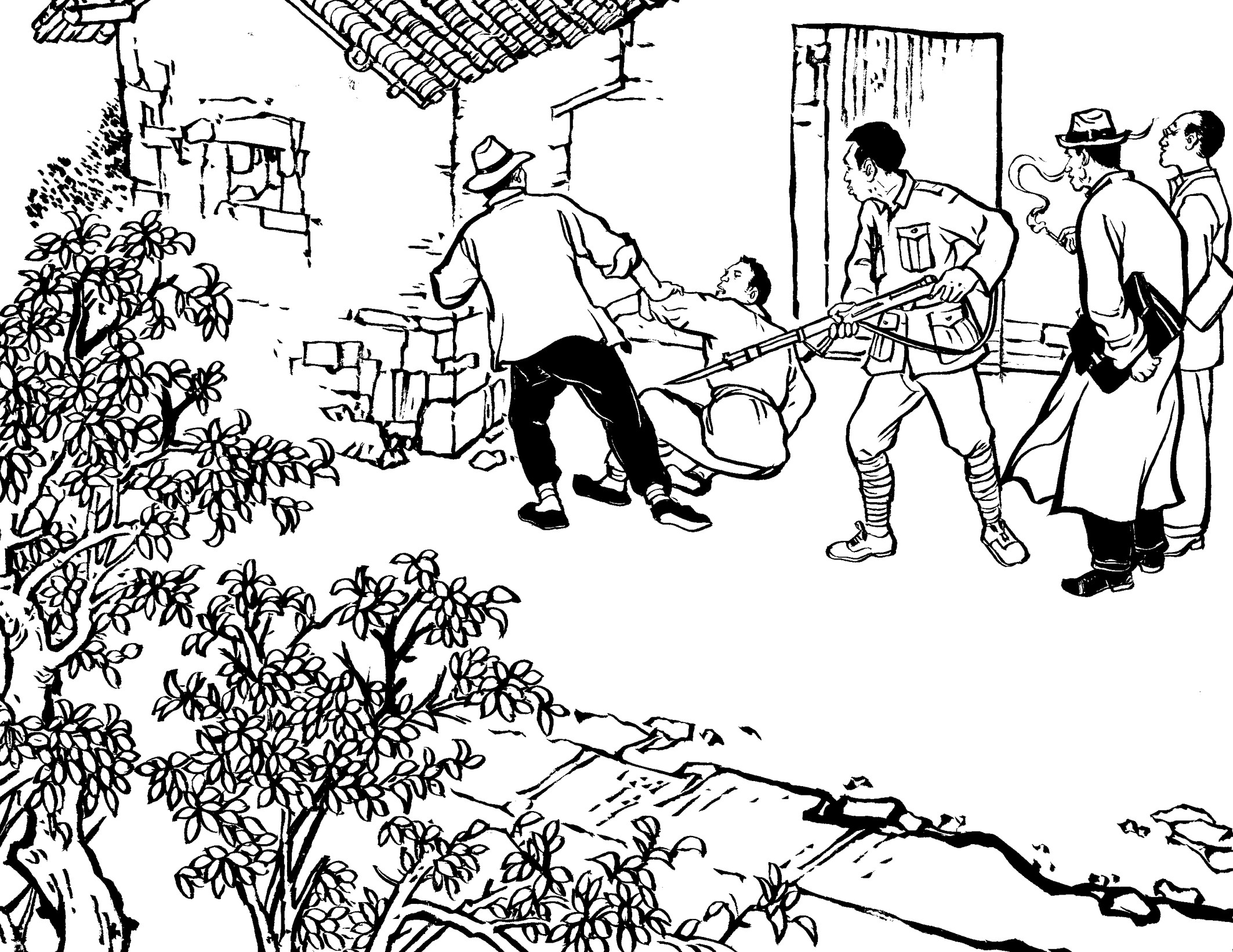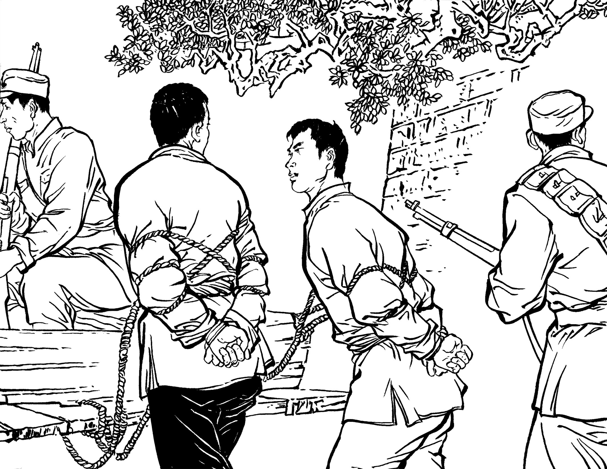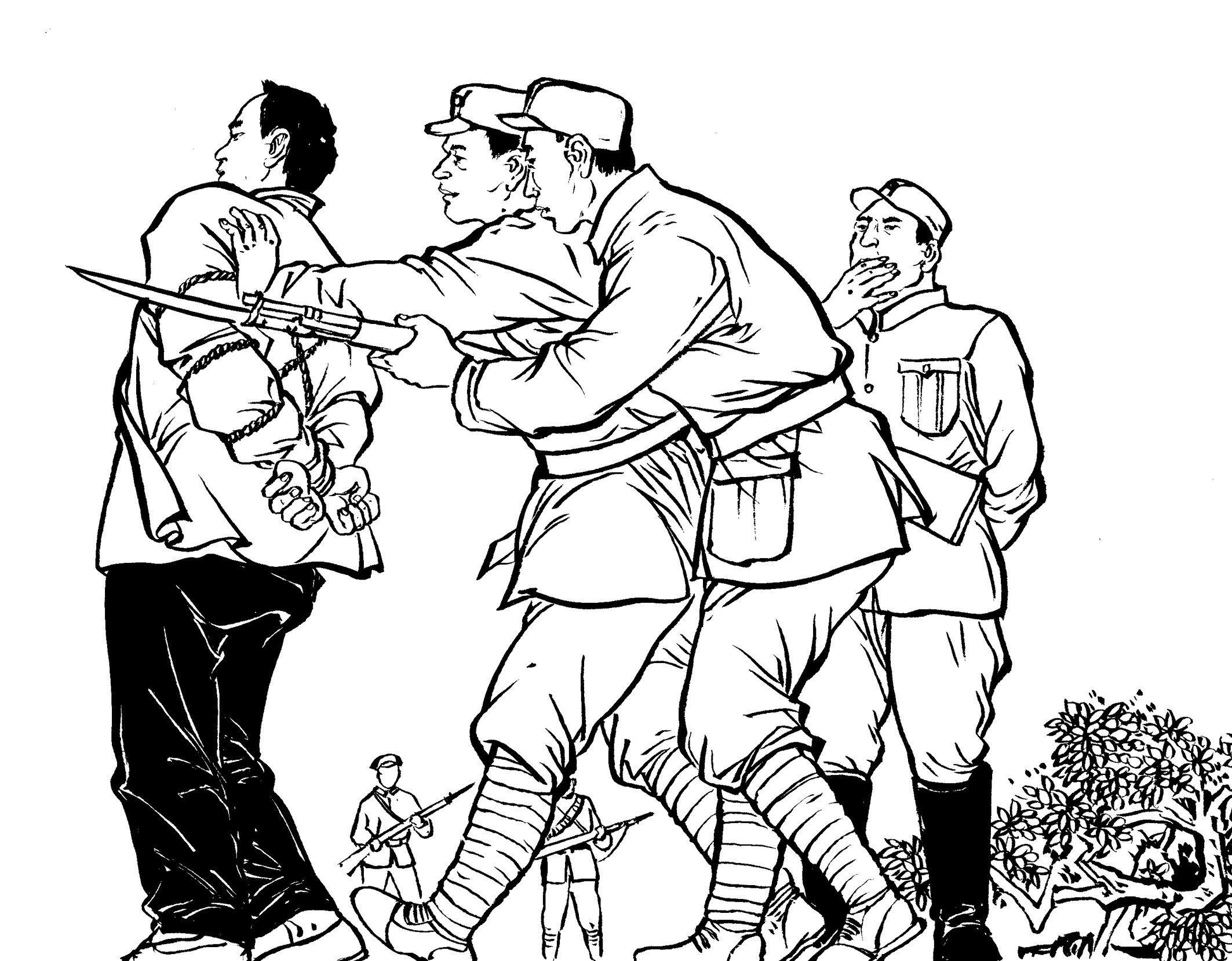 41. 国民党为了快速补充兵源,公开进村入户大量抓捕壮丁,只要看见十五六岁以上的男孩就强行带走。丧心病狂的国民党军队用粗绳捆绑,甚至用细细的铁线穿过壮丁肩膀的锁骨,像赶着一串牲口似的逼着壮丁们往前走。