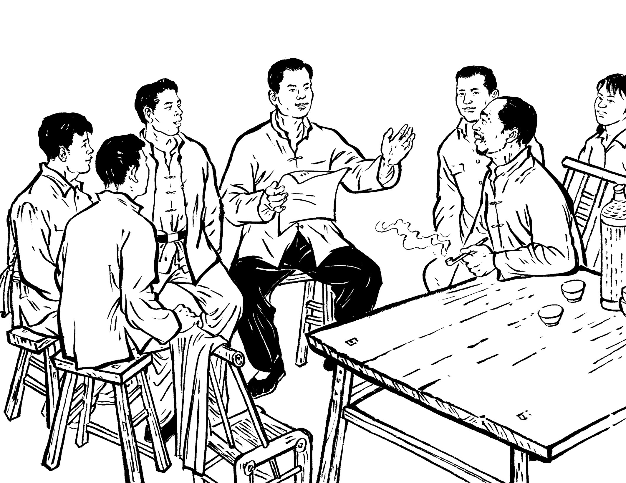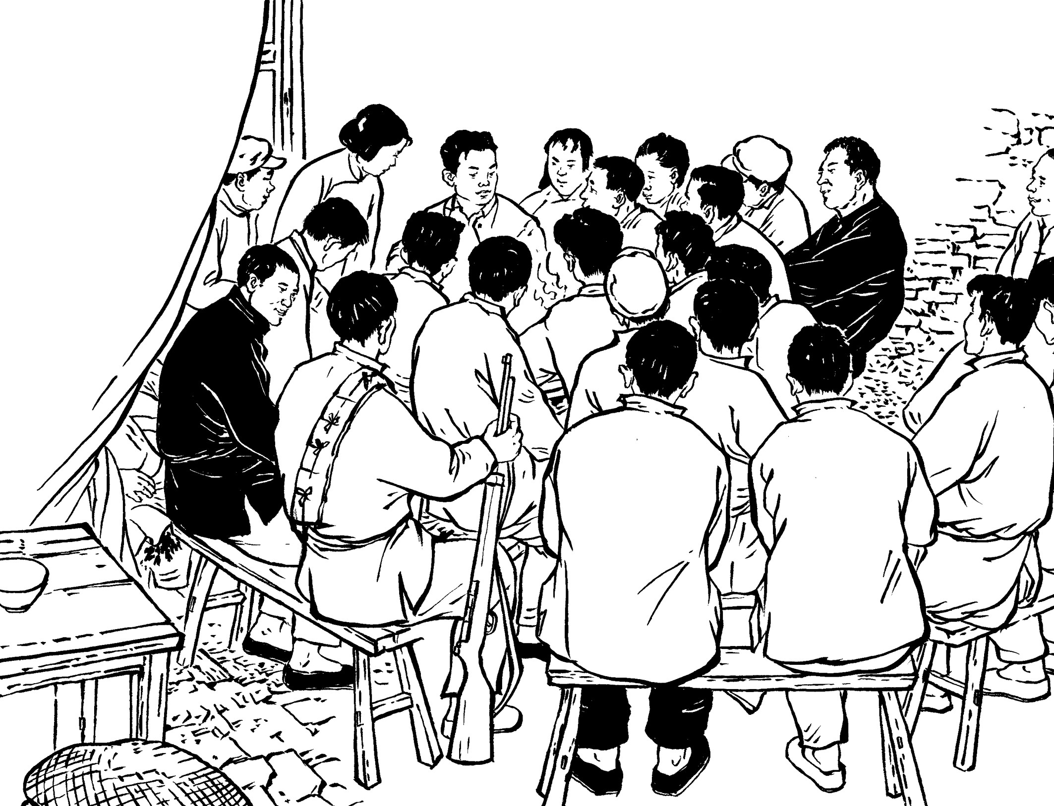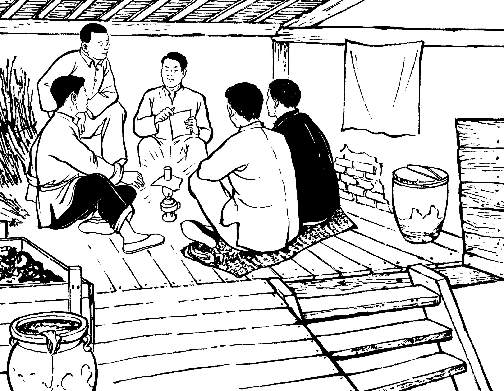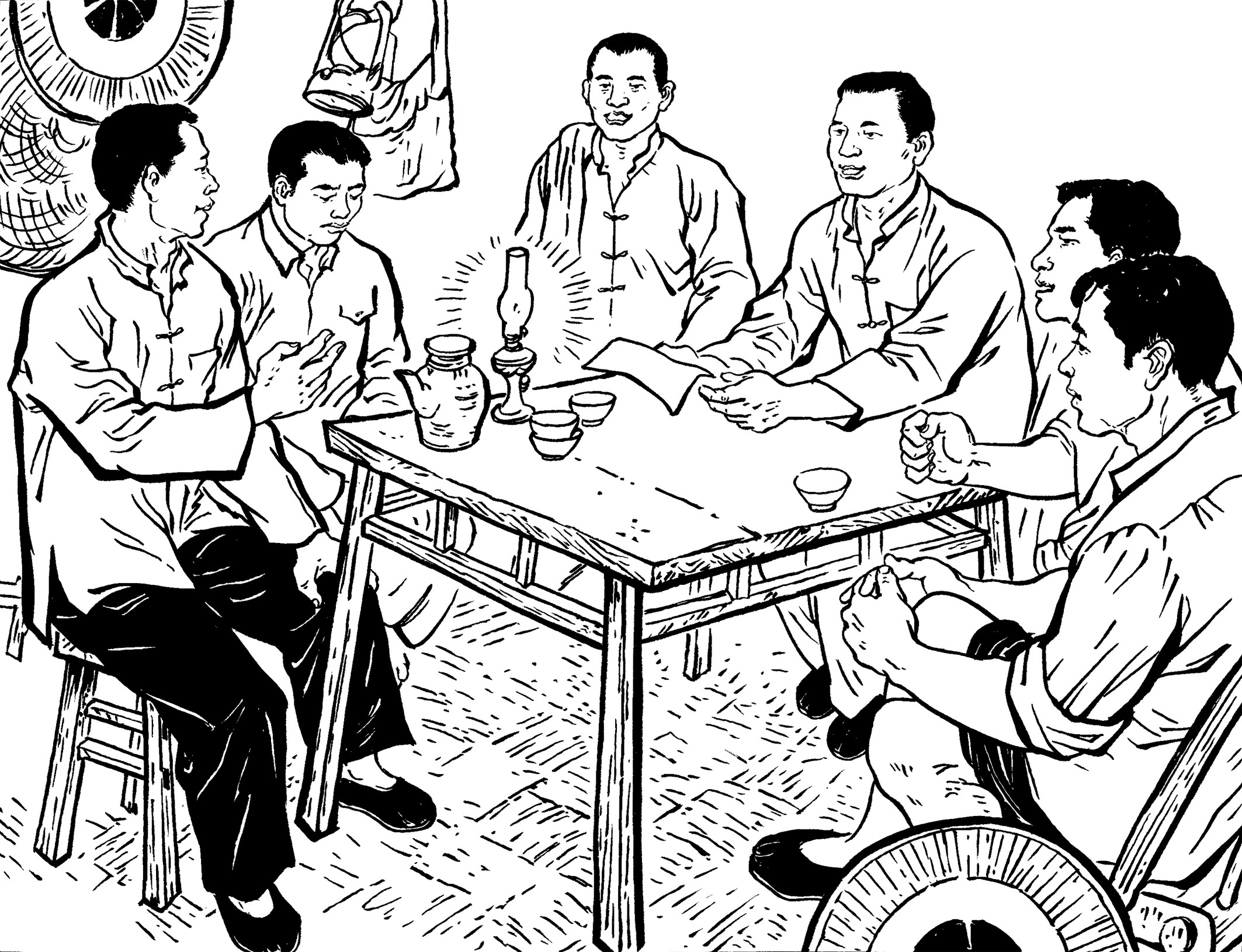 14. 地下党员经常装扮成牛贩、马贩到黄章约家做客,有时一起弹弦唱曲。山里人罕见乐器,清脆的弦声、悠扬的笛音、优美的南曲,吸引了喜好热闹的年轻人。他们扎堆谈天说地,外面新奇精彩的世界令人无限好奇和向往。