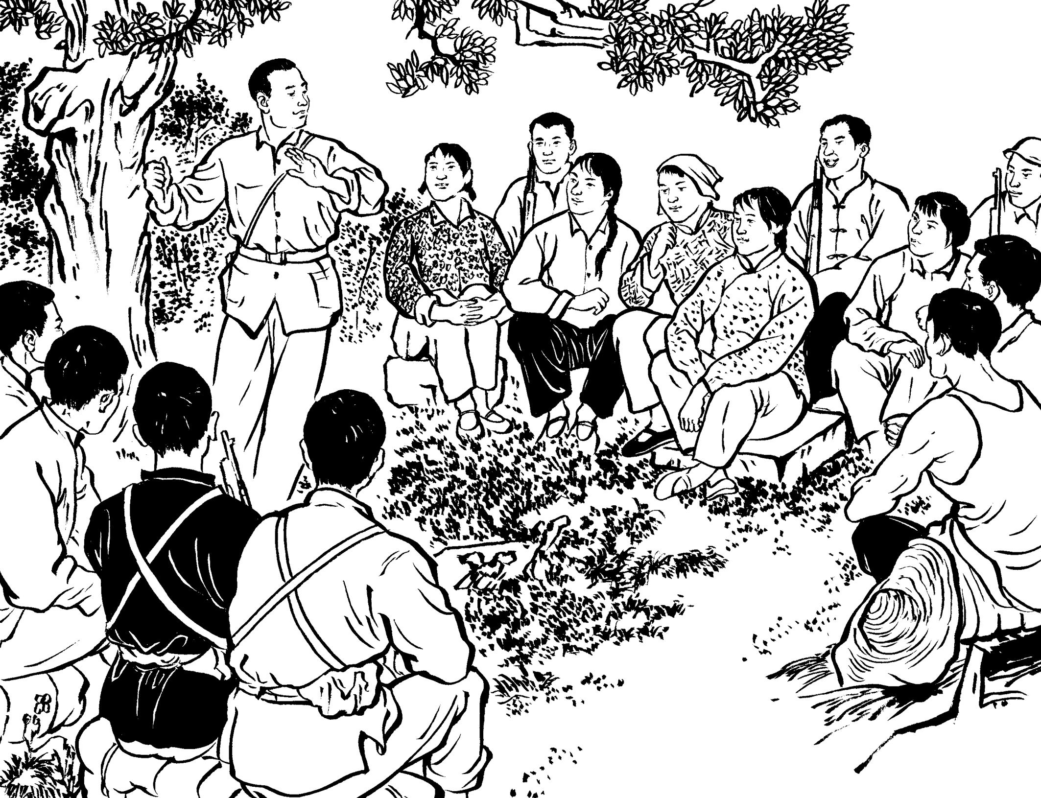 17. 空闲时间,他们经常聚在黄贡钟家门口,朝着对面山坡上的一棵大松树悬挂着的靶子进行射击训练。黄奕湾真是神枪手,10颗子弹都穿过同一个靶孔。陈网胆大心细,也练出一手好枪法。