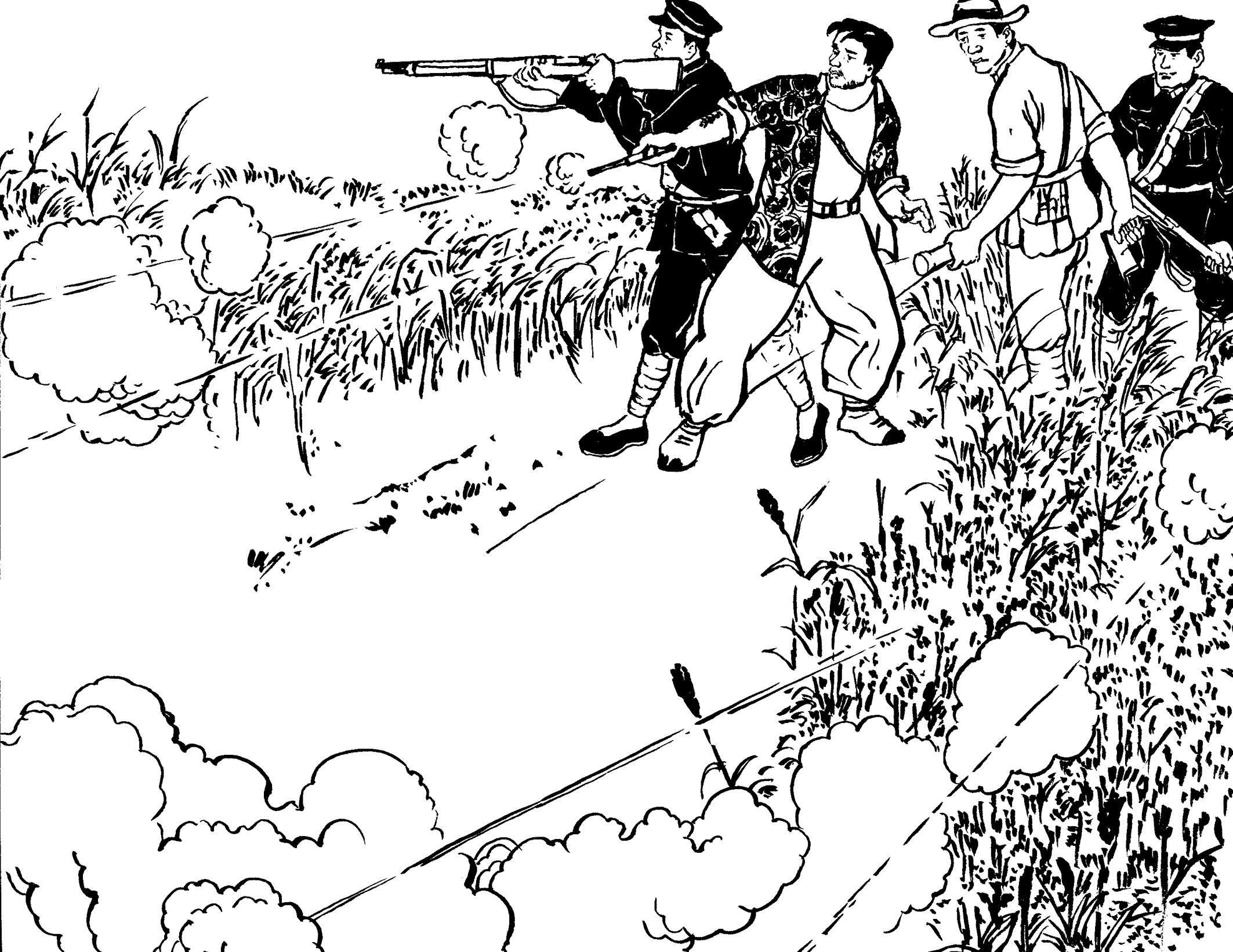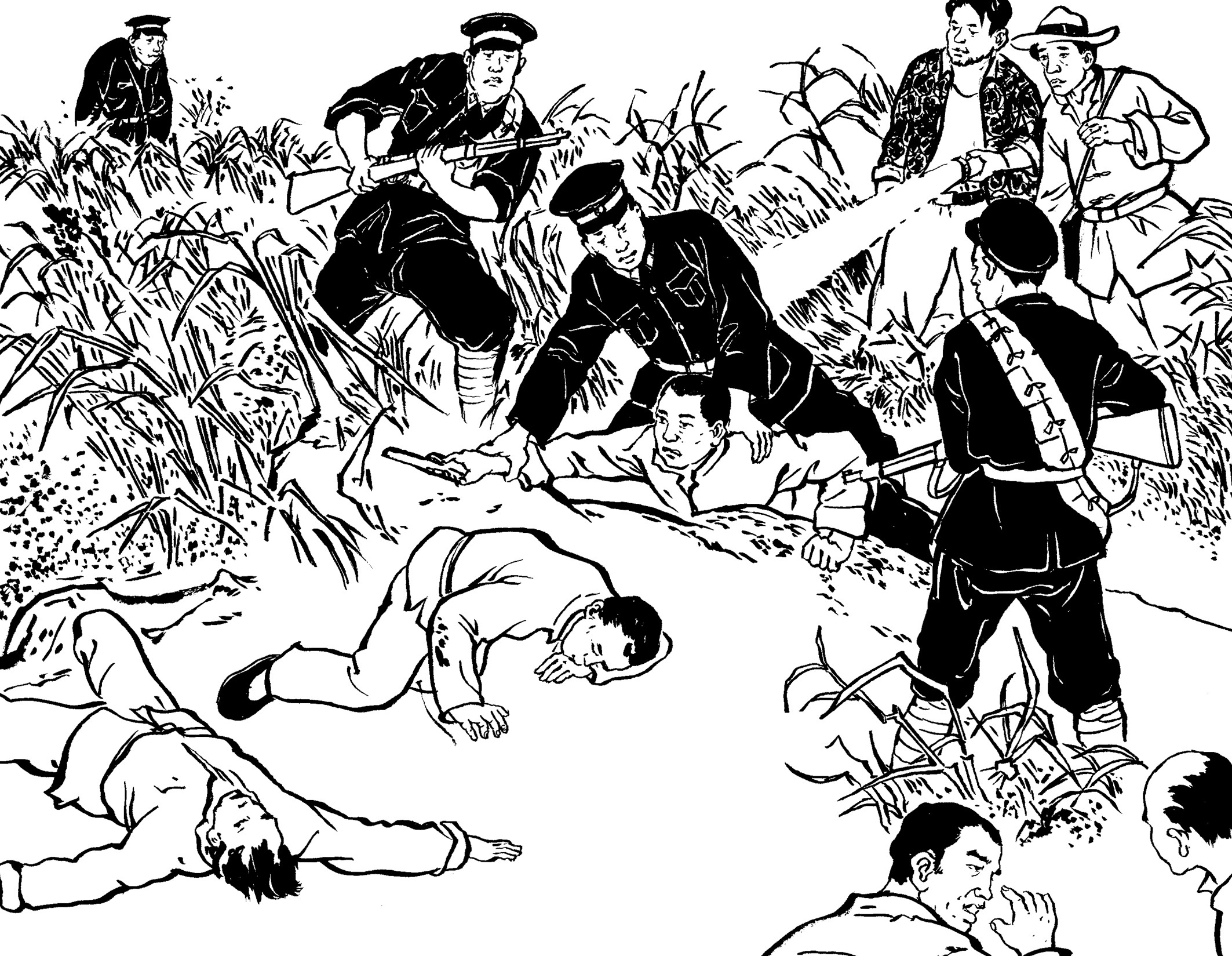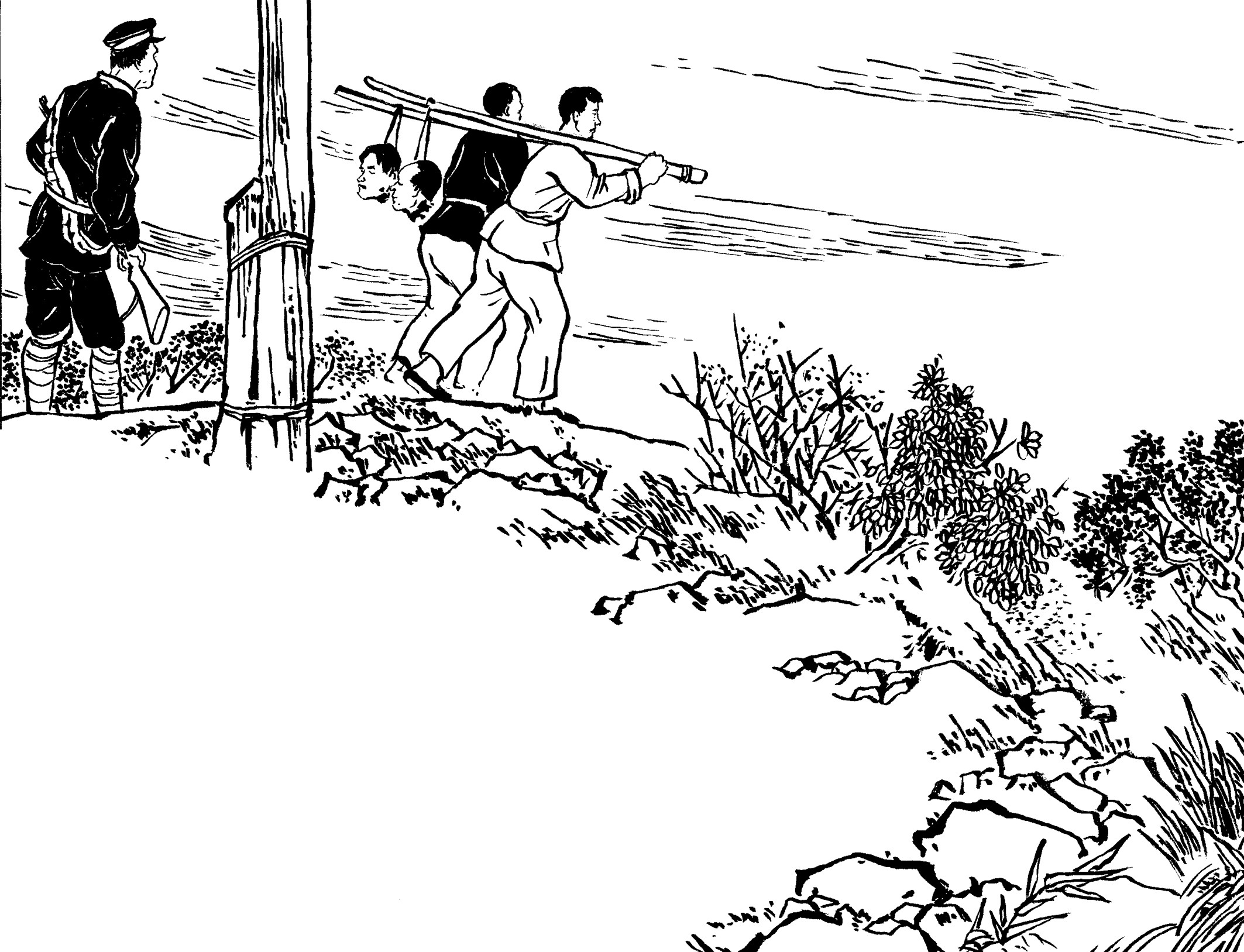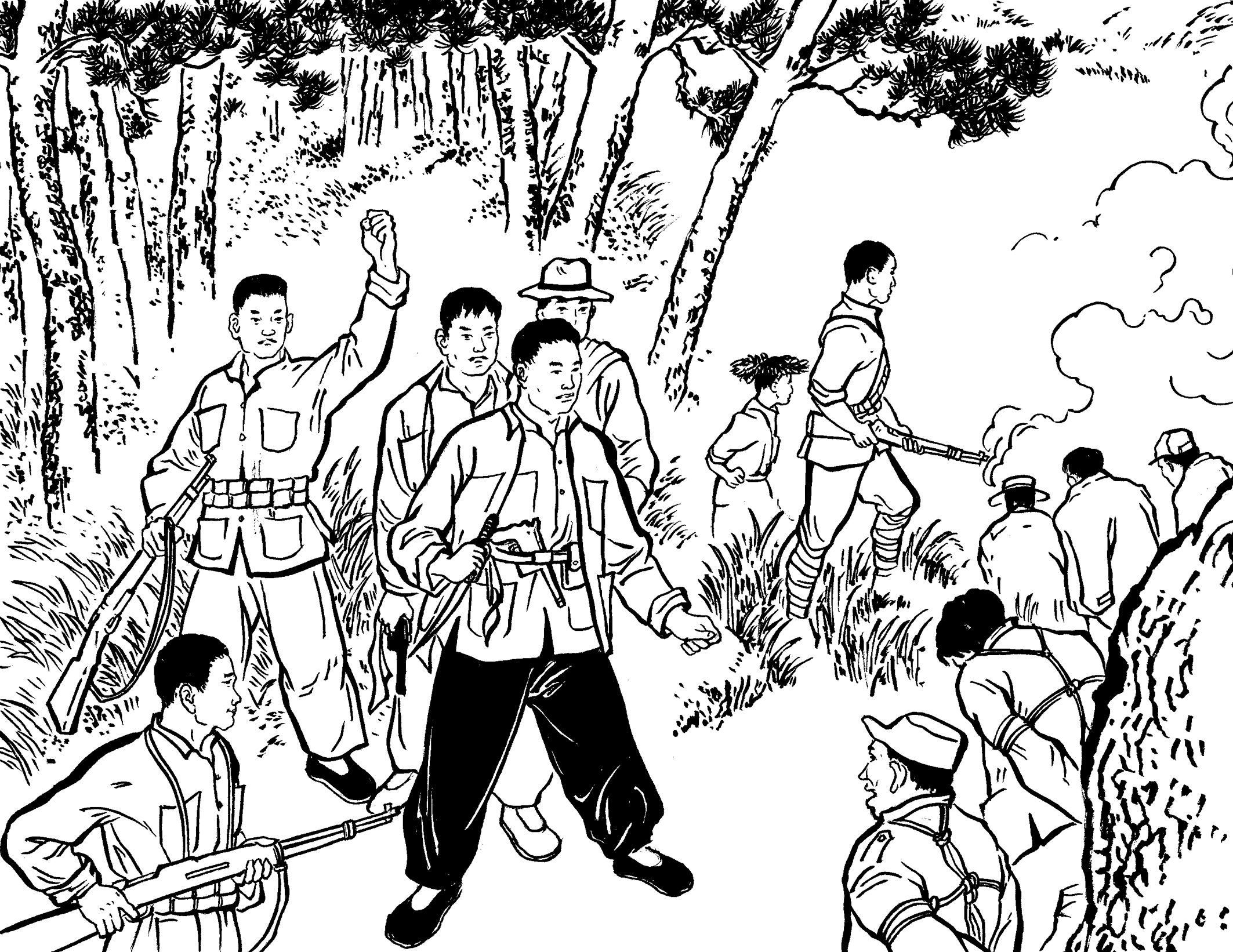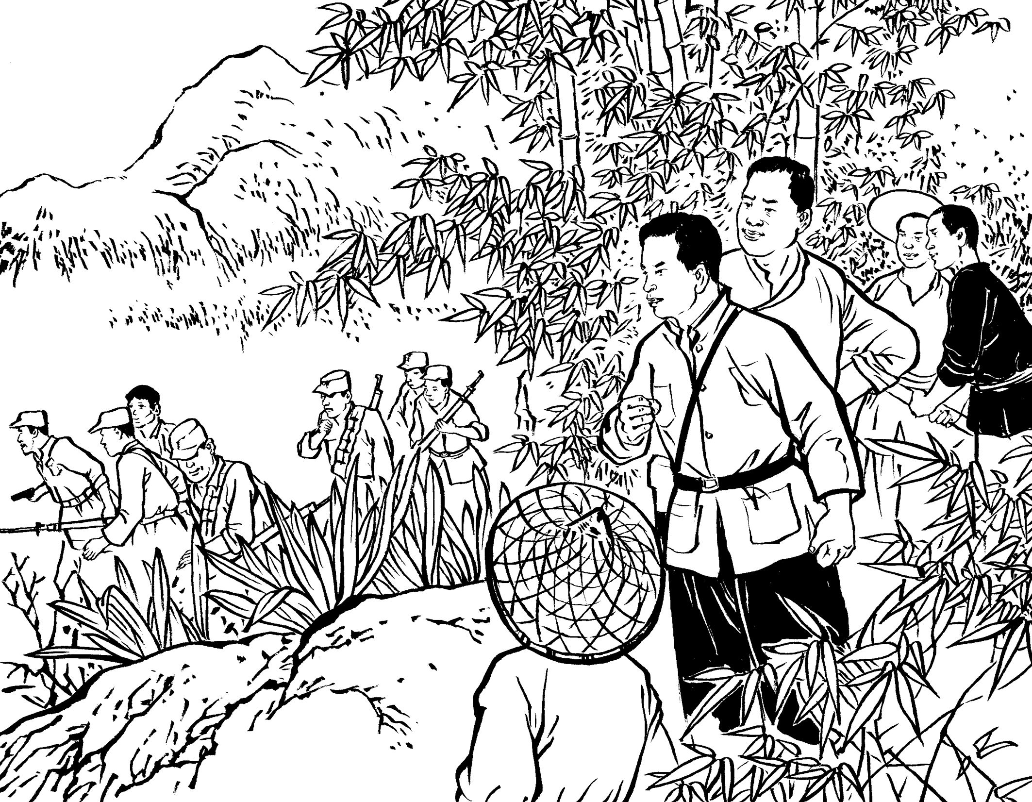 29. 壮汉们提前在草丛中放入捕兽夹,在小道上牵了绳子。国民党军警一进山,有的被绳子绊倒,有的脚被铁夹钳住了,有的当场被击毙,一下子失去了战斗力,剩下的17名士兵全部被抓起来,五花大绑地吊在大松树下拷打。